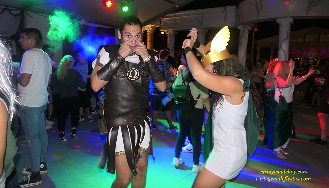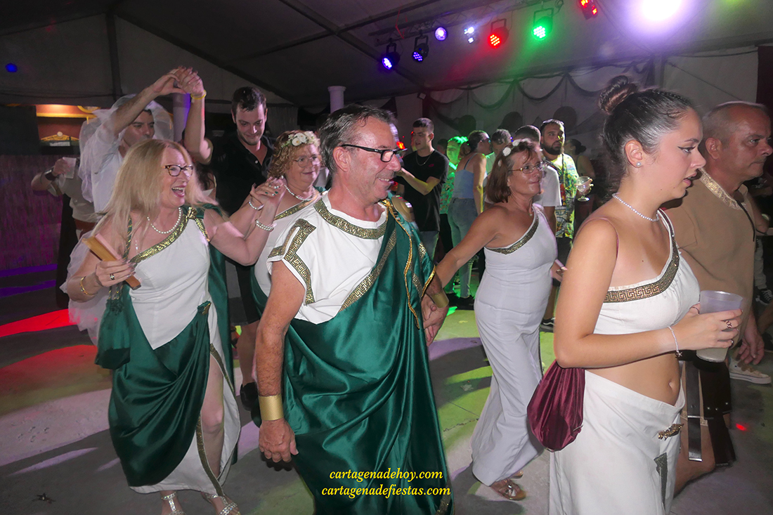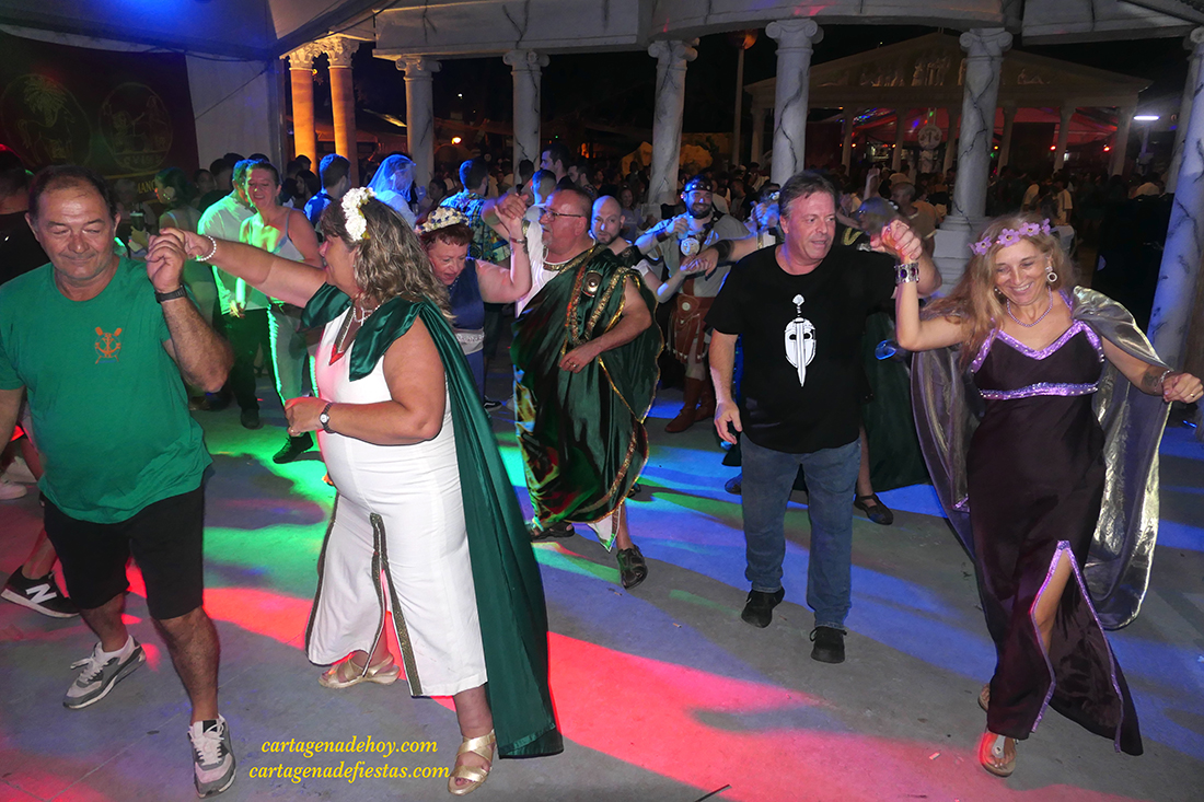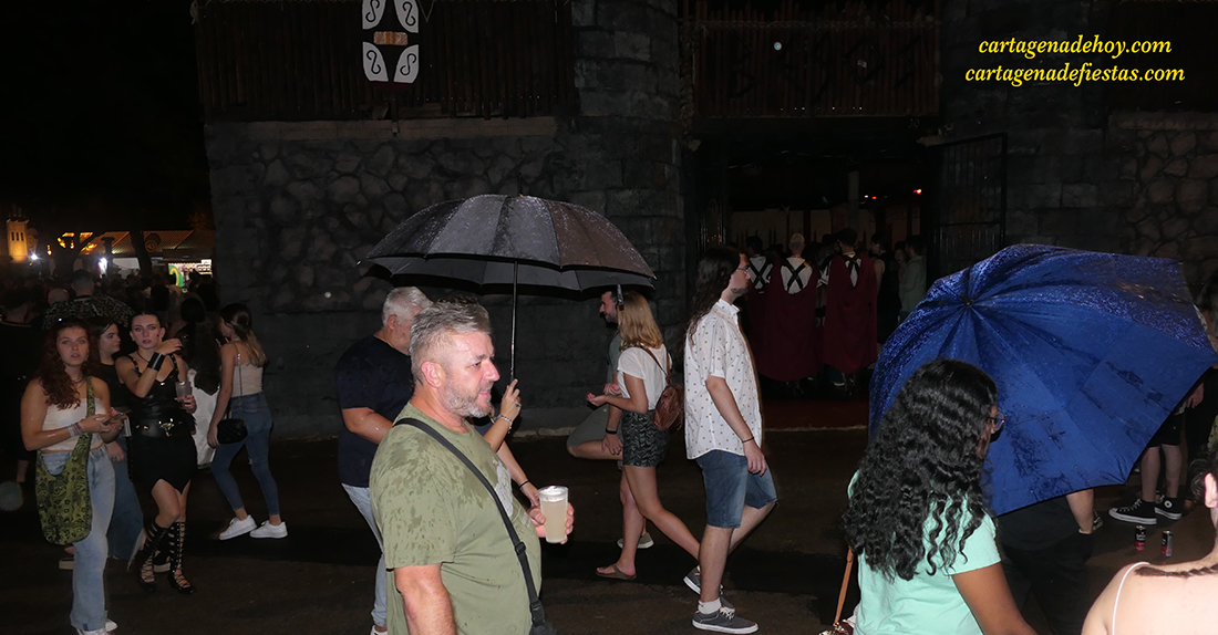 La lluvia ha estado de forma intermitente, y con distintas cantidad e intensidad, durante las últimas dos noches en el campamento de Carthagineses y Romanos, lo que generó la aparición de paraguas o buscar otros improvisados sistema de protección, como se observa en la foto a esta sacerdotisa de Baal-Hammon. Y al mal tiempo, bailes, como, por ejemplo, llevaron a cabo en Adoradores de Venus con la danza más festera.