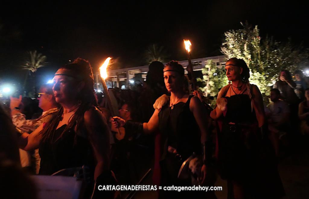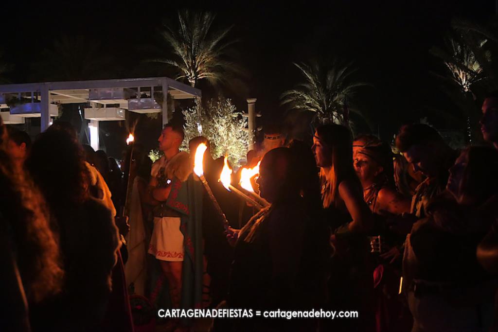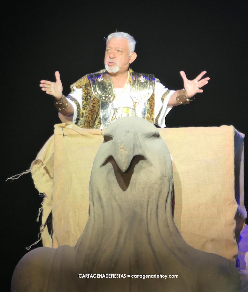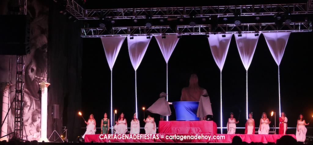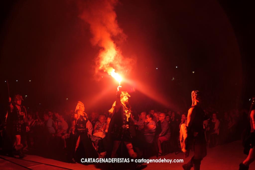 Otra novedad fue la danza en una gran copa de agua del dúo 'Crus Crus'. Tan maravillosa que cautivó a todos los presentes. También tenemos que referirnos a Amílcar Barca 'El Rayo', el papá de 'la camada del león', cuya aparición está vez tras el sonoro rayo es por encima de la cabeza del dios Baal, bajo un fuerte aroma a pólvora.