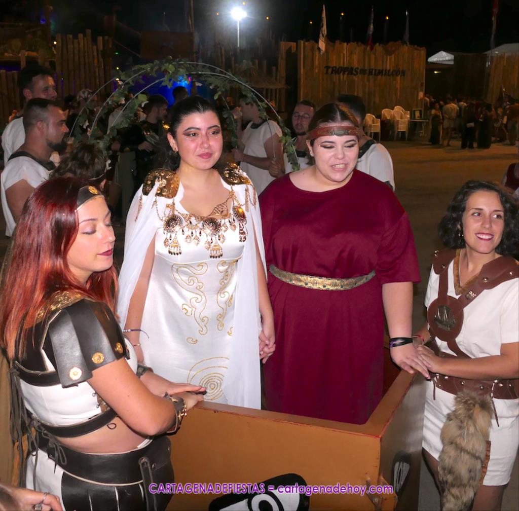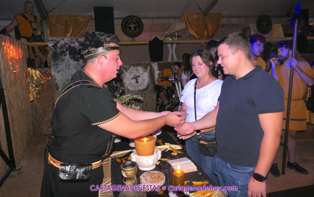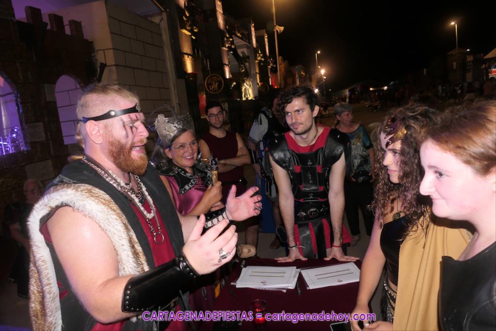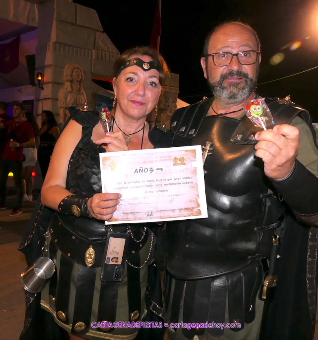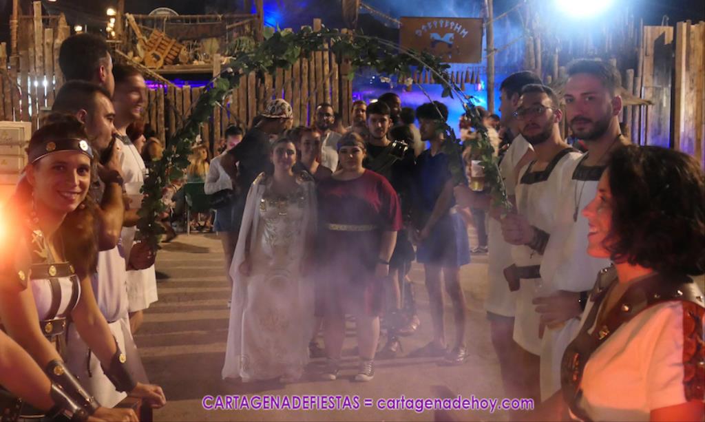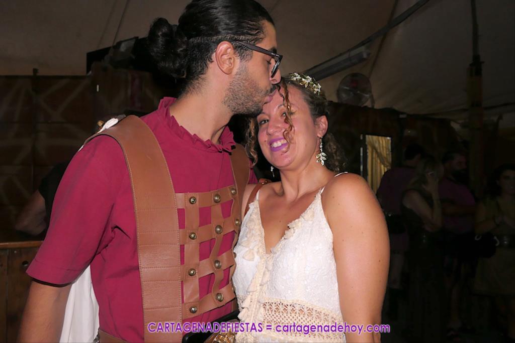 Lo de casarse siempre está de moda en la calle carthaginesa. Empezaron, hace muchas lunas, la tropa de Caballeros e Isis de Carthago (foto superior sobre estas líneas) representando los enlaces al rito púnico y desde la pasada década de este siglo XXIII se ha convertido en un acto de Consejo Carthaginés, siendo casi todos los recintos de la gran aldea los que habilitan esos enlaces de todo tipo, chico-chica, chico-chico, chica-chica, tríos, cuarteros... y lo que se presente. Eso sí, casi todos con solemnidad, como merece un 'sí quiero' de época. Las manos se unen con una cuerda, se vierte sal, se bendice con ramas de romeros, unos toman chupitos, otros cruzan un arco de ramas, los hay que colocan velos, también ponen casos... Es el amor en la calle carthaginesa con festeros de ambos bandos y muchos visitantes en un lunes noche ideal, pues es de las jornadas en la que el campamento no es una macrodiscoteca y se puede disfrutar de la ciudadela de época y de sus moradores.