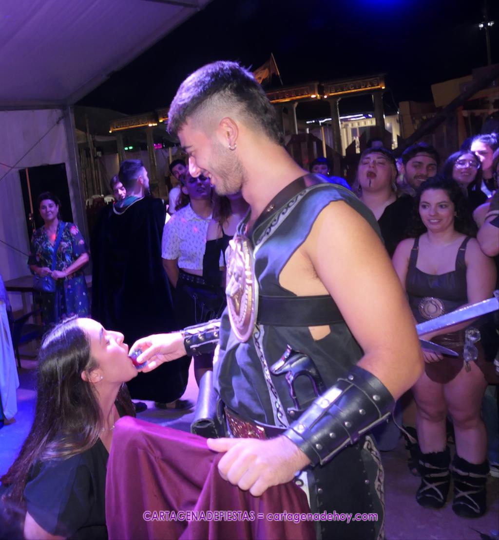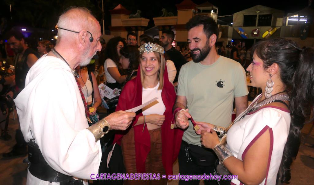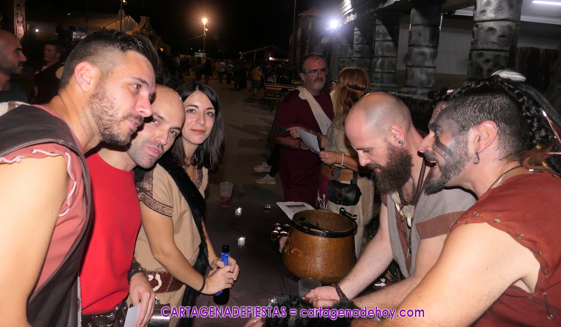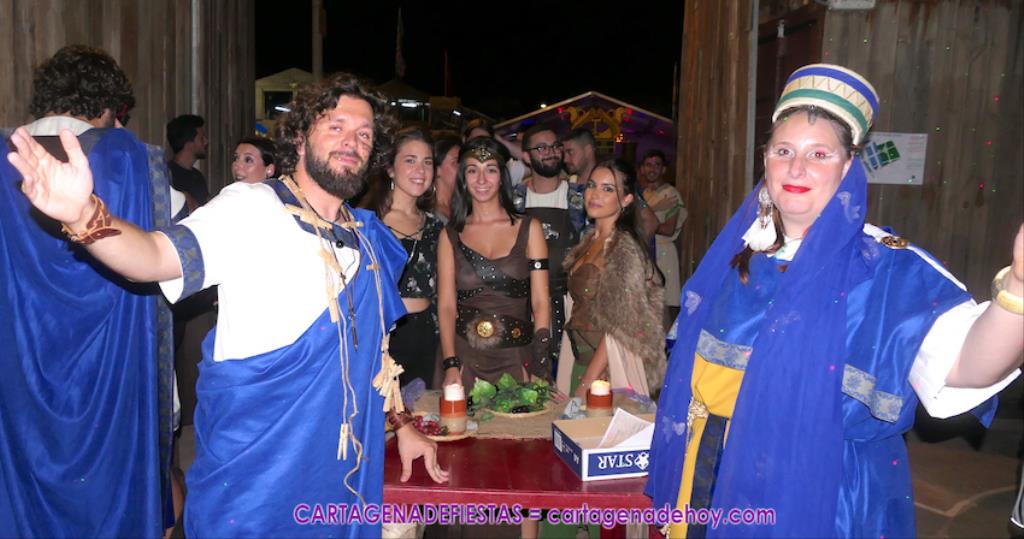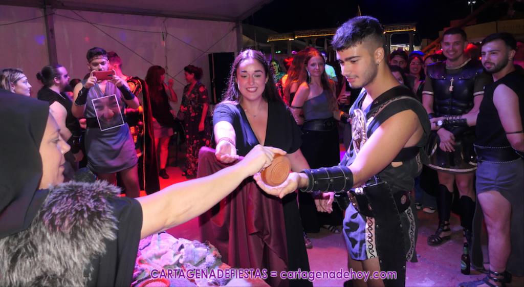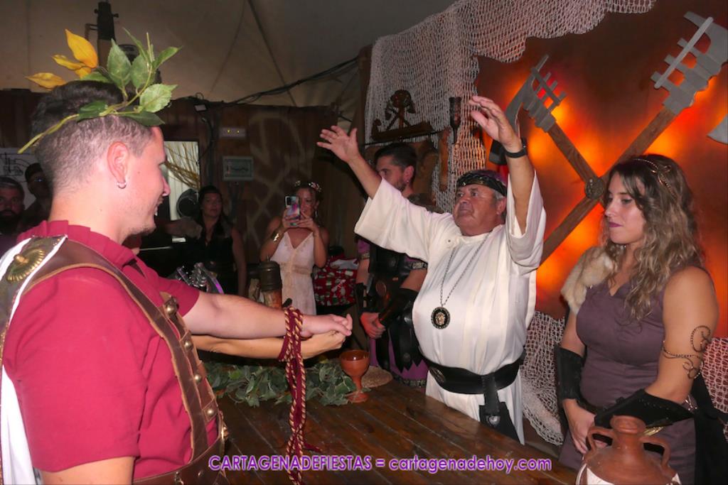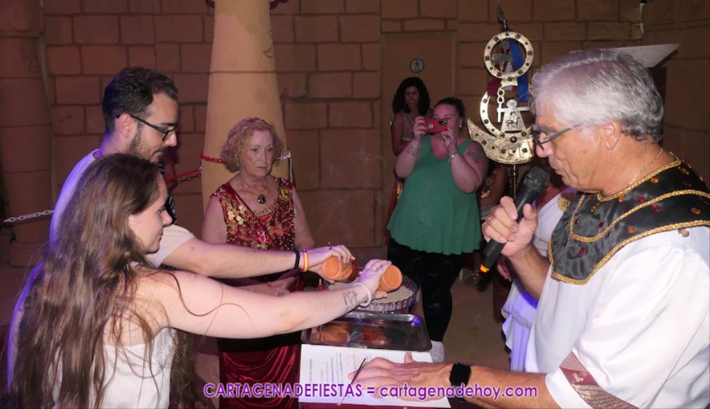 Lo de casarse siempre está de moda en la calle carthaginesa. Empezaron, hace muchas lunas, la tropa de Caballeros e Isis de Carthago (foto superior sobre estas líneas) representando los enlaces al rito púnico y desde la pasada década de este siglo XXIII se ha convertido en un acto de Consejo Carthaginés, siendo casi todos los recintos de la gran aldea los que habilitan esos enlaces de todo tipo, chico-chica, chico-chico, chica-chica, tríos, cuarteros... y lo que se presente. Eso sí, casi todos con solemnidad, como merece un 'sí quiero' de época. Las manos se unen con una cuerda, se vierte sal, se bendice con ramas de romeros, unos toman chupitos, otros cruzan un arco de ramas, los hay que colocan velos, también ponen casos... Es el amor en la calle carthaginesa con festeros de ambos bandos y muchos visitantes en un lunes noche ideal, pues es de las jornadas en la que el campamento no es una macrodiscoteca y se puede disfrutar de la ciudadela de época y de sus moradores.