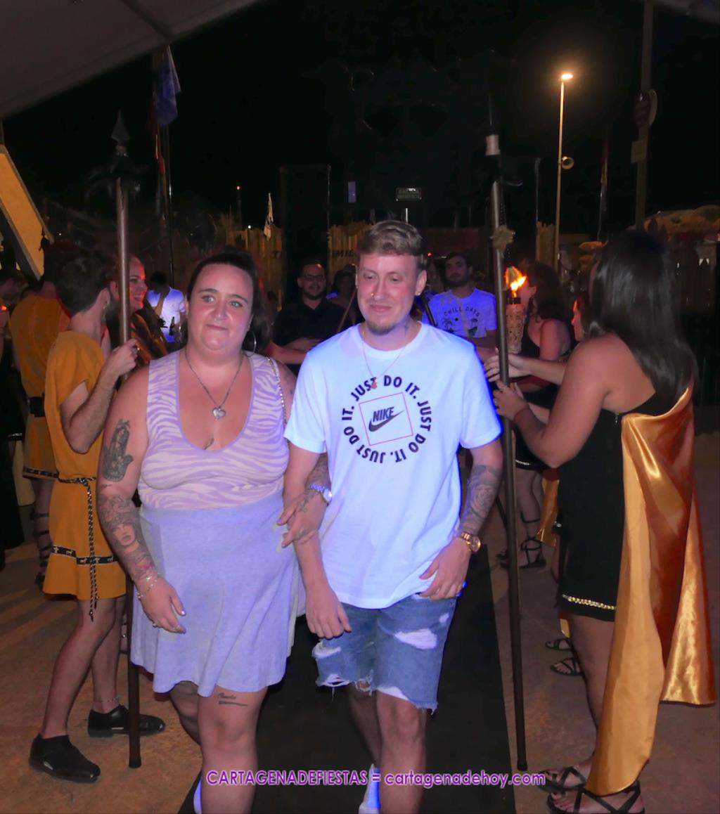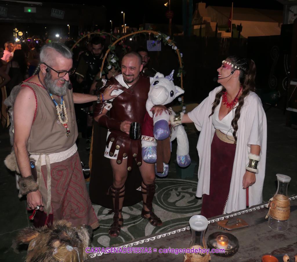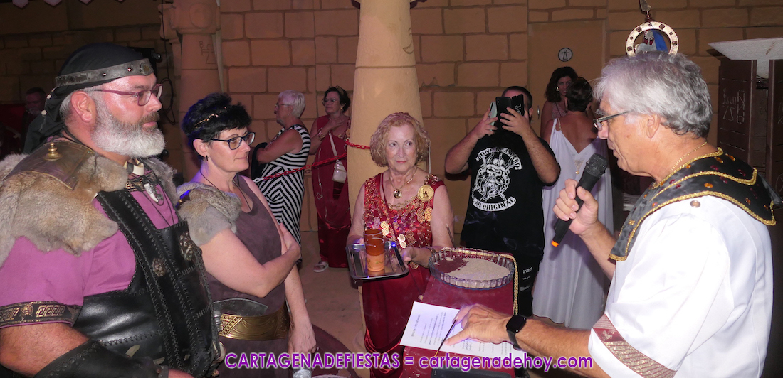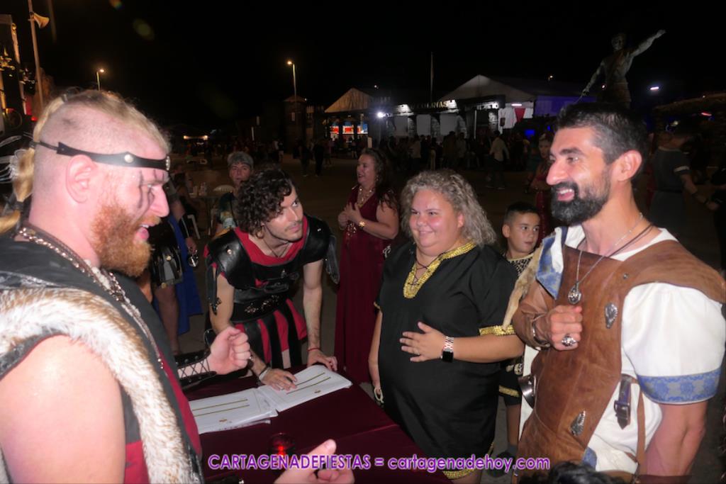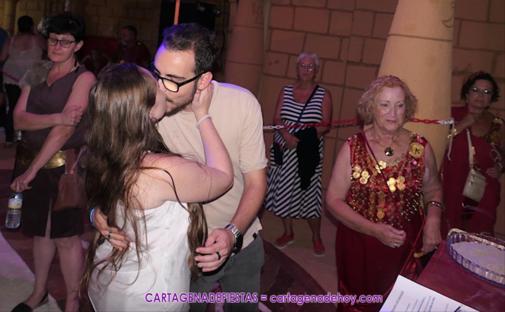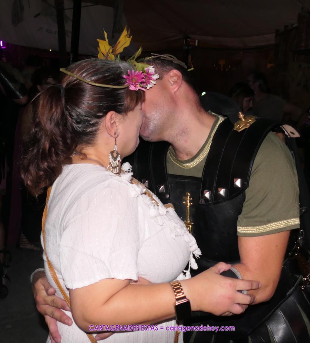 Lo de casarse siempre está de moda en la calle carthaginesa. Empezaron, hace muchas lunas, la tropa de Caballeros e Isis de Carthago (foto superior sobre estas líneas) representando los enlaces al rito púnico y desde la pasada década de este siglo XXIII se ha convertido en un acto de Consejo Carthaginés, siendo casi todos los recintos de la gran aldea los que habilitan esos enlaces de todo tipo, chico-chica, chico-chico, chica-chica, tríos, cuarteros... y lo que se presente. Eso sí, casi todos con solemnidad, como merece un 'sí quiero' de época. Las manos se unen con una cuerda, se vierte sal, se bendice con ramas de romeros, unos toman chupitos, otros cruzan un arco de ramas, los hay que colocan velos, también ponen casos... Es el amor en la calle carthaginesa con festeros de ambos bandos y muchos visitantes en un lunes noche ideal, pues es de las jornadas en la que el campamento no es una macrodiscoteca y se puede disfrutar de la ciudadela de época y de sus moradores.