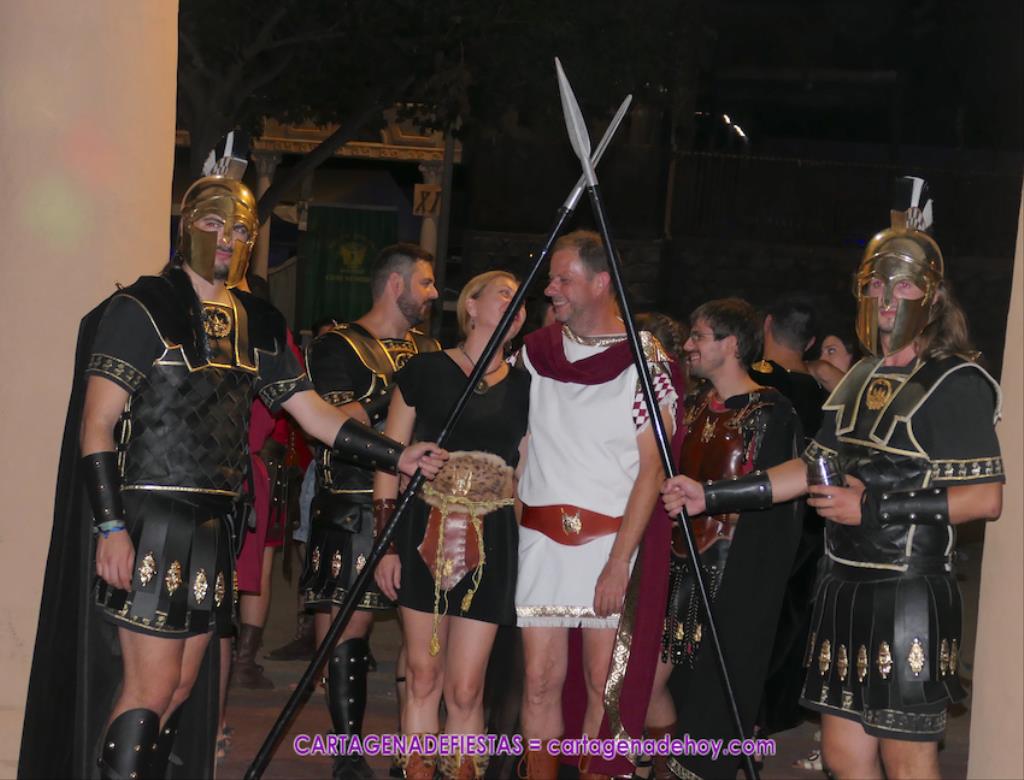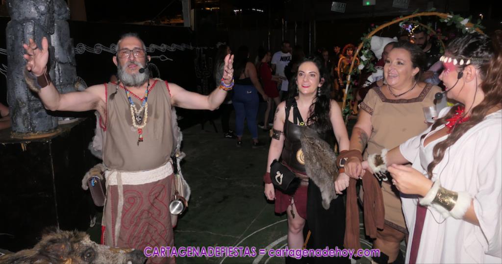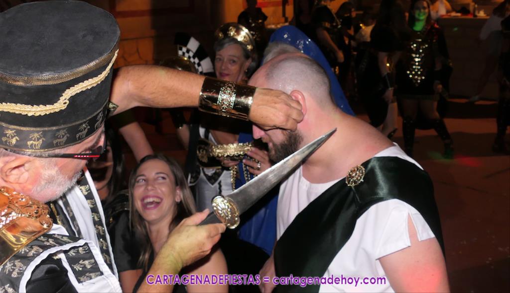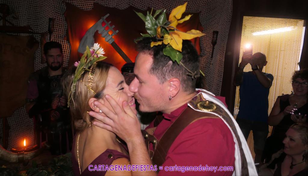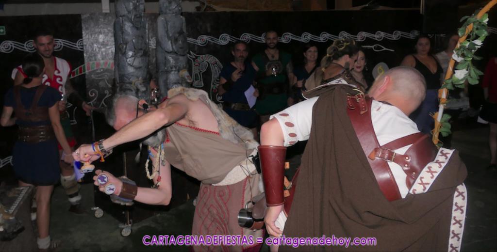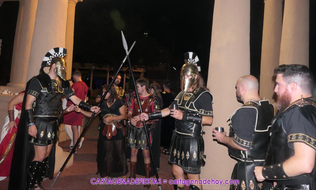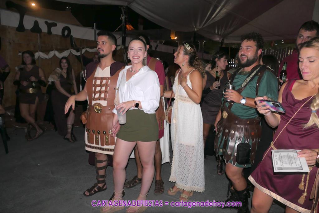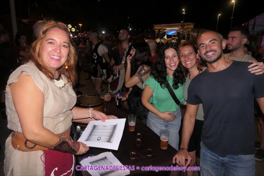 Lo de casarse siempre está de moda en la calle carthaginesa. Empezaron, hace muchas lunas, la tropa de Caballeros e Isis de Carthago (foto superior sobre estas líneas) representando los enlaces al rito púnico y desde la pasada década de este siglo XXIII se ha convertido en un acto de Consejo Carthaginés, siendo casi todos los recintos de la gran aldea los que habilitan esos enlaces de todo tipo, chico-chica, chico-chico, chica-chica, tríos, cuarteros... y lo que se presente. Eso sí, casi todos con solemnidad, como merece un 'sí quiero' de época. Las manos se unen con una cuerda, se vierte sal, se bendice con ramas de romeros, unos toman chupitos, otros cruzan un arco de ramas, los hay que colocan velos, también ponen casos... Es el amor en la calle carthaginesa con festeros de ambos bandos y muchos visitantes en un lunes noche ideal, pues es de las jornadas en la que el campamento no es una macrodiscoteca y se puede disfrutar de la ciudadela de época y de sus moradores.