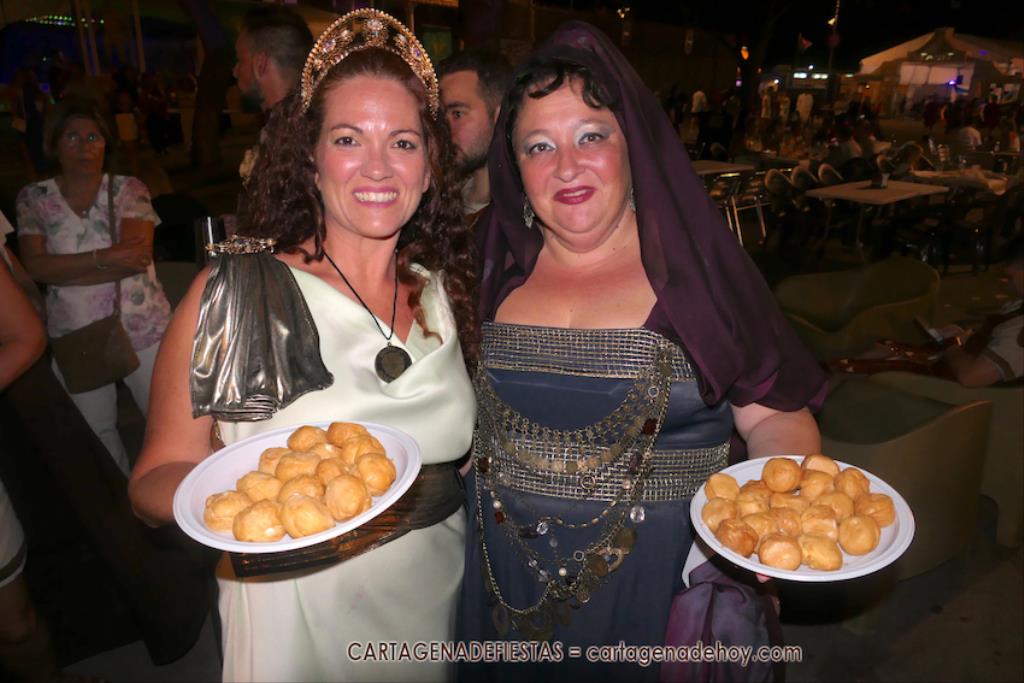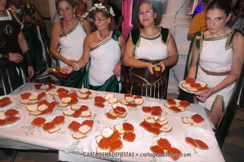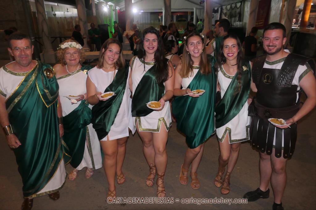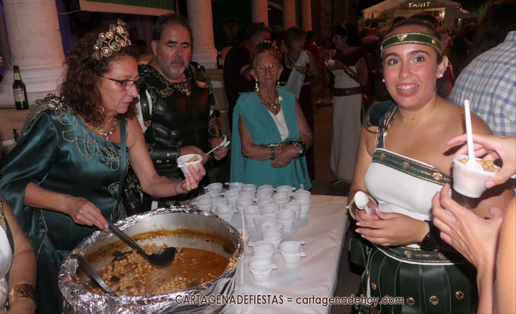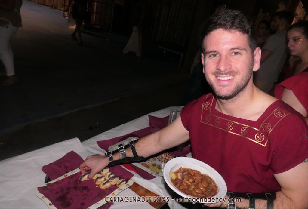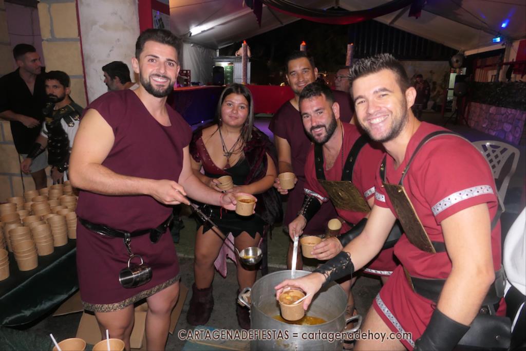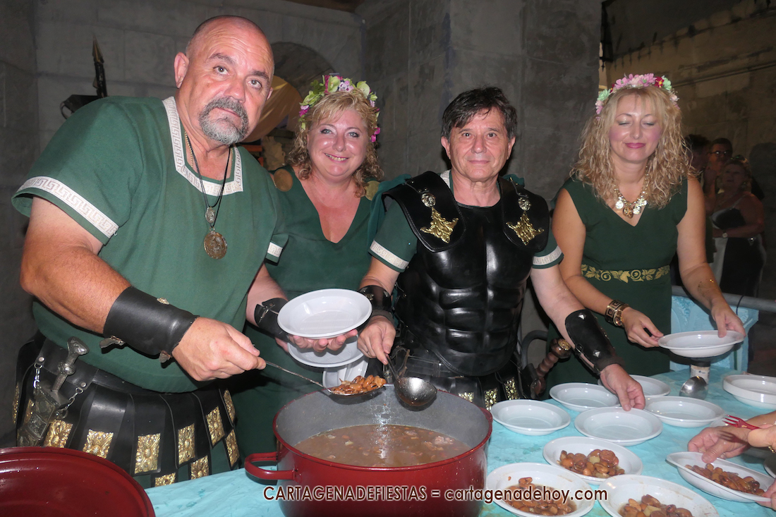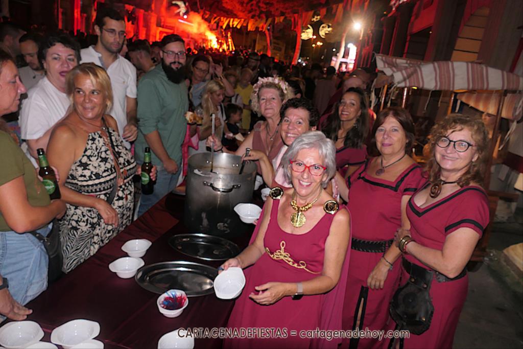 Bullas con musu, caldo con pelotas, pan preñao, aceitunas, saladitos variados, frutos secos, pan con sobrasada, chorizos a la sidra, ‘pichicas’, sopa con ajo, michirones, sangre carthaginesa, tostadas de queso, morcillas, ensalada de beicon, fuá y queso con mermelada, callos, tortilla, vino… Menudo menú para cenar en la calle romana de Carthagineses y Romanos. Fueron casi todos los productos que (casi) todas las legiones obsequiaron a festeros y visitantes, en una edición en la que no ha habido ayuda extra y el gasto ha salido íntegrante del pecunio de cada grupo. La novedad estuvo en la Legio II Navalis. Volvieron a distribuir su pócima ‘Oleaje’, utilizando los escudos como bandejas, pero en el asunto del condumio aparcaron los tradicionales caracoles para repartir ‘marineras’, con lo que este menú de época ya tiene un sabor surgido de esta tierra y su mar. Por cierto, ¿hubo postre? La respuesta es afirmativa y estaba en los profiteroles de la Legion IV.