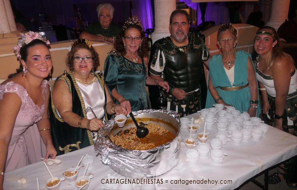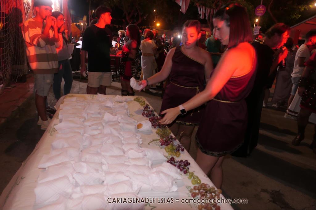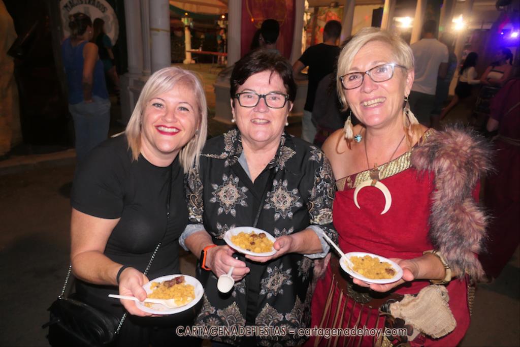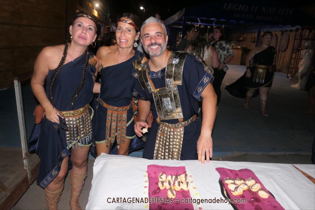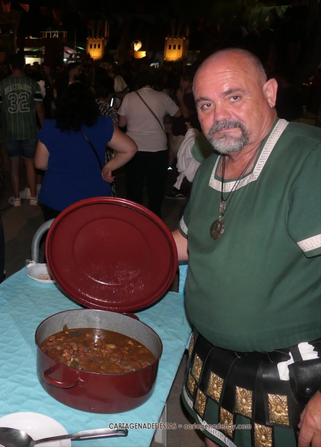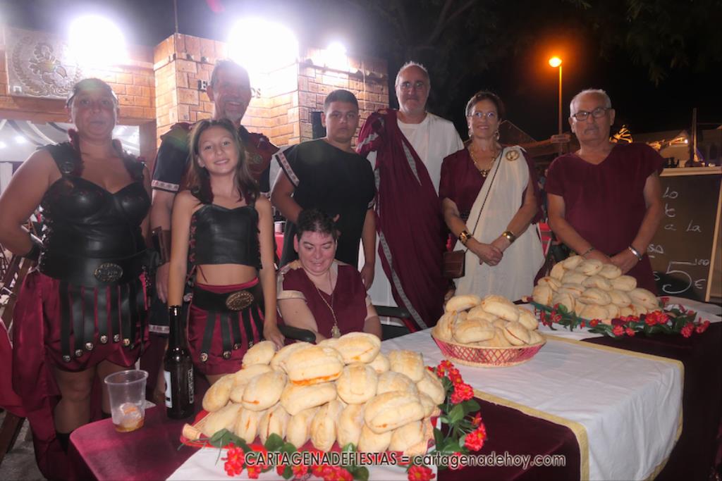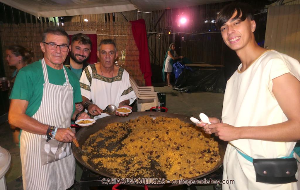 Bullas con musu, caldo con pelotas, pan preñao, aceitunas, saladitos variados, frutos secos, pan con sobrasada, chorizos a la sidra, ‘pichicas’, sopa con ajo, michirones, sangre carthaginesa, tostadas de queso, morcillas, ensalada de beicon, fuá y queso con mermelada, callos, tortilla, vino… Menudo menú para cenar en la calle romana de Carthagineses y Romanos. Fueron casi todos los productos que (casi) todas las legiones obsequiaron a festeros y visitantes, en una edición en la que no ha habido ayuda extra y el gasto ha salido íntegrante del pecunio de cada grupo. La novedad estuvo en la Legio II Navalis. Volvieron a distribuir su pócima ‘Oleaje’, utilizando los escudos como bandejas, pero en el asunto del condumio aparcaron los tradicionales caracoles para repartir ‘marineras’, con lo que este menú de época ya tiene un sabor surgido de esta tierra y su mar. Por cierto, ¿hubo postre? La respuesta es afirmativa y estaba en los profiteroles de la Legion IV.