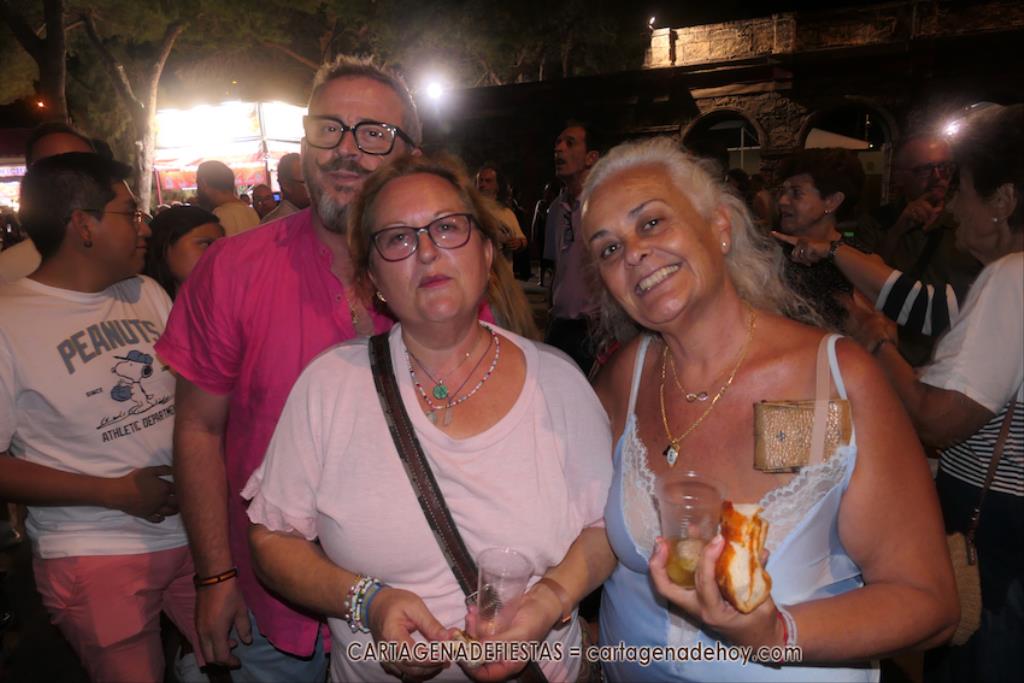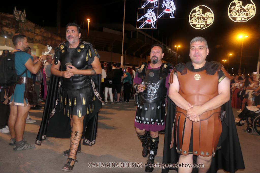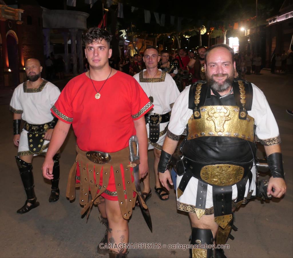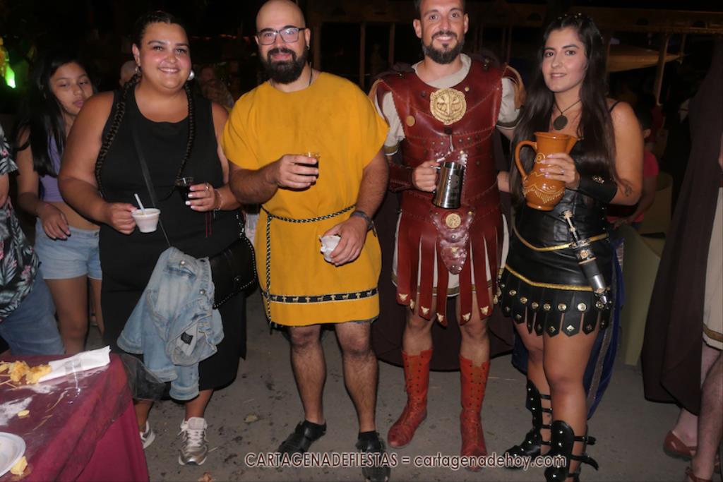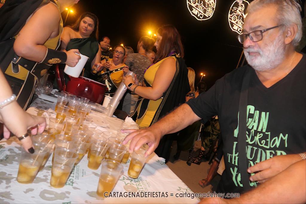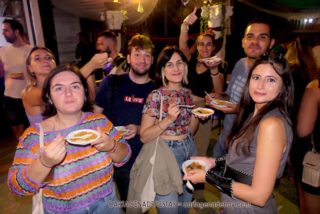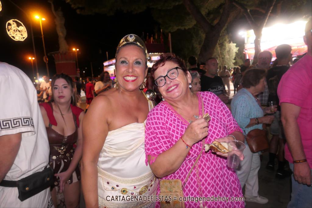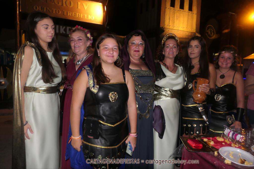 Bullas con musu, caldo con pelotas, pan preñao, aceitunas, saladitos variados, frutos secos, pan con sobrasada, chorizos a la sidra, ‘pichicas’, sopa con ajo, michirones, sangre carthaginesa, tostadas de queso, morcillas, ensalada de beicon, fuá y queso con mermelada, callos, tortilla, vino… Menudo menú para cenar en la calle romana de Carthagineses y Romanos. Fueron casi todos los productos que (casi) todas las legiones obsequiaron a festeros y visitantes, en una edición en la que no ha habido ayuda extra y el gasto ha salido íntegrante del pecunio de cada grupo. La novedad estuvo en la Legio II Navalis. Volvieron a distribuir su pócima ‘Oleaje’, utilizando los escudos como bandejas, pero en el asunto del condumio aparcaron los tradicionales caracoles para repartir ‘marineras’, con lo que este menú de época ya tiene un sabor surgido de esta tierra y su mar. Por cierto, ¿hubo postre? La respuesta es afirmativa y estaba en los profiteroles de la Legion IV.