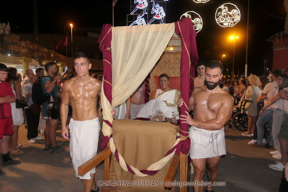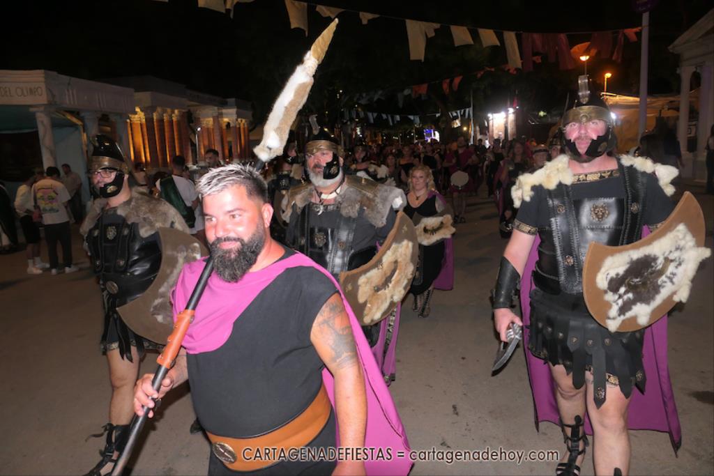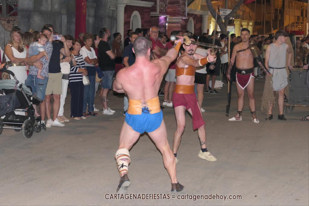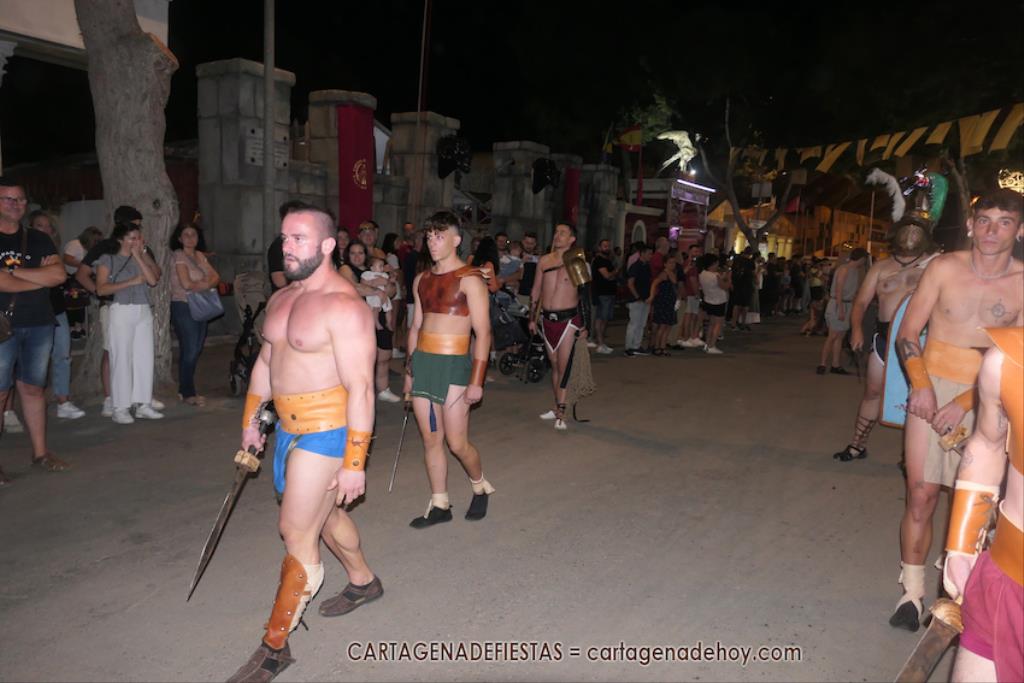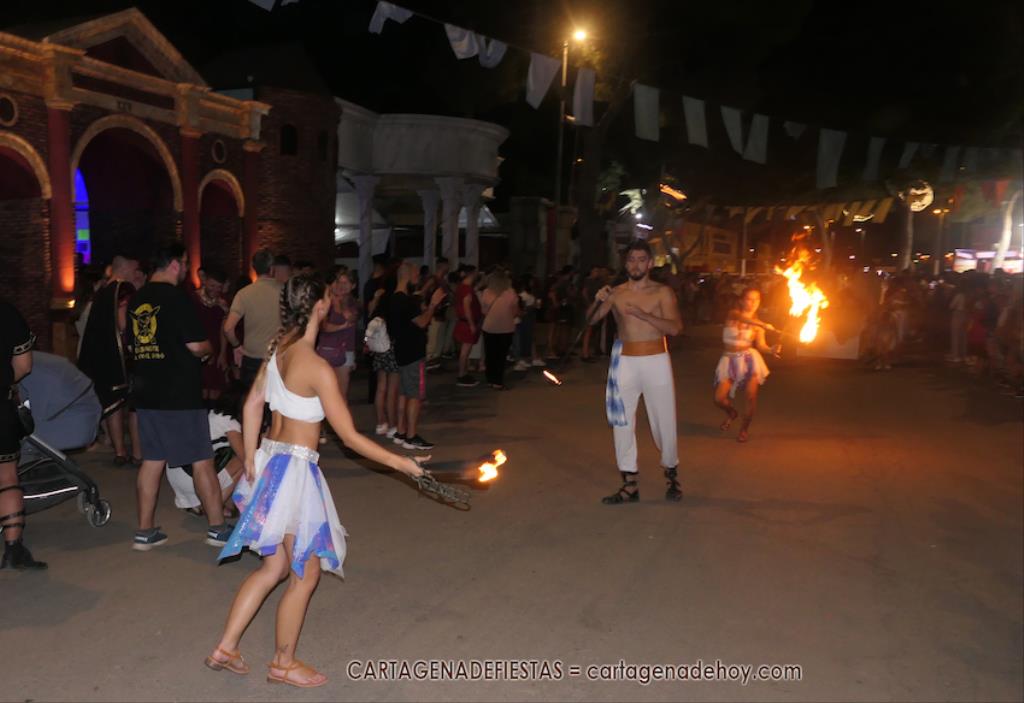 Los atractivos paralelos no acabaron ahí, pues también se incluyen el novedoso lanzamiento de hacha y la espectacular entrada de Fuerzas de Choque Extraordinarri a su recinto de campamento entre marcialidad y antorchas de fuego rojo. Luego, sobre el escenario de la vía romana, tuvieron lugar la boda de Venus y Vulcano (tendrá un articulo propio) el sacrificio de un esclavo por parte de las amazonas. Más tarde también se sumaron los carthagineses con varias incursiones de tropas por la calle enemiga. ‘Buen apetito, buenas fiestas’.