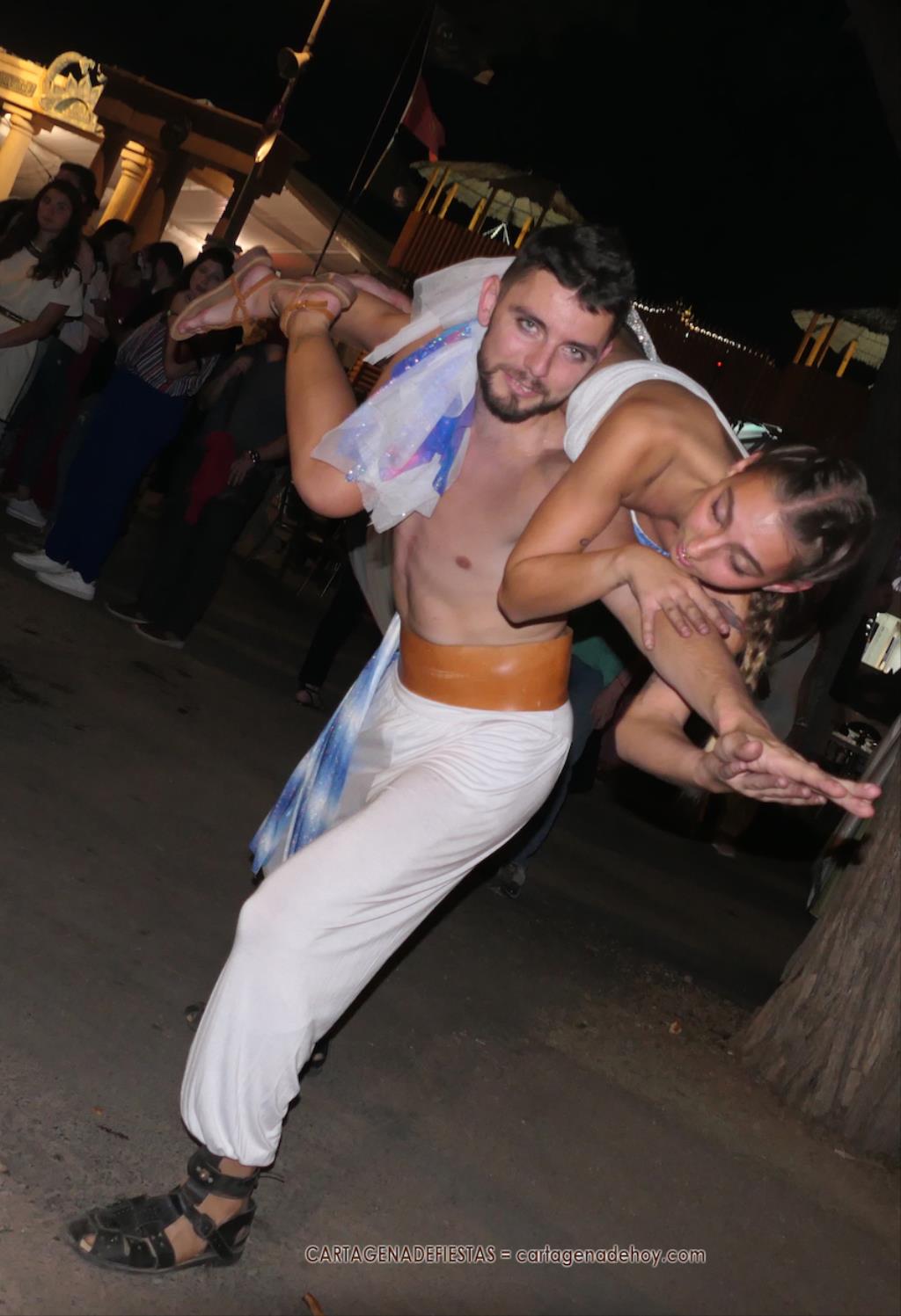 Fue una muy agradable noche gastronómica enriquecida con espectáculos y otros alicientes. Lo primero, recordar que este ‘Feriae Latino’ rememoraba el festín que las romanas tributaban a los legiones antes de que estos se fueran a la guerra. Así, Emilia Paula era la gran anfitriona y conforme avanzaba por la calle, cada legión empezaba a ofrecer sus viandas. Por delante iban acróbatas, espectáculos de fuego, gladiadores y el polifacético grupo coreográfico ‘Paraíso’ del Polígono Santa Ana.