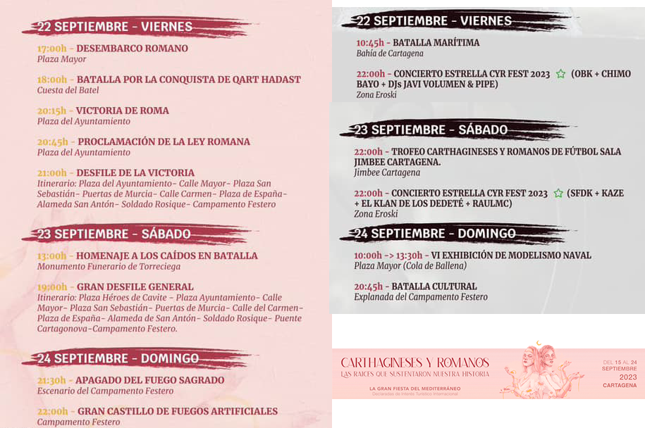 Viernes, sábado y domingo para la recta final del ‘Annus XXXIV de Carthagineses y Romanos’. Hoy es día de visitas gratuitas a museos de Puerto de Culturas y también, al igual que el sábado, para coger los autobuses urbanos sin pagar. En cuanto al programa festero, esta tarde tiene lugar el asalto a Qart-Hadast, con todas las más de mil quinientas entradas para verla sentado que se han vendido (el precio era de 5 euros). El sábado es para el recuerdo a los caídos y para el gran desfile y el domingo para el apagado del fuego, aunque en las tres jornadas seguirán otras actividades de tropas y legiones.