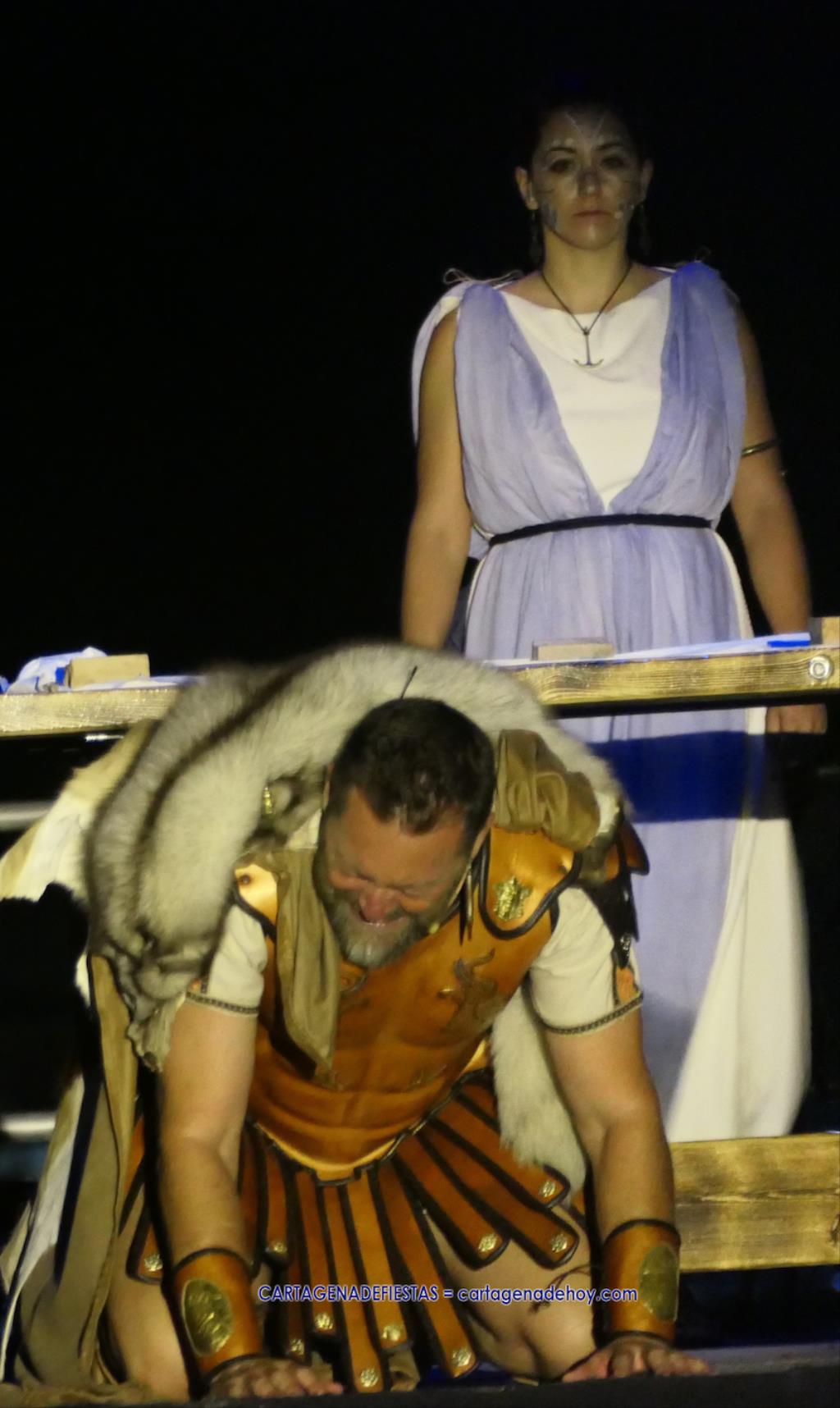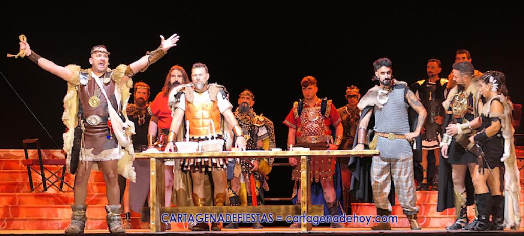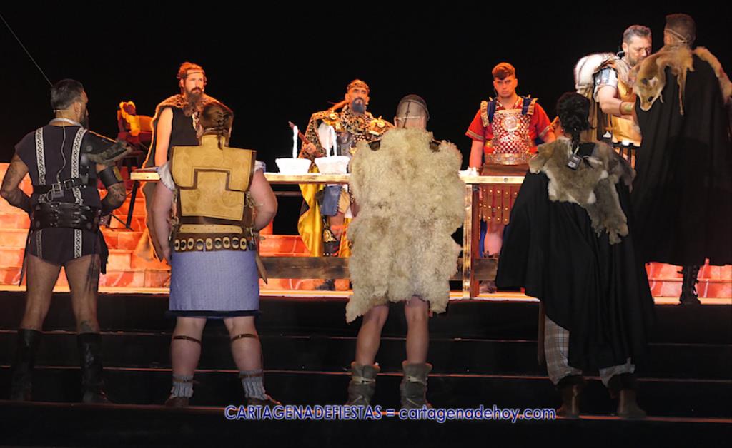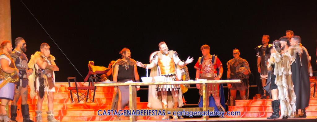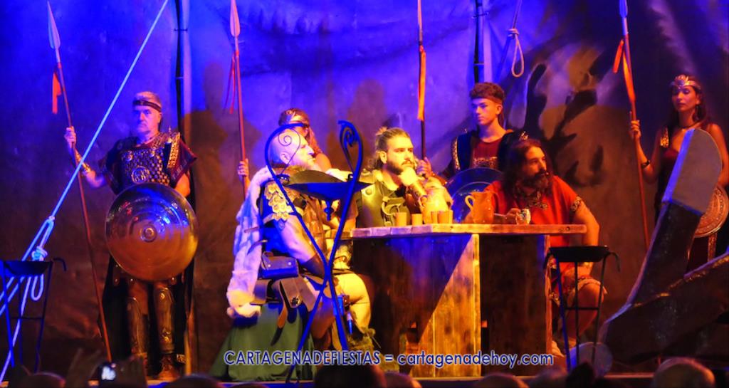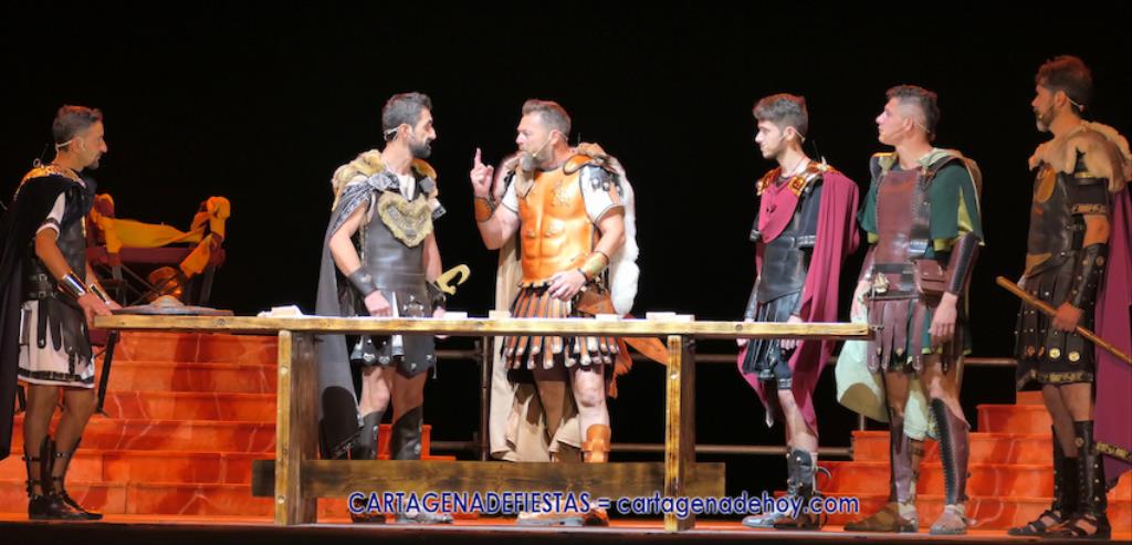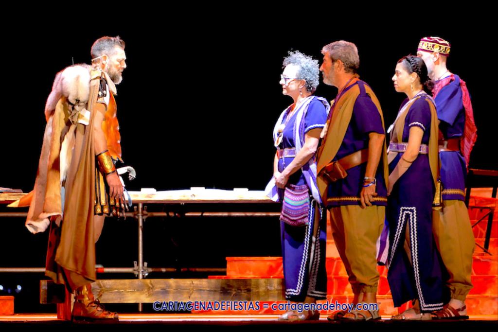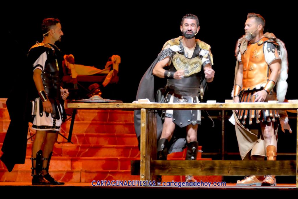 El último acto teatral del Consejo Carthaginés relata cómo se gestó la histórica marcha de Aníbal hacia Roma cruzando Los Pirineos y Los Alpes. La obra, dirigida por Jesús Fernández, mantiene su relato base, pero siempre se intenta añadir o variar alguna escena para mantener el interés de todo el público, incluido el que ya la haya visto más veces. En esta ocasión (s.e.u.o.), fue novedad la representación de la devotio final (más larga) y que Aníbal entregue la falcata que simboliza las llaves de Qart-Hadast a Magón Giscón, quien quedó como gobernardo cuando atacó Escipión aprovechando la escasez de defensores en la ciudad íbera. También fue un estreno Julio Guillamón en el papel de Aníbal, gran protagonista del relato. Factor no esperado fue el viento, que molestó y apagó algún pebetero, pero es que Eolo no se quiere ir este año del escenario de puerto.