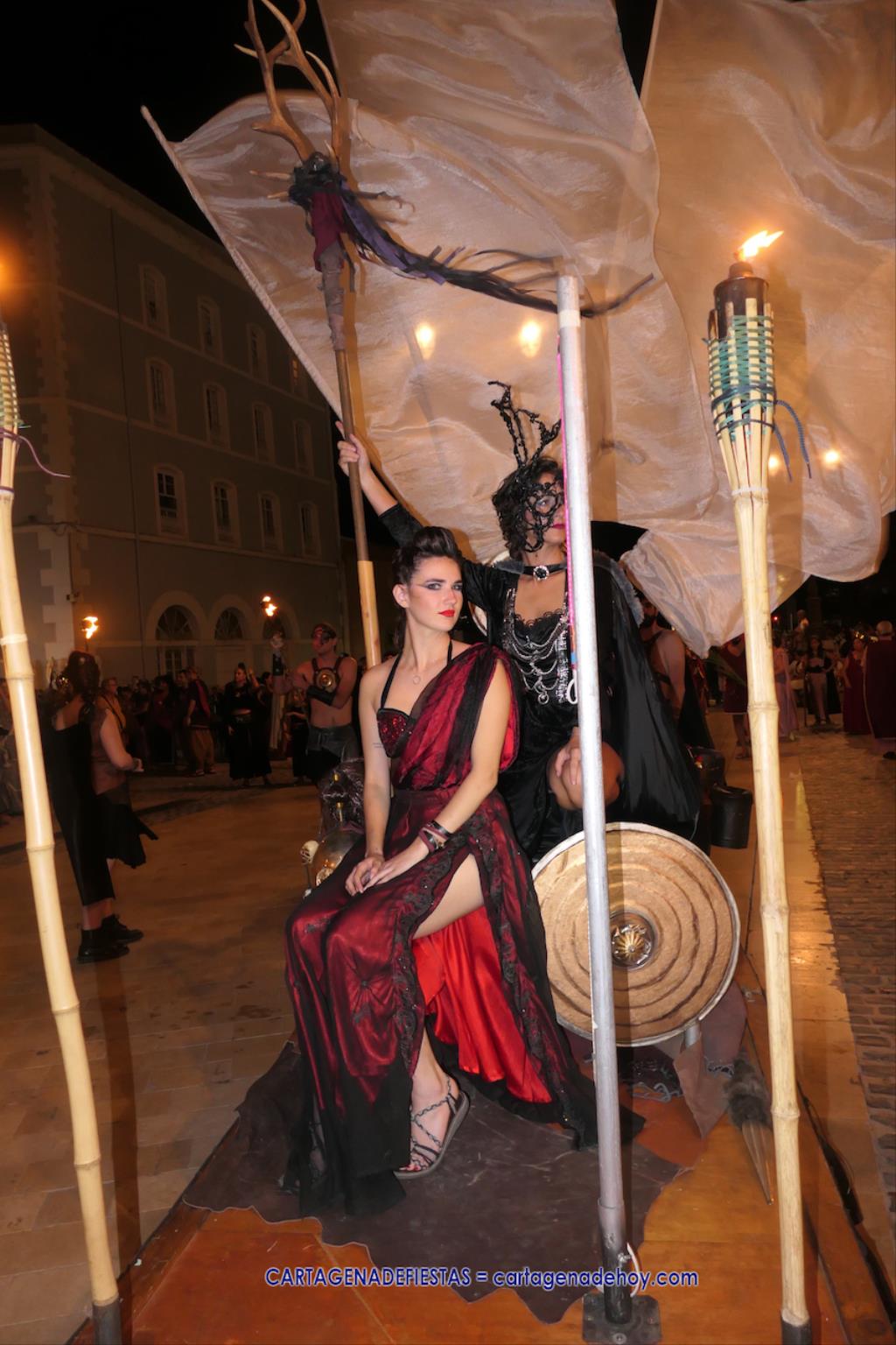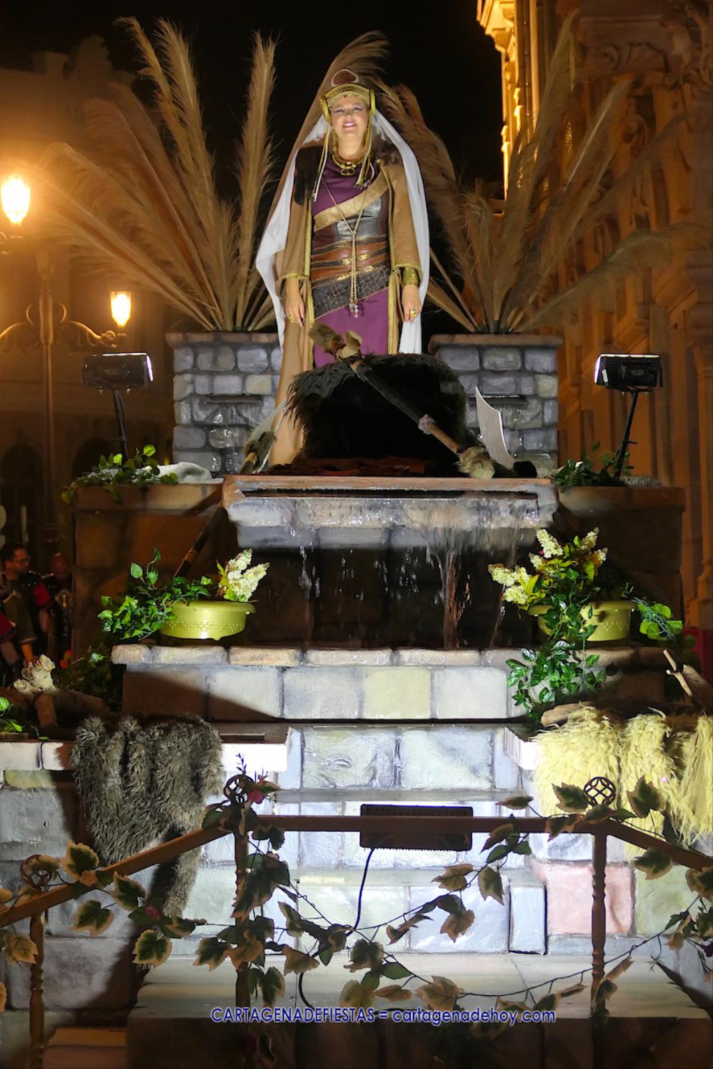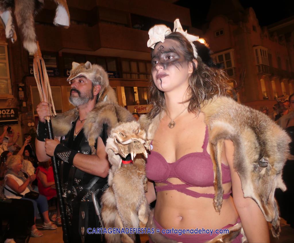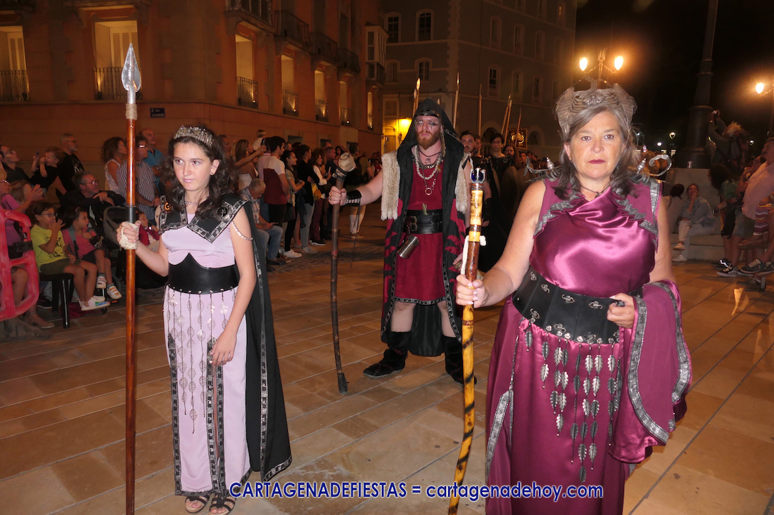 Encabezados por artistas del fuego y danzarinas, fueron pasando guerreros, civiles, druidas, sacerdotes, sacerdotisas, dioses… y los personajes principales, con Aníbal e Himilce infantil en carroza, al igual que la princesa íbera adulta, mientras que el general se incorporó después de superarse la calle Mayor, a cabo. El recorrido fue por el centro histórico de la ciudad hasta la Alameda y de ahí al campamento.