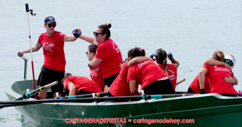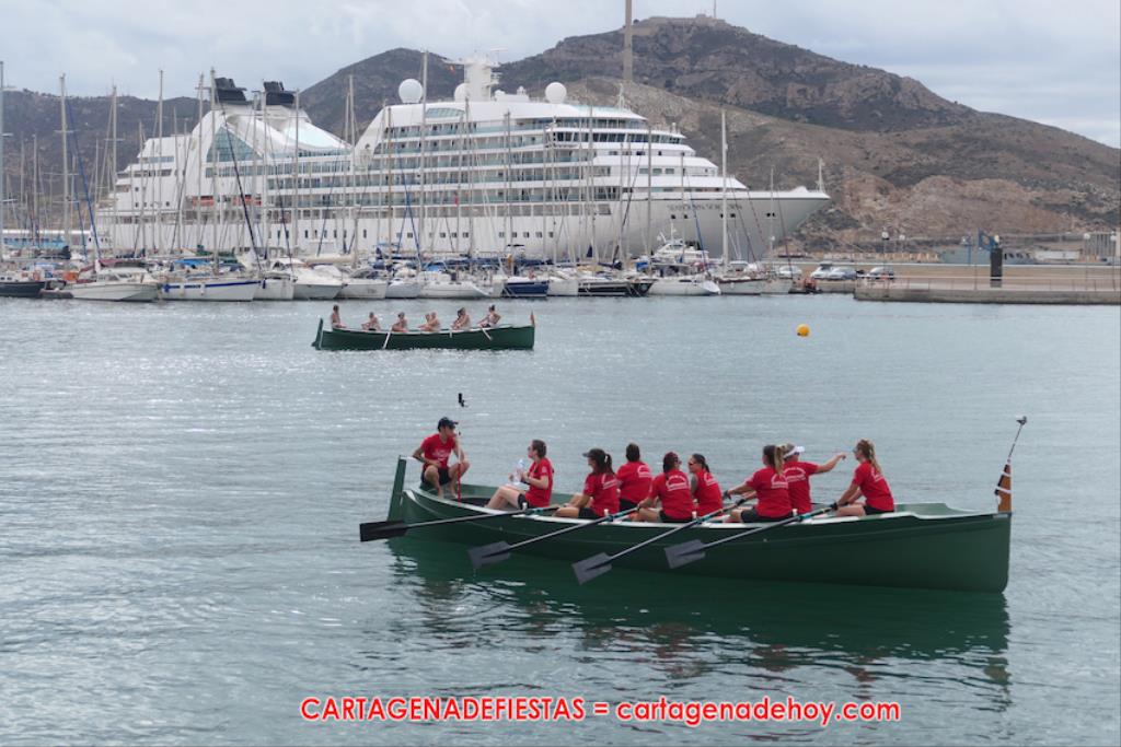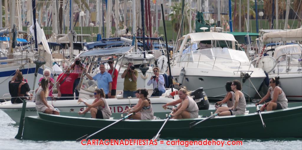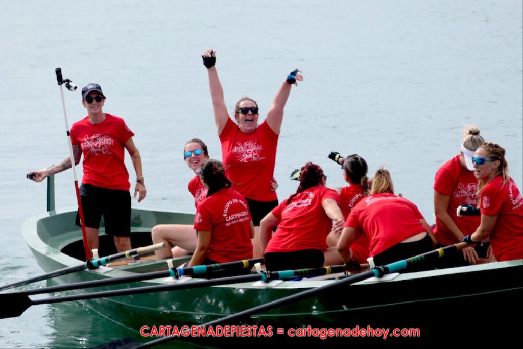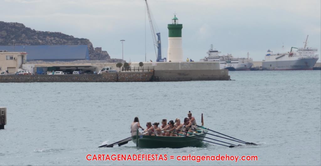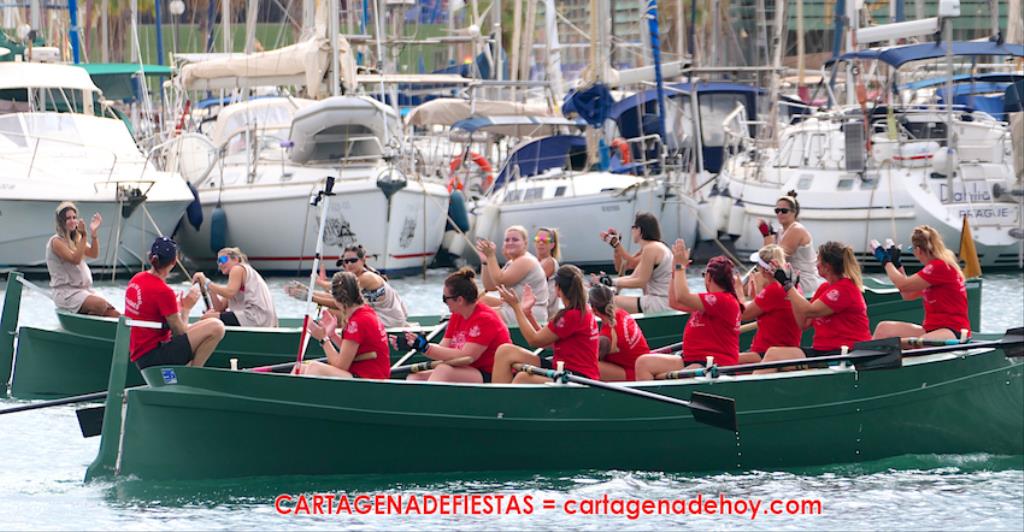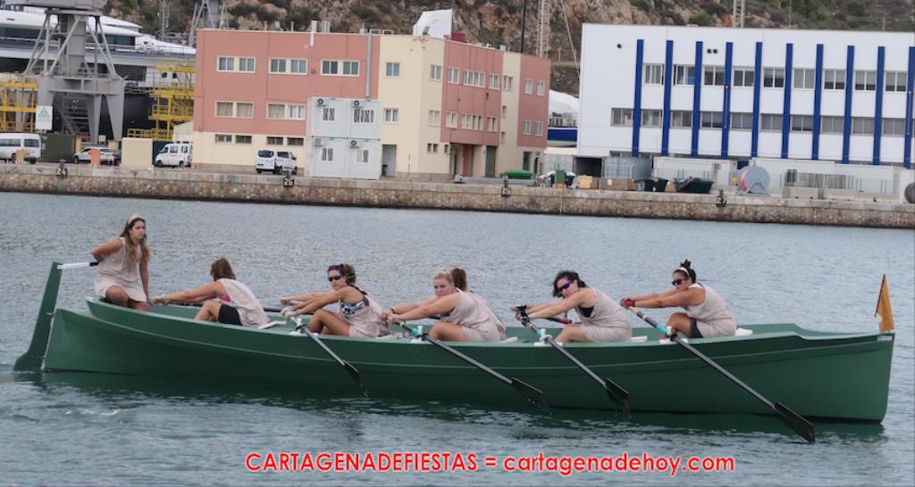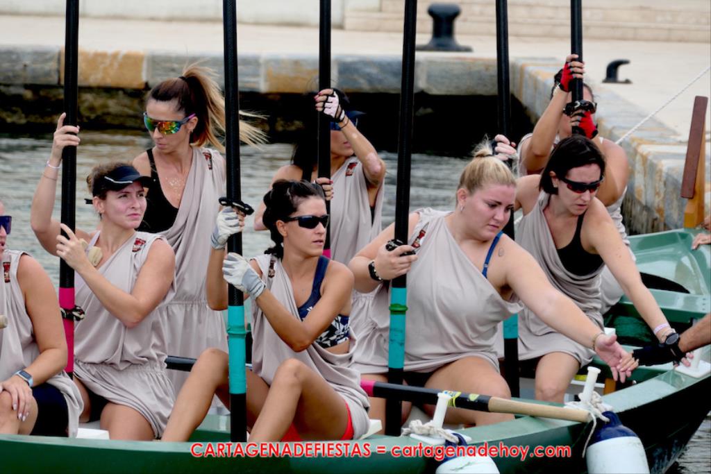 Las chicas fueron las primeras en competir. La salida tuvo que repertise debido a que el viento adelantó un par de metros la nave romana, como observaron los dos jueces de la Federación de Remo de la Región de Murcia que se encargan de salvaguardar el buen desarrollo de la competición. El segundo intento fue válido y la igualdad presidió el primer tramo, con ligera ventaja de la nave púnica que tenía como patrona a Cristina Bermejo en la ciaboga. La nave romana perdió opciones en esa boya y, pese al esfuerzo de las chicas que dirigía Eva Pérez, la victoria fue para las mozas púnicas.