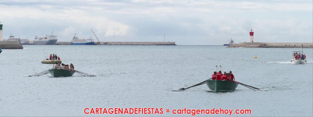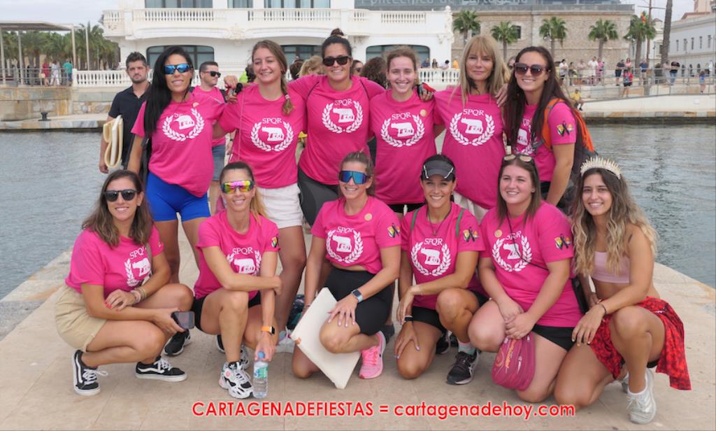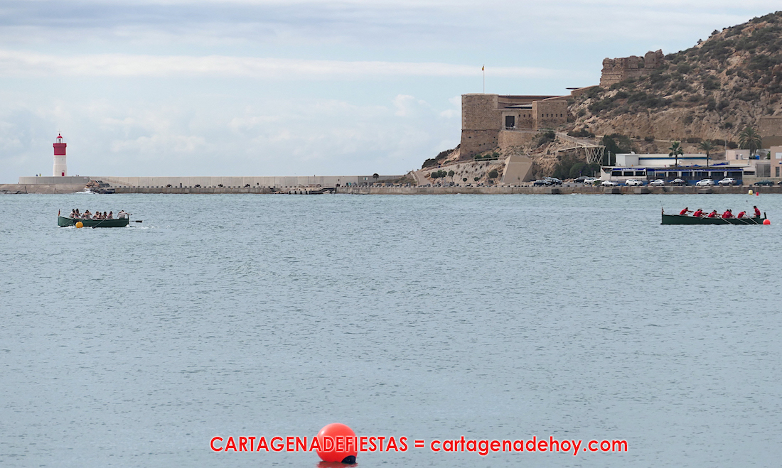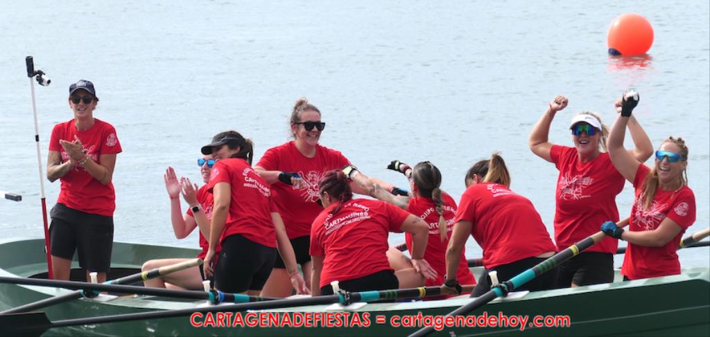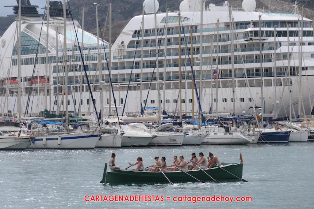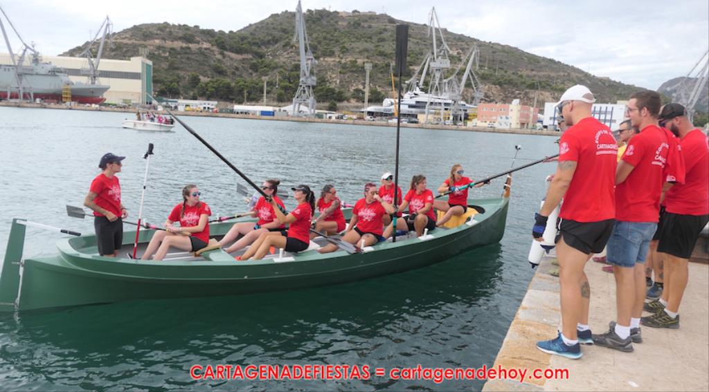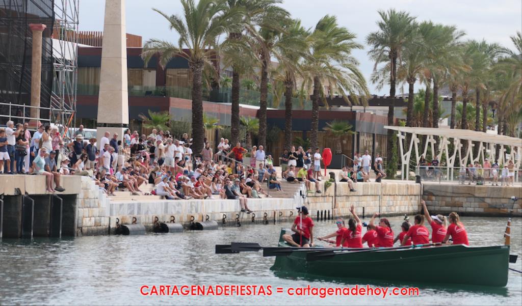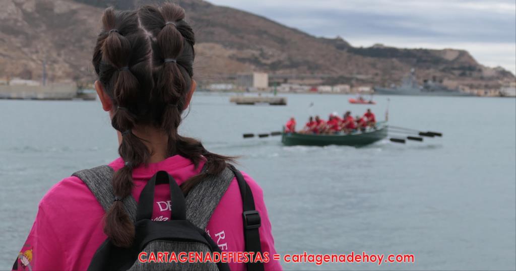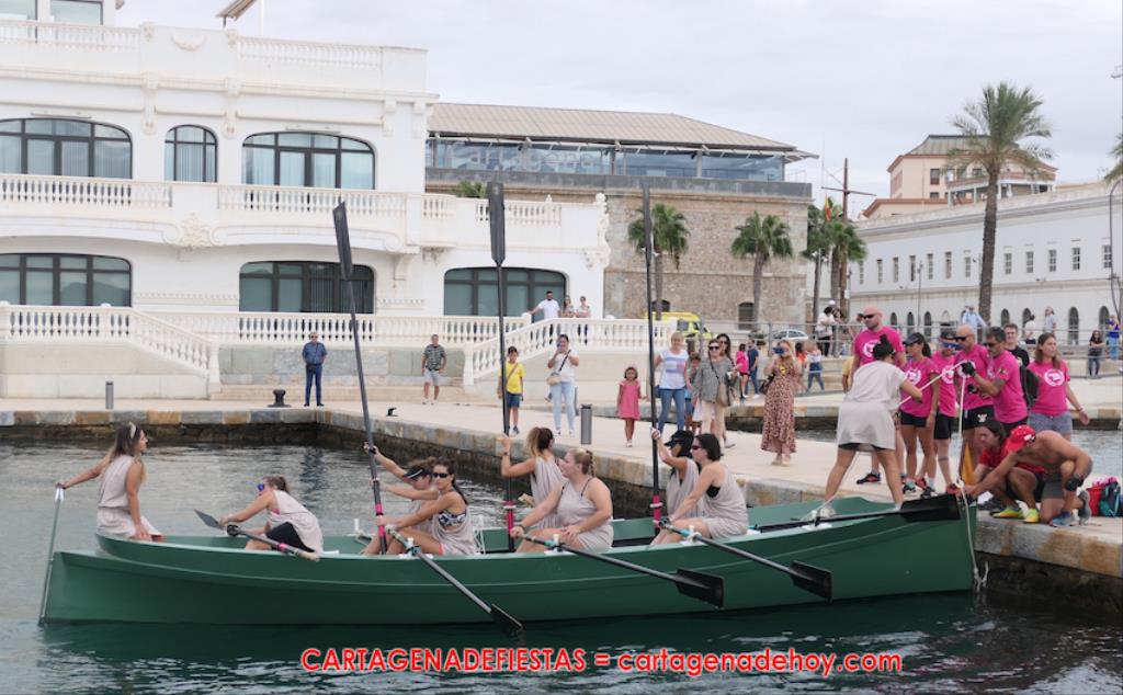 Las chicas fueron las primeras en competir. La salida tuvo que repertise debido a que el viento adelantó un par de metros la nave romana, como observaron los dos jueces de la Federación de Remo de la Región de Murcia que se encargan de salvaguardar el buen desarrollo de la competición. El segundo intento fue válido y la igualdad presidió el primer tramo, con ligera ventaja de la nave púnica que tenía como patrona a Cristina Bermejo en la ciaboga. La nave romana perdió opciones en esa boya y, pese al esfuerzo de las chicas que dirigía Eva Pérez, la victoria fue para las mozas púnicas.