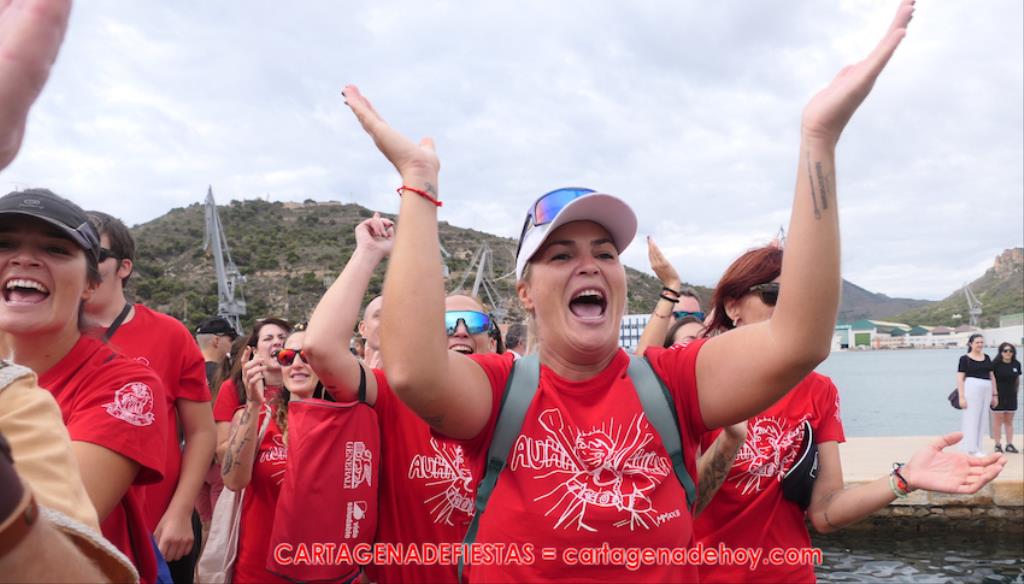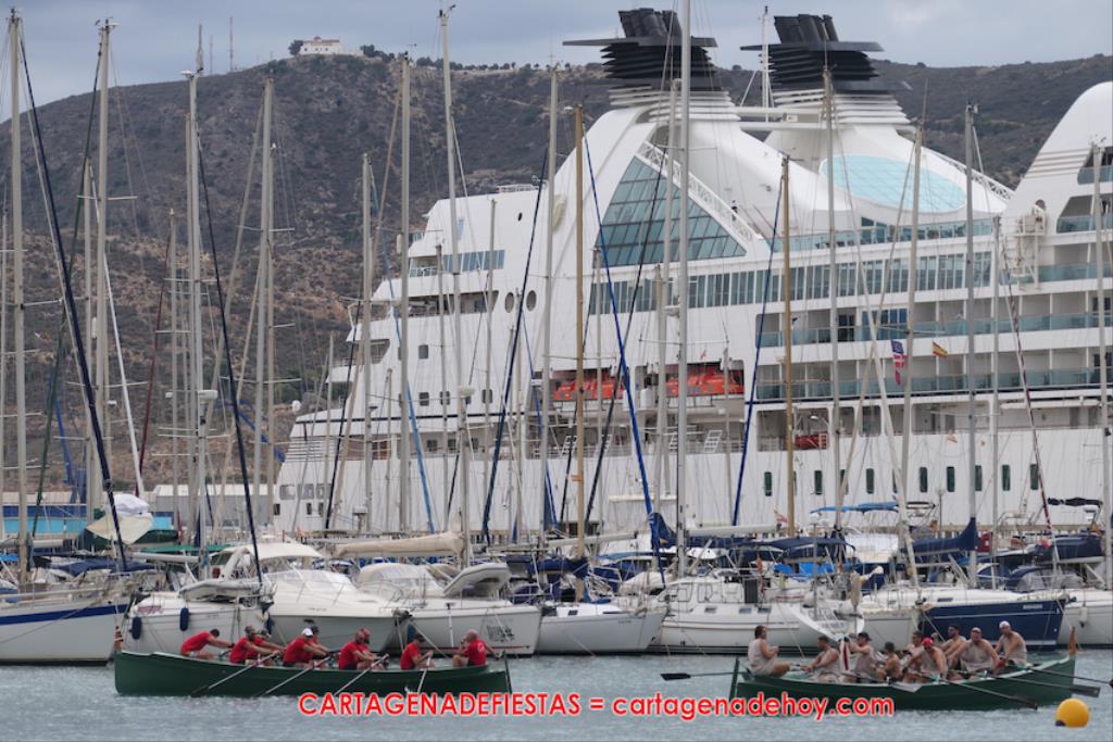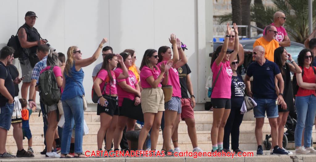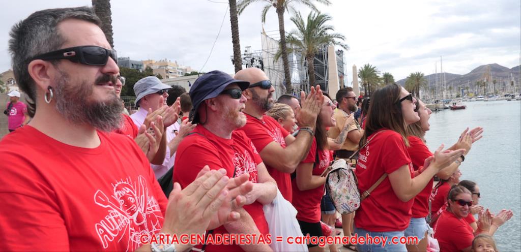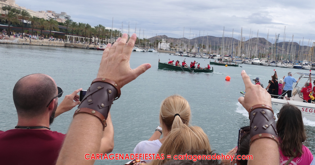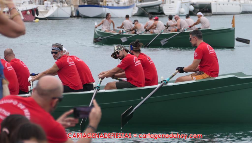 Después era el turno de los mozos festeros, cuyo recorrido es el doble que las féminas, teniendo que doblar en dos ocasiones por sus respectivas boyas. Aquí se vivió uno de los finales más emocionantes de la historia del combate marino, entrando con la ventaja de apenas un remo la escuadra carthaginesa. Al final, júbilo púnico ante un adversario que nunca se rendirá pese a que los guarismos indican que en hombres dominan los carthagineses por 22 victorias a 6 y que en las féminas el marcador se sitúa en 11-6. Destacar, por último, el gran ambiente en torno a esta prueba y la gran deportividad que existe entre los ‘combatientes’.