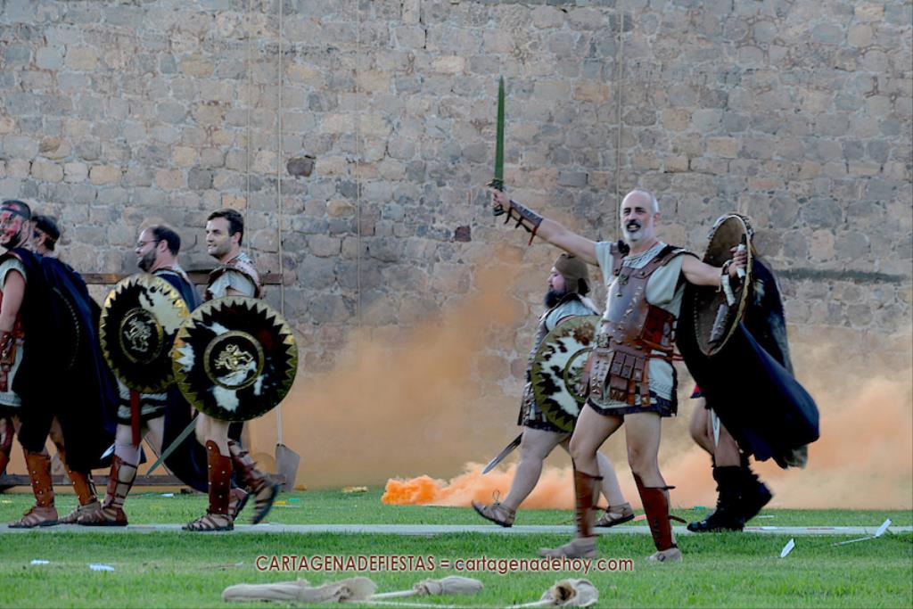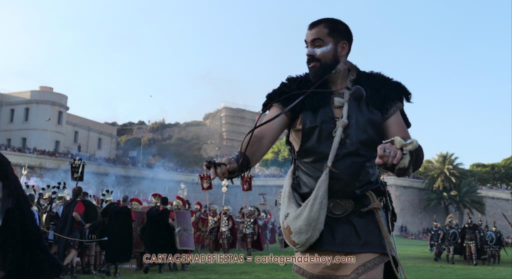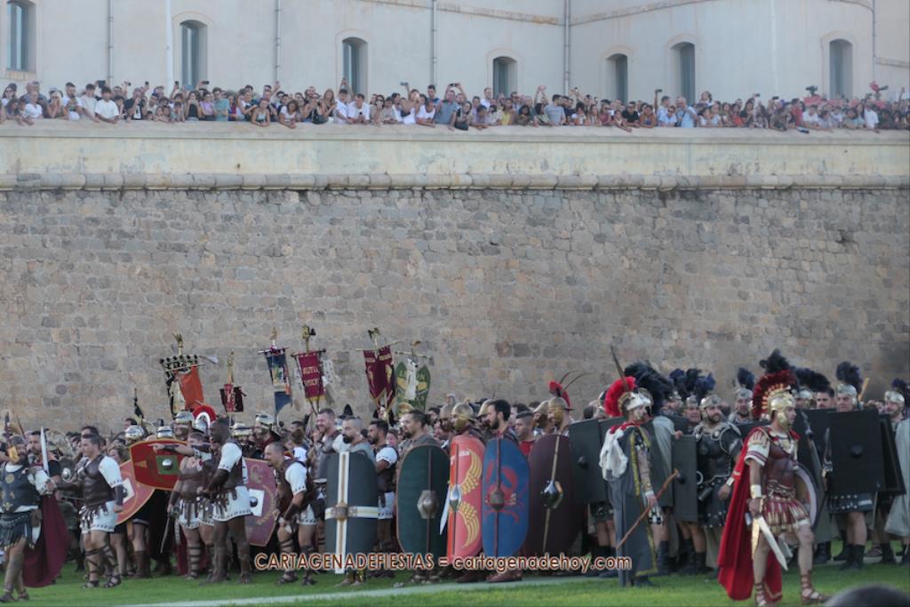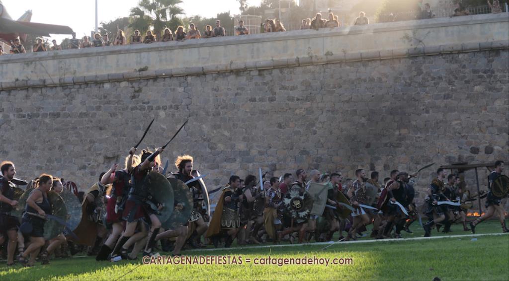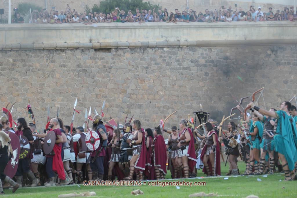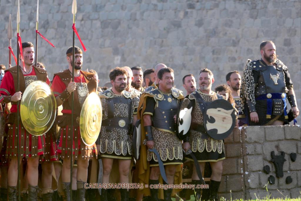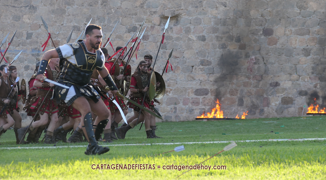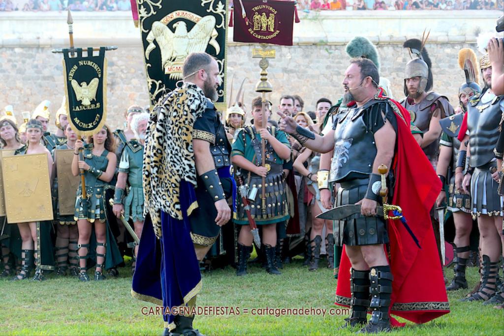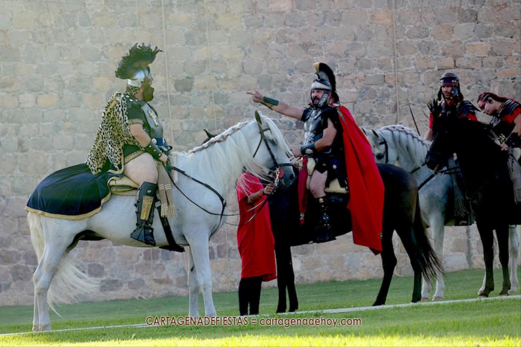 Zenón de Palus y Polibio de Megalópolis han sido los narradores de un hecho histórico que tuvo lugar hace 2.232 años en lo que hoy es Cartagena y que han representado 1.200 festeros durante una hora. "Aquí cambiará la historia", se anuncia por megafonía antes de situar a los bandos, uno en Qart-Hadast con mil o dos mil defensores y otro que ha montado campamento al otro lado del ismo con 25.000 efectivos de infantería, con 2.500 jinetes más la flota que lidera Cayo Lelio, quienes aprovechan que el ejército púnico más próximo está a diez días Los defensores de la ciudad están dispuestos a aguantar, pero la realidad es que en aquella primavera en un día tuvieron que rendir la ciudad. Bueno, vayamos al desarrollo cronológico. Magón Giscón y Escipión, ambos a caballo, se encuentro para parlamentar, pero no hay entente. El romano regresa para soltar una arenga clara. "¡Una batalla se puede ganar con armas, pero una guerra sólo con la mente. ¡Vamos a ganar!". Magón, por su parte, recalca a los suyos que lucha por no caer ante el yugo romano y seguir libres. "¡Muerte a las águilas, muerte a Roma!".