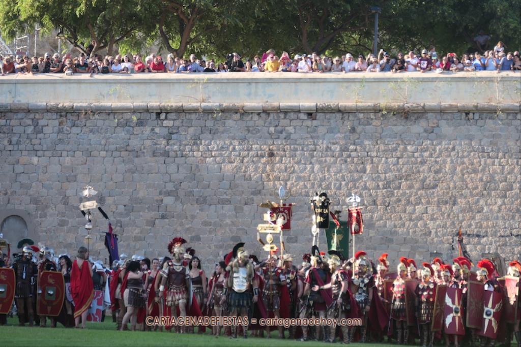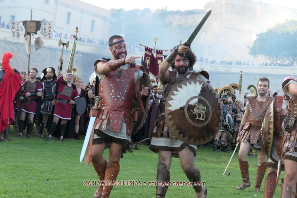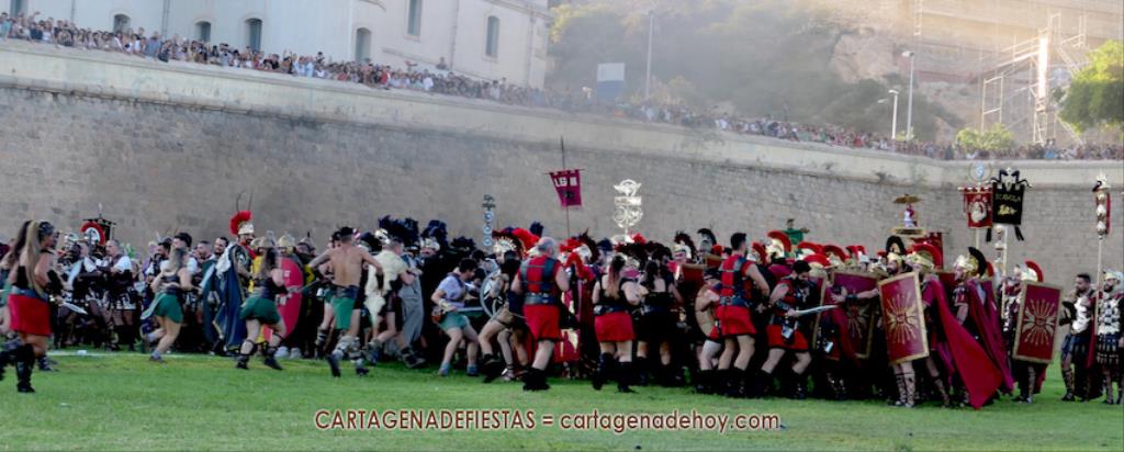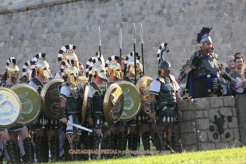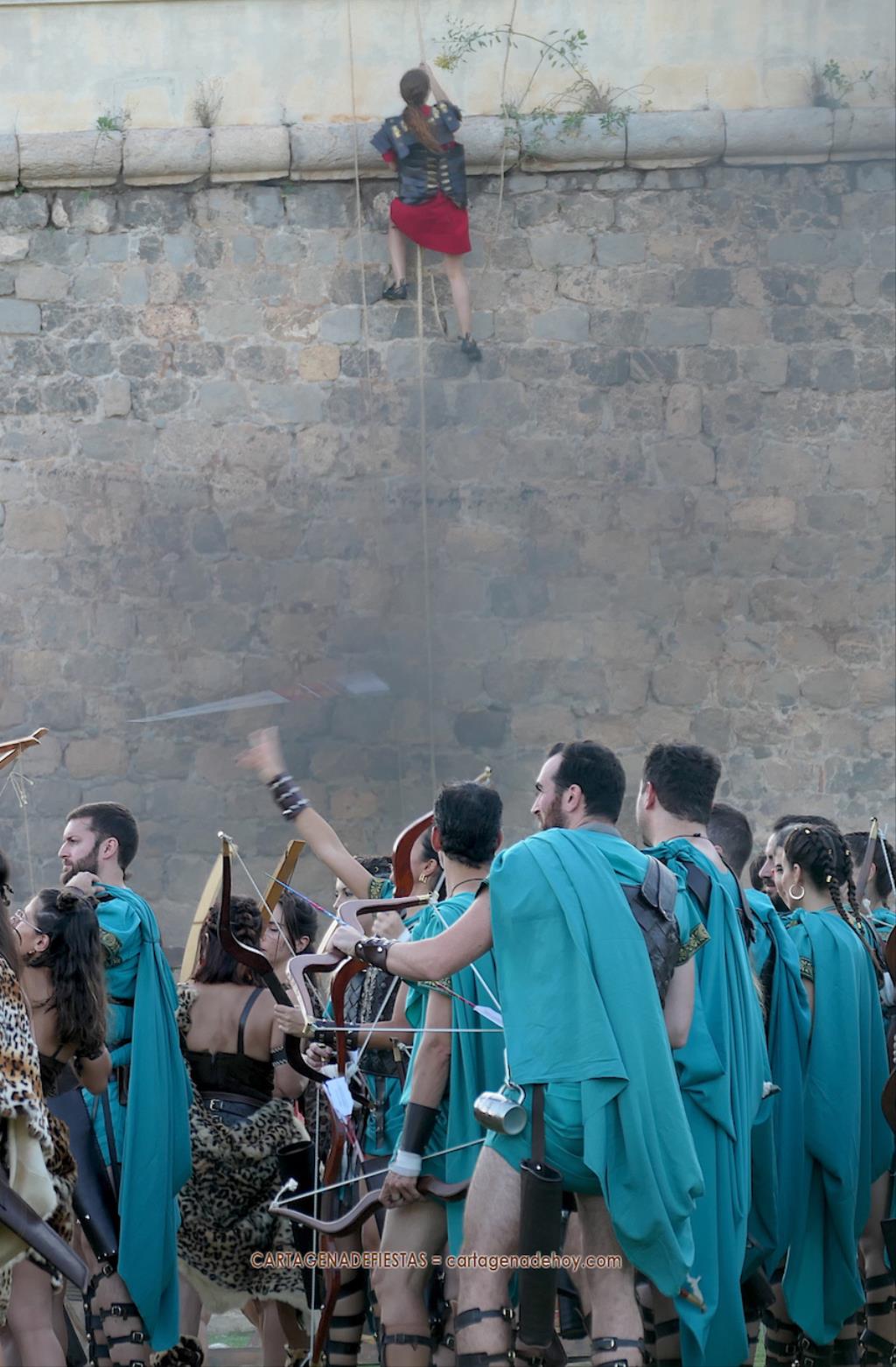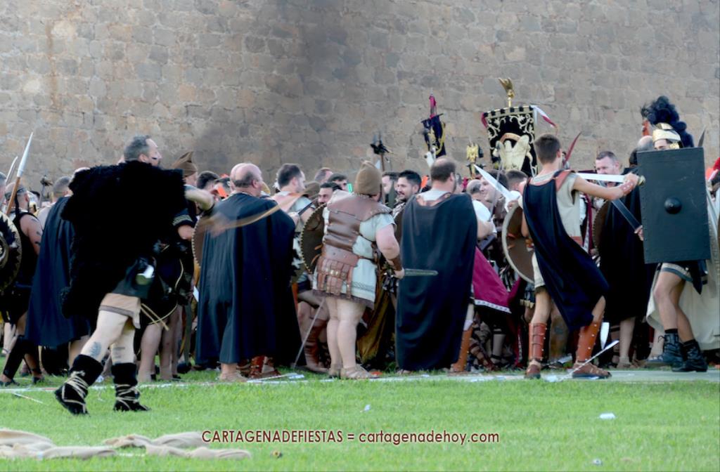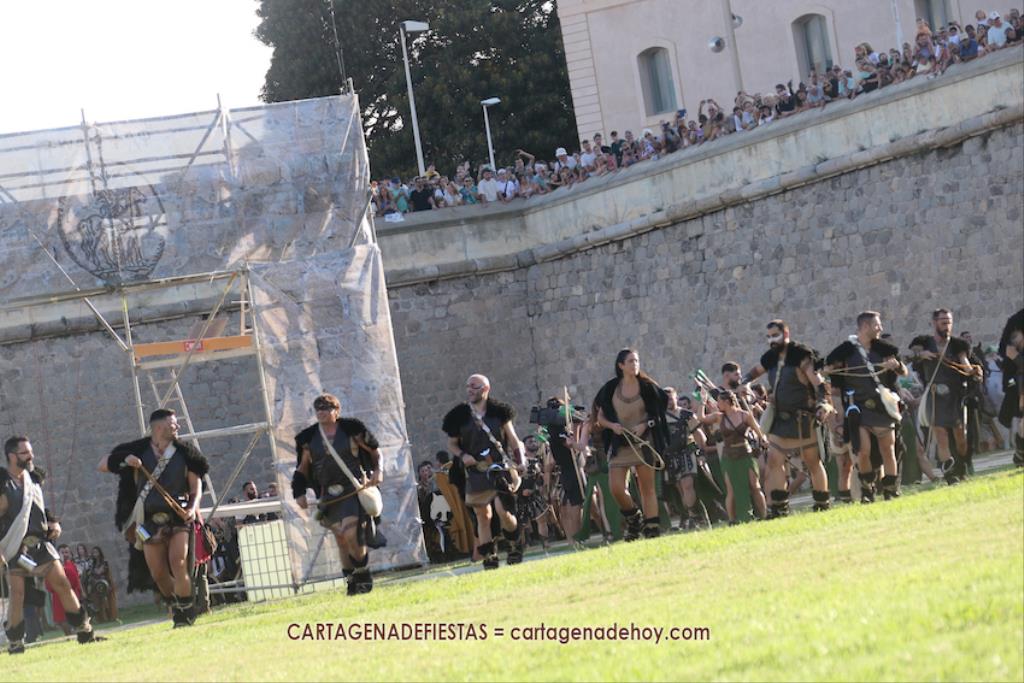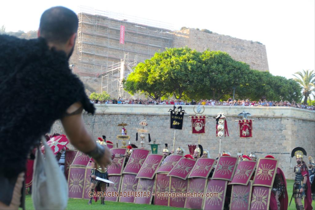 Zenón de Palus y Polibio de Megalópolis han sido los narradores de un hecho histórico que tuvo lugar hace 2.232 años en lo que hoy es Cartagena y que han representado 1.200 festeros durante una hora. "Aquí cambiará la historia", se anuncia por megafonía antes de situar a los bandos, uno en Qart-Hadast con mil o dos mil defensores y otro que ha montado campamento al otro lado del ismo con 25.000 efectivos de infantería, con 2.500 jinetes más la flota que lidera Cayo Lelio, quienes aprovechan que el ejército púnico más próximo está a diez días Los defensores de la ciudad están dispuestos a aguantar, pero la realidad es que en aquella primavera en un día tuvieron que rendir la ciudad. Bueno, vayamos al desarrollo cronológico. Magón Giscón y Escipión, ambos a caballo, se encuentro para parlamentar, pero no hay entente. El romano regresa para soltar una arenga clara. "¡Una batalla se puede ganar con armas, pero una guerra sólo con la mente. ¡Vamos a ganar!". Magón, por su parte, recalca a los suyos que lucha por no caer ante el yugo romano y seguir libres. "¡Muerte a las águilas, muerte a Roma!".