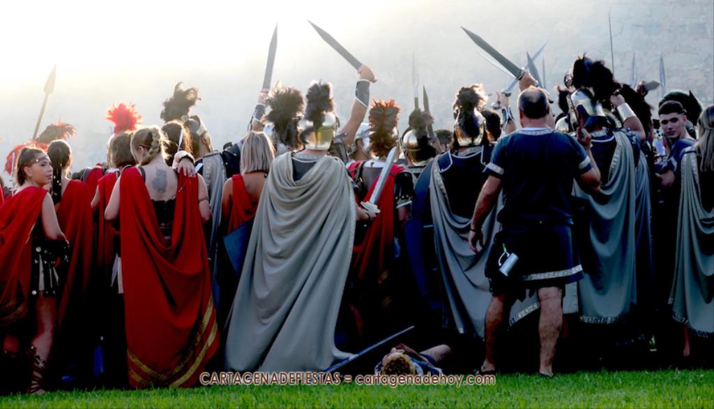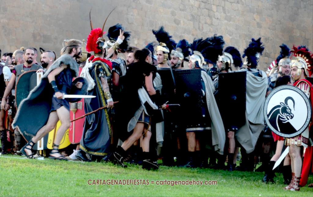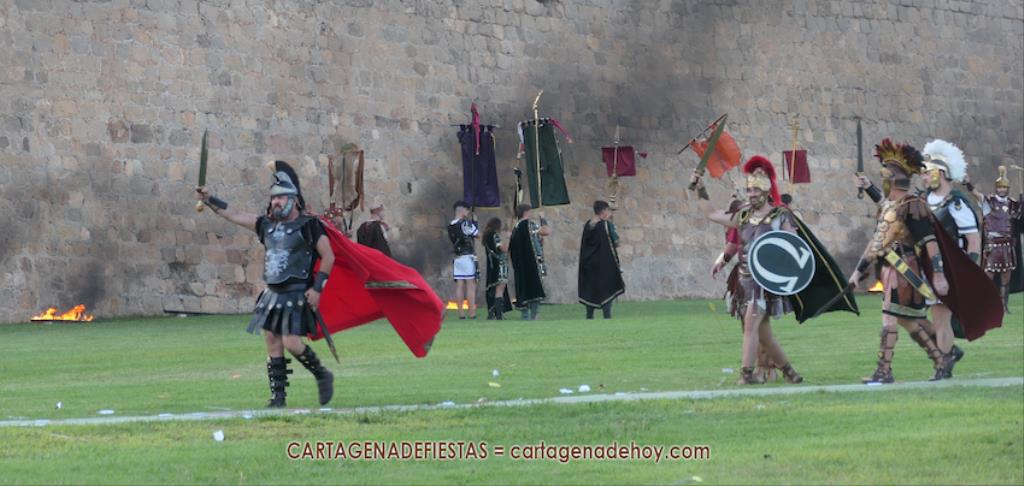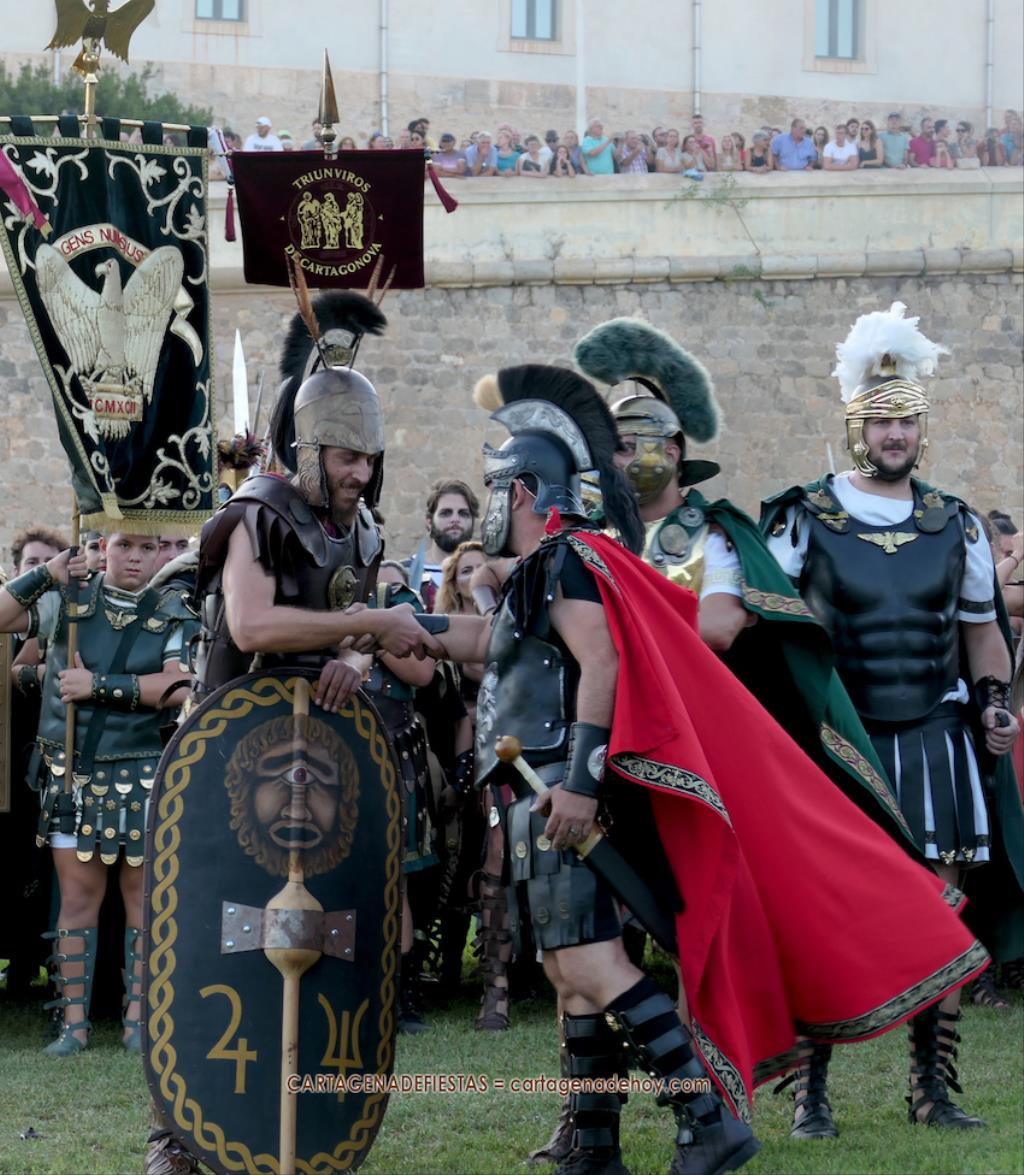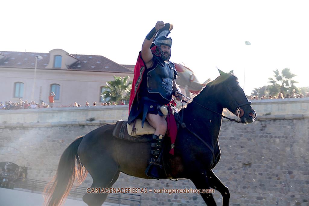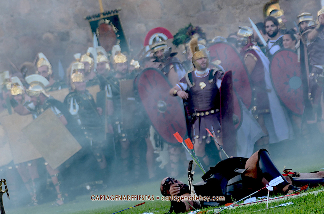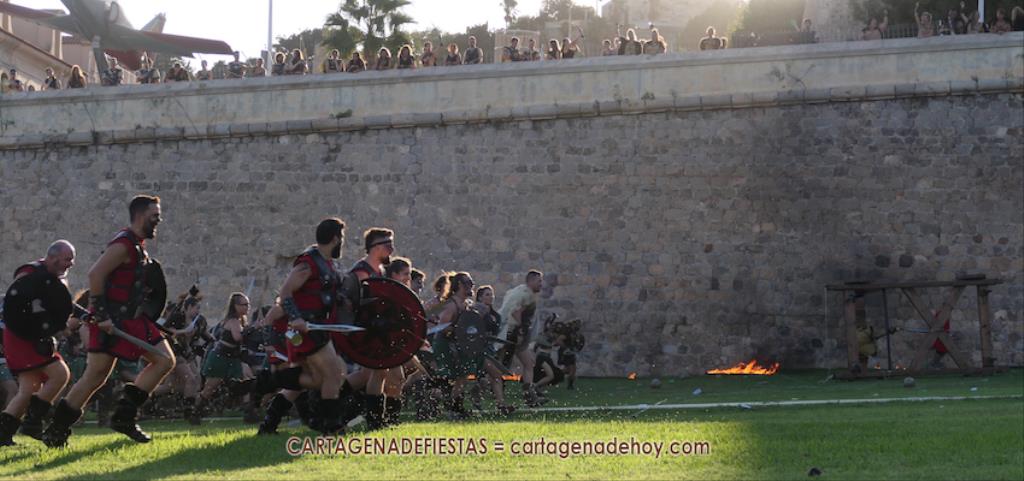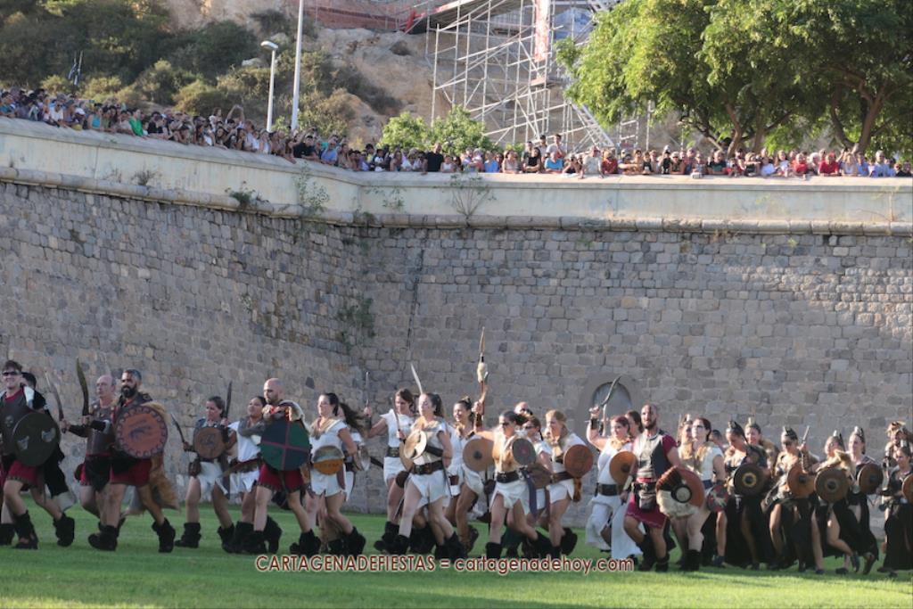 Zenón de Palus y Polibio de Megalópolis han sido los narradores de un hecho histórico que tuvo lugar hace 2.232 años en lo que hoy es Cartagena y que han representado 1.200 festeros durante una hora. "Aquí cambiará la historia", se anuncia por megafonía antes de situar a los bandos, uno en Qart-Hadast con mil o dos mil defensores y otro que ha montado campamento al otro lado del ismo con 25.000 efectivos de infantería, con 2.500 jinetes más la flota que lidera Cayo Lelio, quienes aprovechan que el ejército púnico más próximo está a diez días Los defensores de la ciudad están dispuestos a aguantar, pero la realidad es que en aquella primavera en un día tuvieron que rendir la ciudad. Bueno, vayamos al desarrollo cronológico. Magón Giscón y Escipión, ambos a caballo, se encuentro para parlamentar, pero no hay entente. El romano regresa para soltar una arenga clara. "¡Una batalla se puede ganar con armas, pero una guerra sólo con la mente. ¡Vamos a ganar!". Magón, por su parte, recalca a los suyos que lucha por no caer ante el yugo romano y seguir libres. "¡Muerte a las águilas, muerte a Roma!".