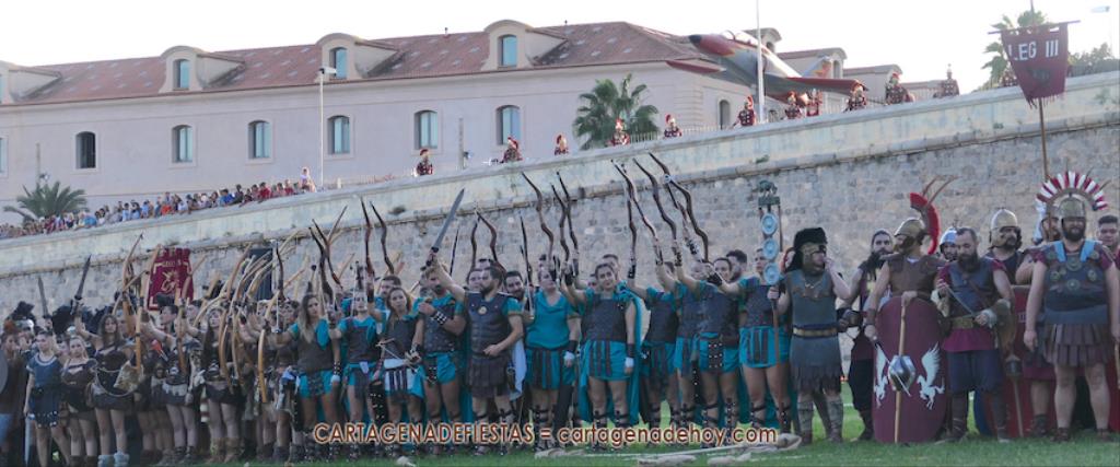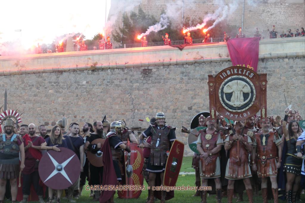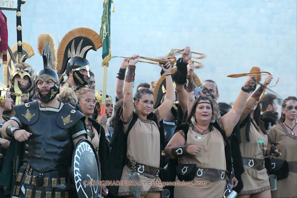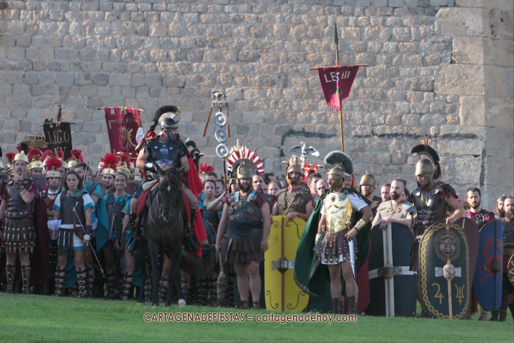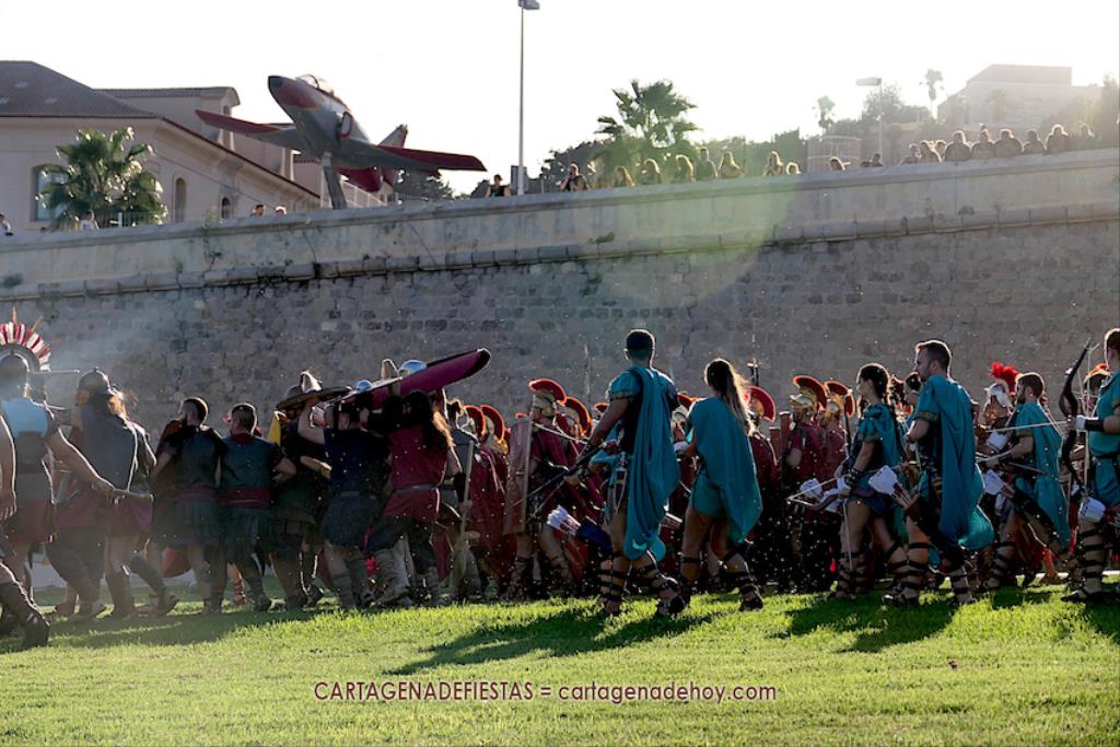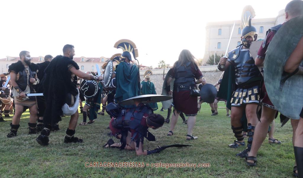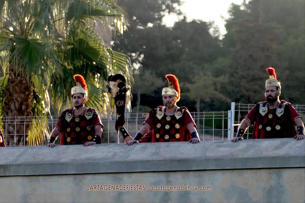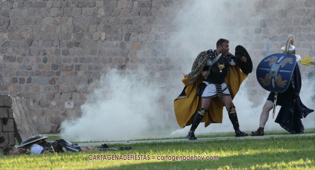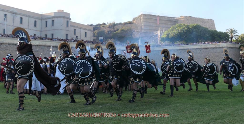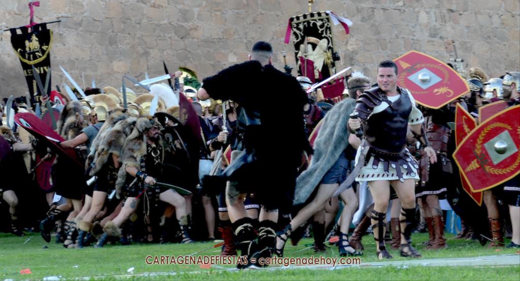 Zenón de Palus y Polibio de Megalópolis han sido los narradores de un hecho histórico que tuvo lugar hace 2.232 años en lo que hoy es Cartagena y que han representado 1.200 festeros durante una hora. "Aquí cambiará la historia", se anuncia por megafonía antes de situar a los bandos, uno en Qart-Hadast con mil o dos mil defensores y otro que ha montado campamento al otro lado del ismo con 25.000 efectivos de infantería, con 2.500 jinetes más la flota que lidera Cayo Lelio, quienes aprovechan que el ejército púnico más próximo está a diez días Los defensores de la ciudad están dispuestos a aguantar, pero la realidad es que en aquella primavera en un día tuvieron que rendir la ciudad. Bueno, vayamos al desarrollo cronológico. Magón Giscón y Escipión, ambos a caballo, se encuentro para parlamentar, pero no hay entente. El romano regresa para soltar una arenga clara. "¡Una batalla se puede ganar con armas, pero una guerra sólo con la mente. ¡Vamos a ganar!". Magón, por su parte, recalca a los suyos que lucha por no caer ante el yugo romano y seguir libres. "¡Muerte a las águilas, muerte a Roma!".