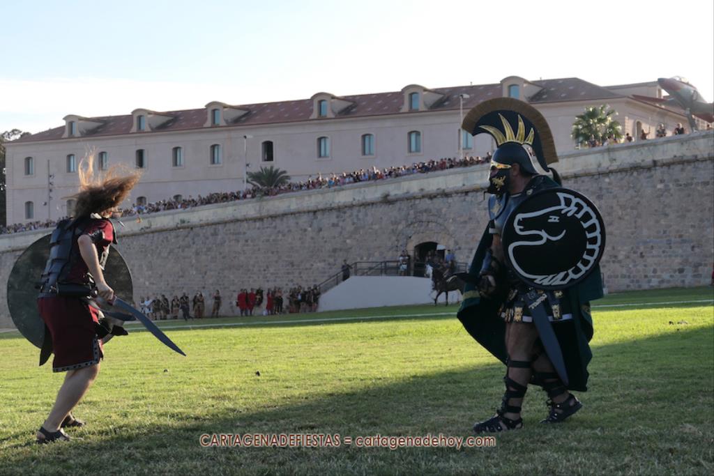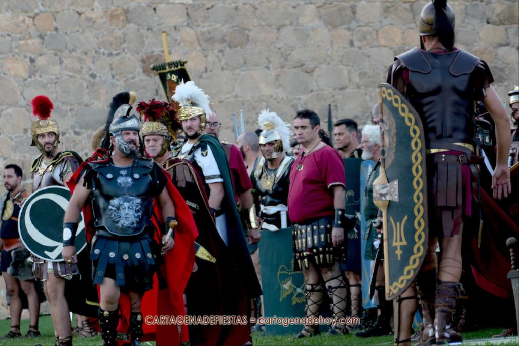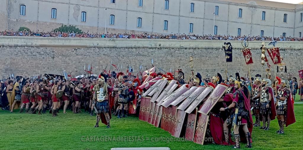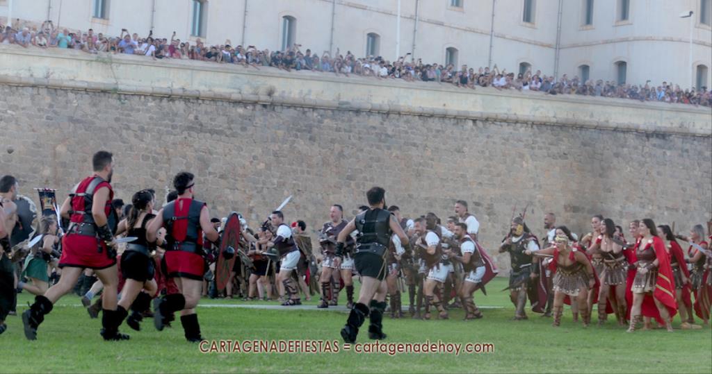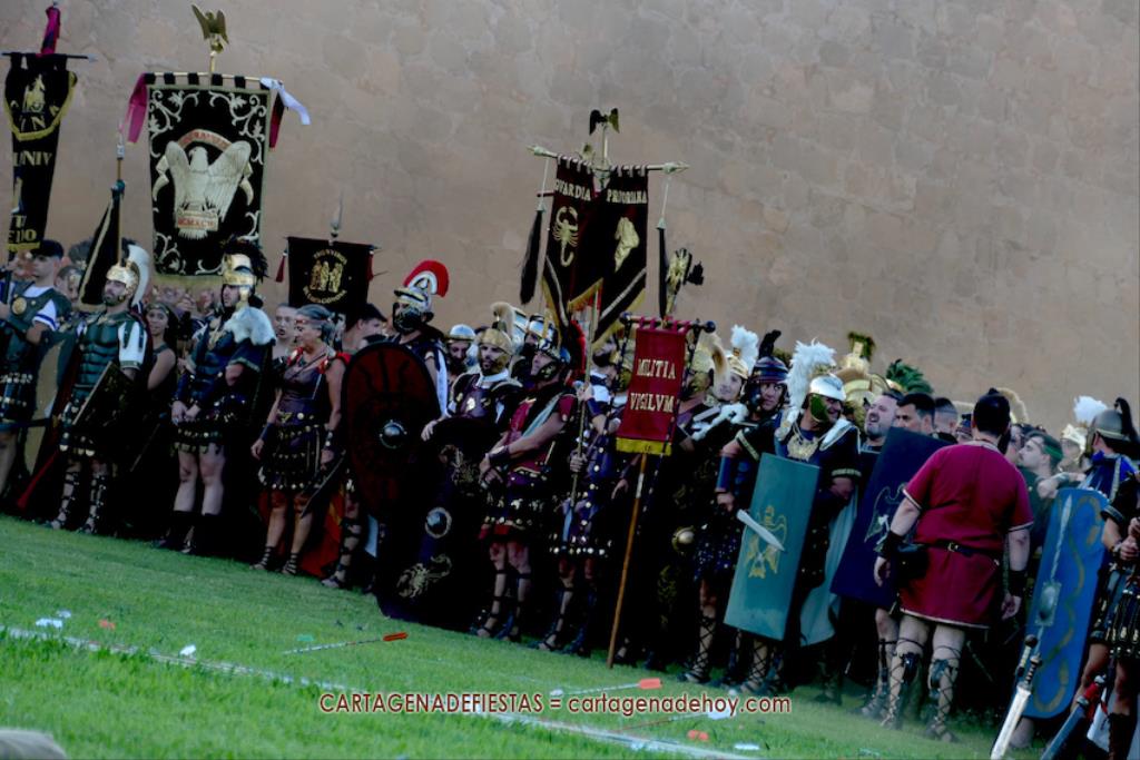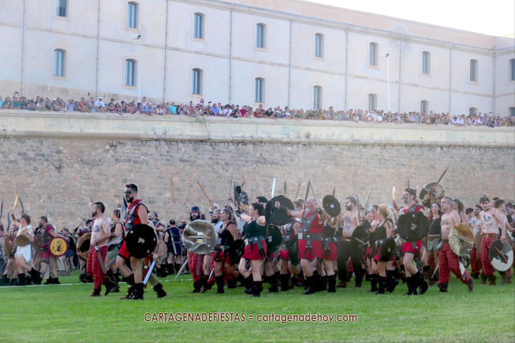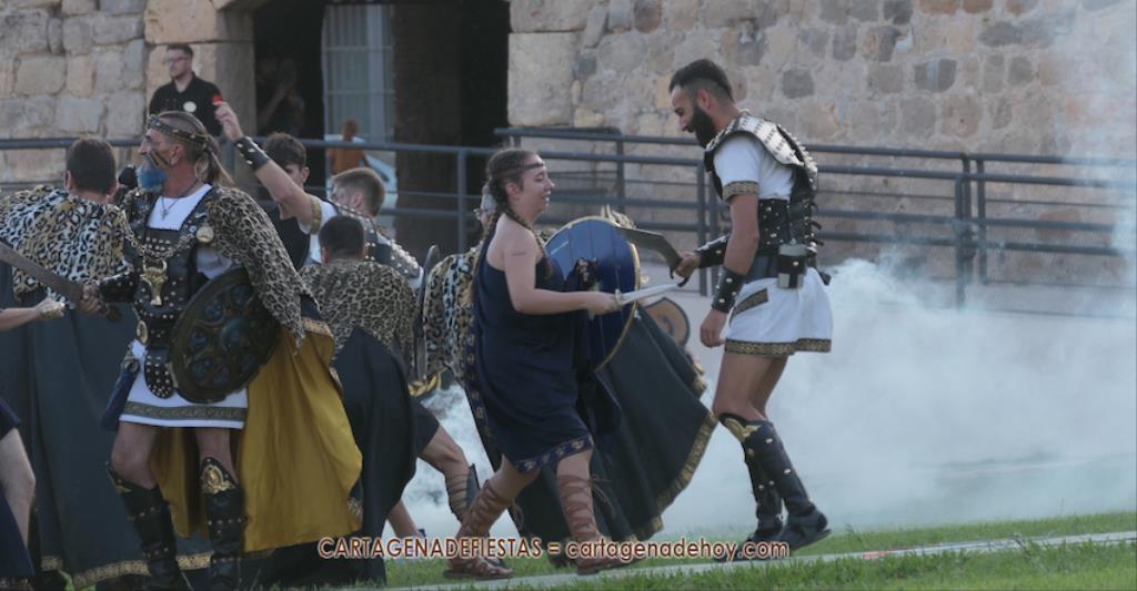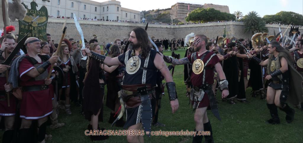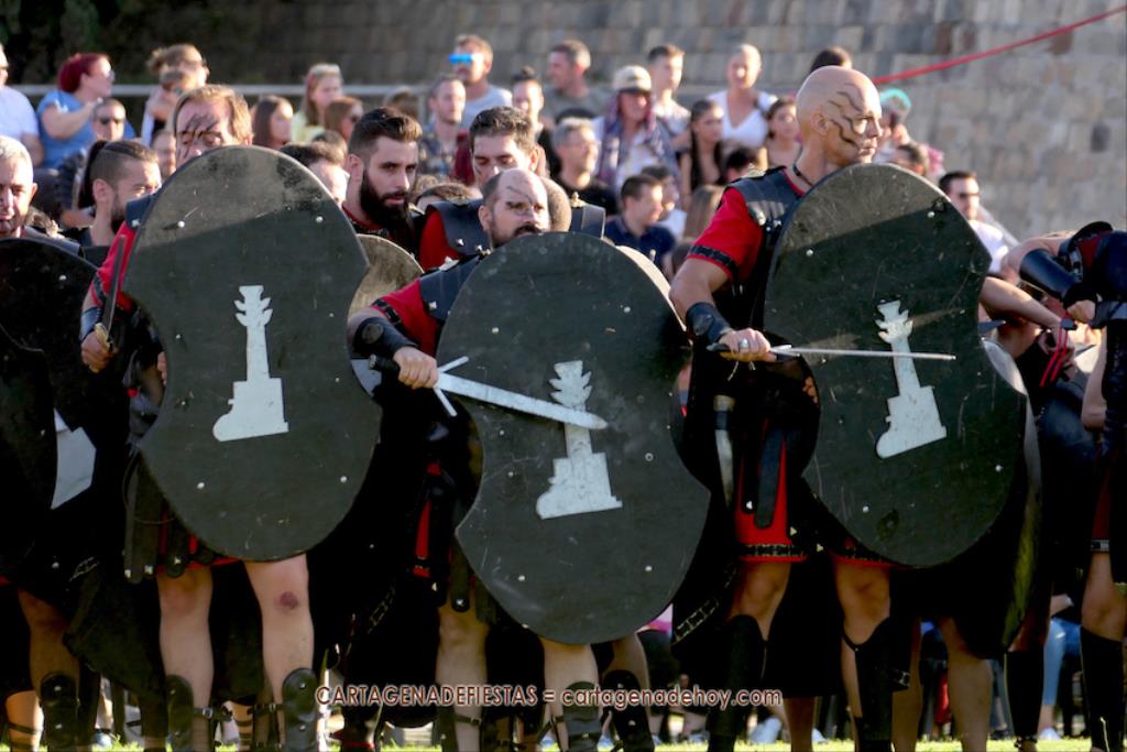 Zenón de Palus y Polibio de Megalópolis han sido los narradores de un hecho histórico que tuvo lugar hace 2.232 años en lo que hoy es Cartagena y que han representado 1.200 festeros durante una hora. "Aquí cambiará la historia", se anuncia por megafonía antes de situar a los bandos, uno en Qart-Hadast con mil o dos mil defensores y otro que ha montado campamento al otro lado del ismo con 25.000 efectivos de infantería, con 2.500 jinetes más la flota que lidera Cayo Lelio, quienes aprovechan que el ejército púnico más próximo está a diez días Los defensores de la ciudad están dispuestos a aguantar, pero la realidad es que en aquella primavera en un día tuvieron que rendir la ciudad. Bueno, vayamos al desarrollo cronológico. Magón Giscón y Escipión, ambos a caballo, se encuentro para parlamentar, pero no hay entente. El romano regresa para soltar una arenga clara. "¡Una batalla se puede ganar con armas, pero una guerra sólo con la mente. ¡Vamos a ganar!". Magón, por su parte, recalca a los suyos que lucha por no caer ante el yugo romano y seguir libres. "¡Muerte a las águilas, muerte a Roma!".