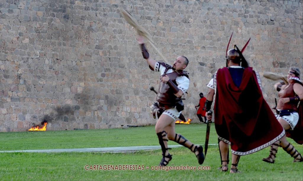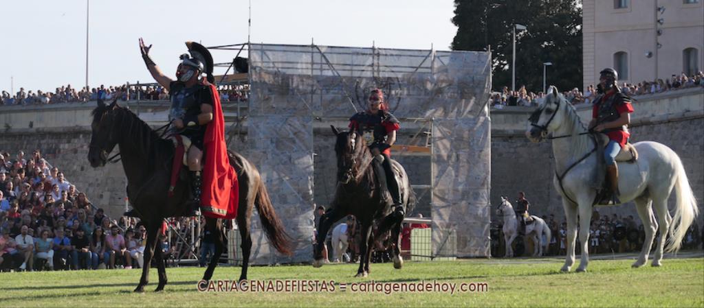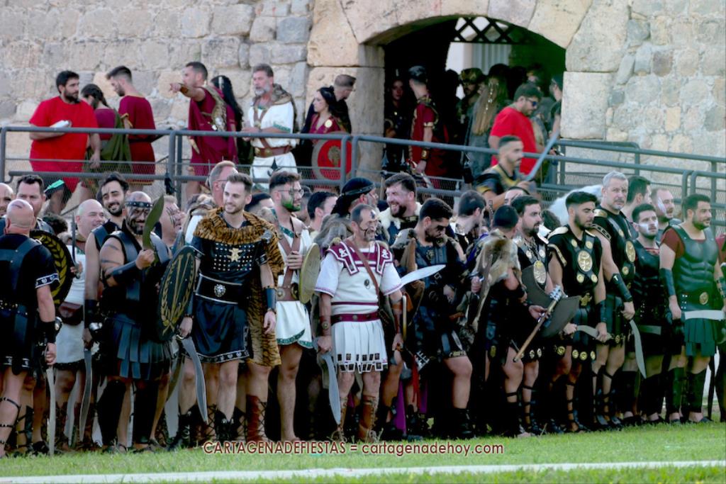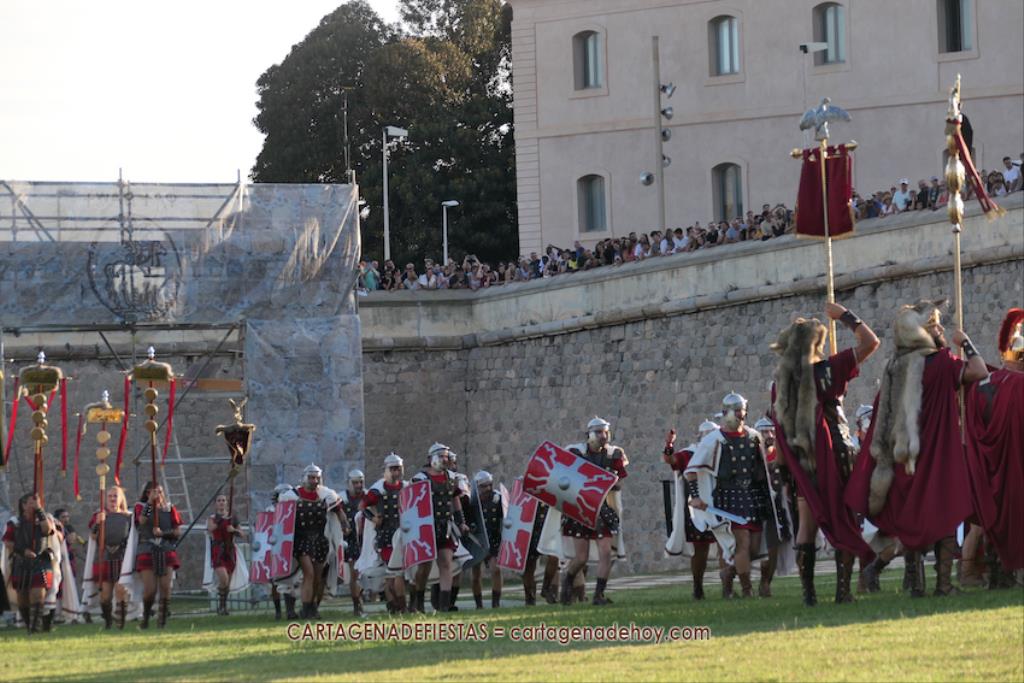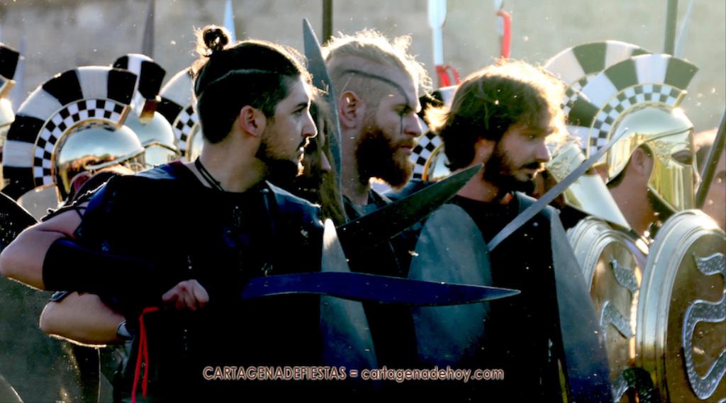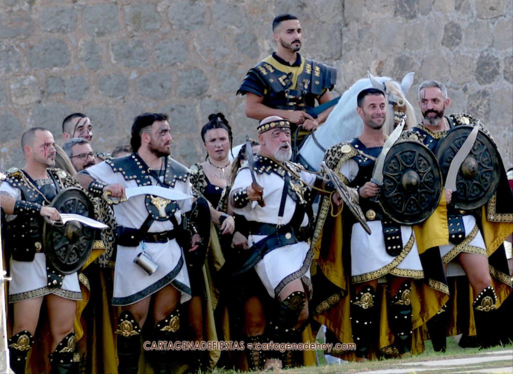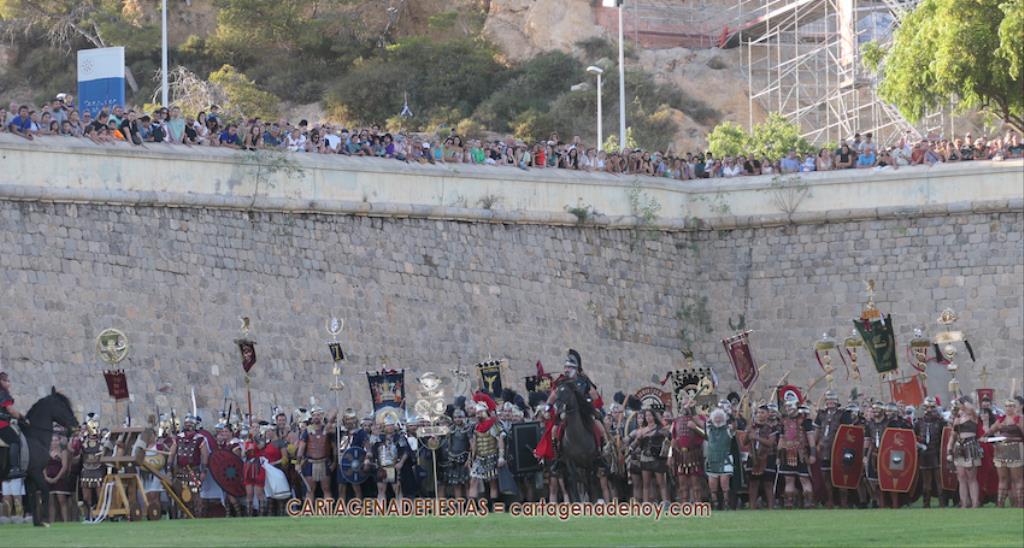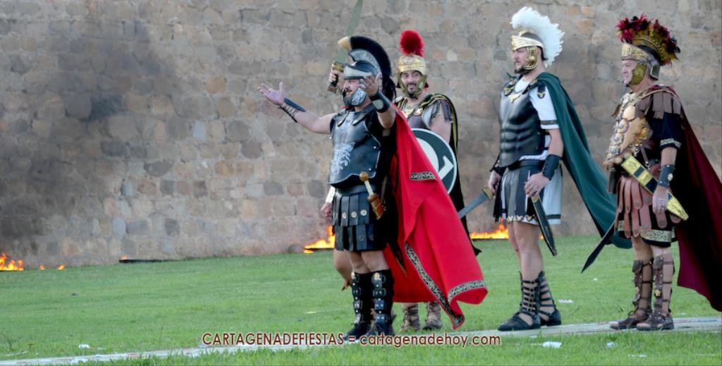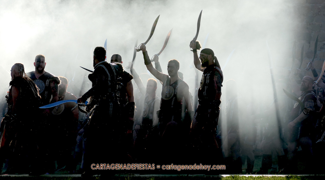 Zenón de Palus y Polibio de Megalópolis han sido los narradores de un hecho histórico que tuvo lugar hace 2.232 años en lo que hoy es Cartagena y que han representado 1.200 festeros durante una hora. "Aquí cambiará la historia", se anuncia por megafonía antes de situar a los bandos, uno en Qart-Hadast con mil o dos mil defensores y otro que ha montado campamento al otro lado del ismo con 25.000 efectivos de infantería, con 2.500 jinetes más la flota que lidera Cayo Lelio, quienes aprovechan que el ejército púnico más próximo está a diez días Los defensores de la ciudad están dispuestos a aguantar, pero la realidad es que en aquella primavera en un día tuvieron que rendir la ciudad. Bueno, vayamos al desarrollo cronológico. Magón Giscón y Escipión, ambos a caballo, se encuentro para parlamentar, pero no hay entente. El romano regresa para soltar una arenga clara. "¡Una batalla se puede ganar con armas, pero una guerra sólo con la mente. ¡Vamos a ganar!". Magón, por su parte, recalca a los suyos que lucha por no caer ante el yugo romano y seguir libres. "¡Muerte a las águilas, muerte a Roma!".