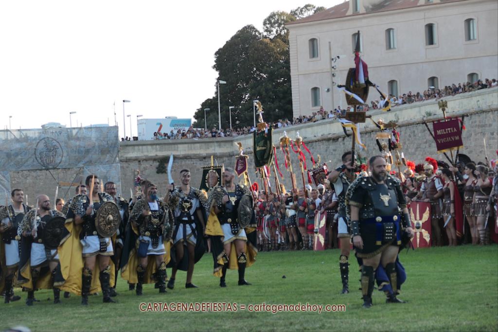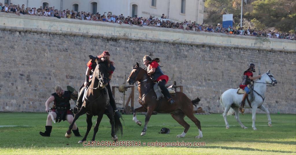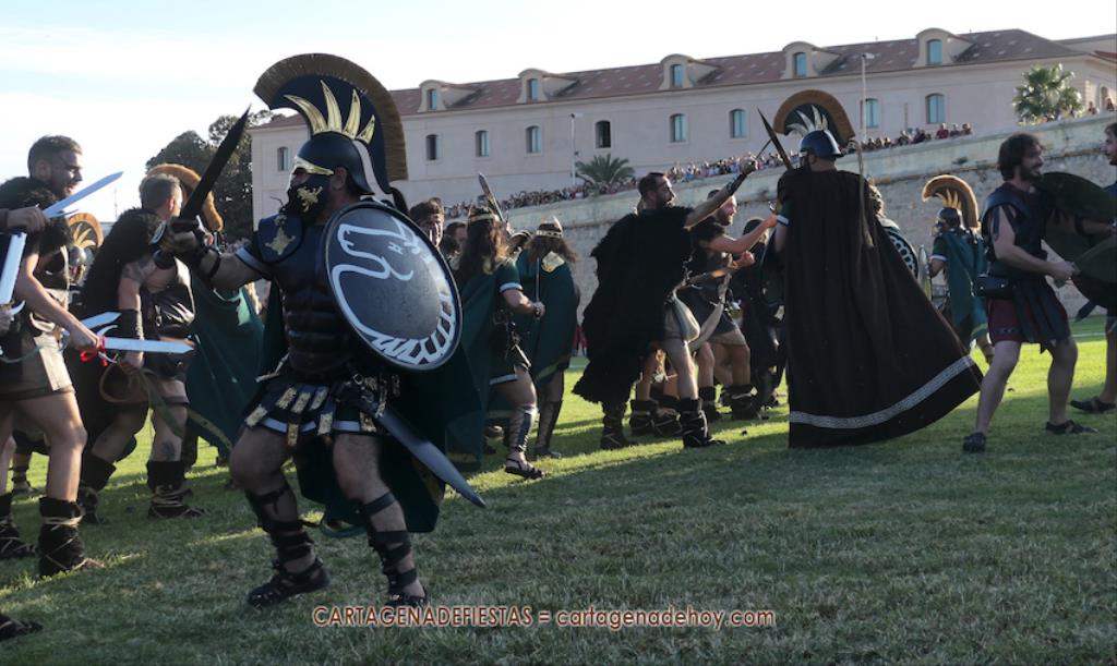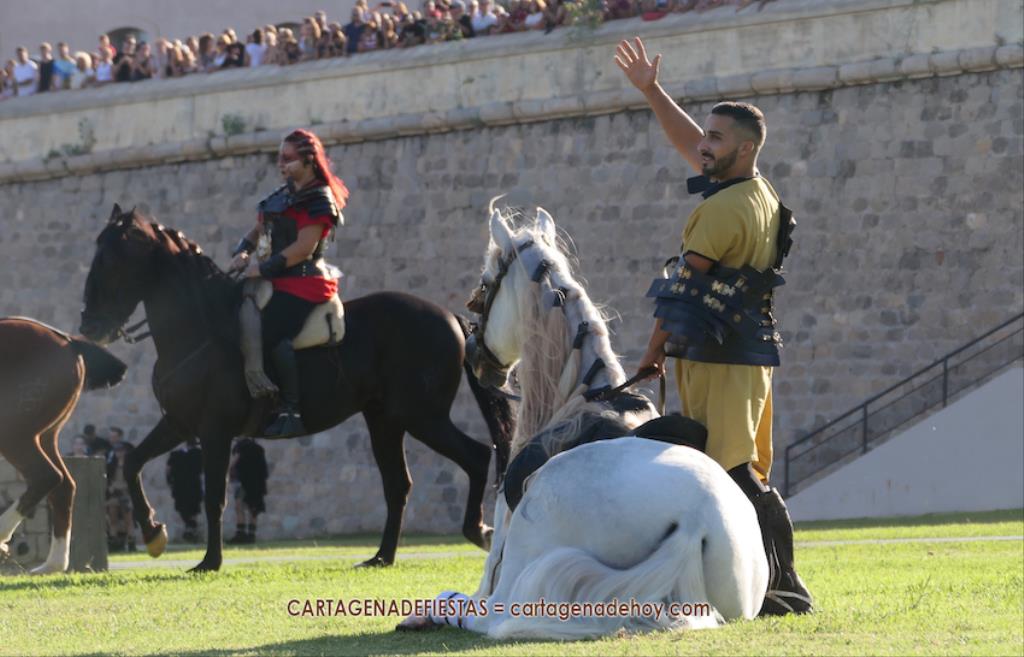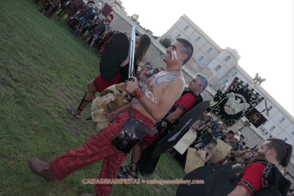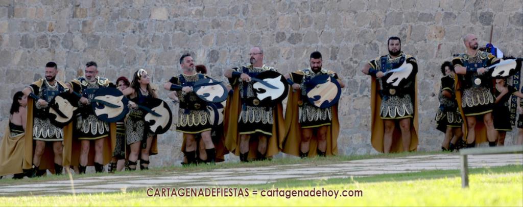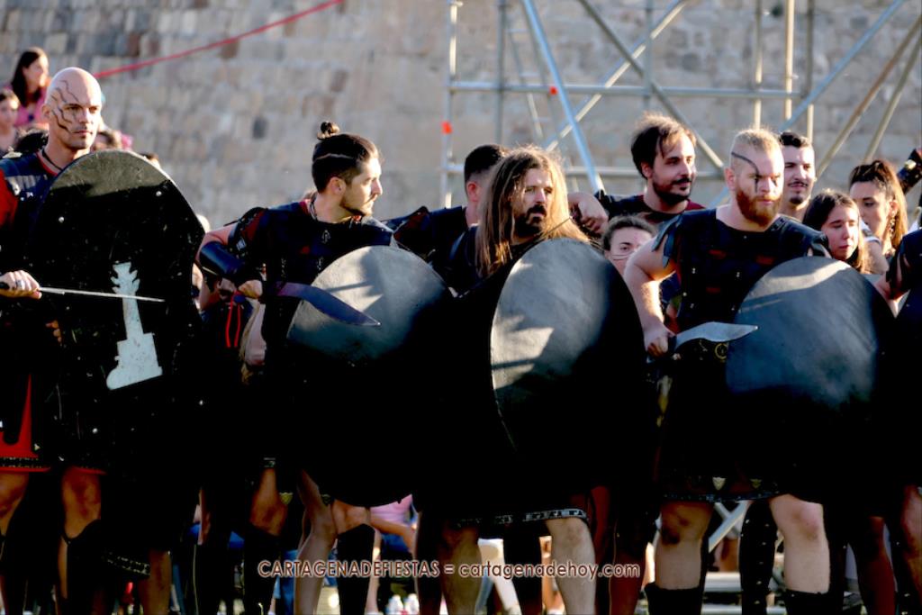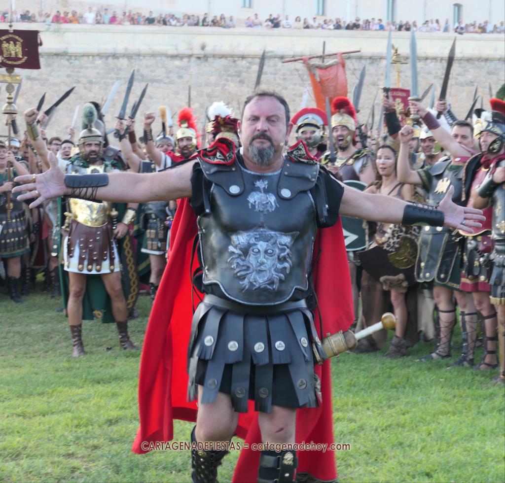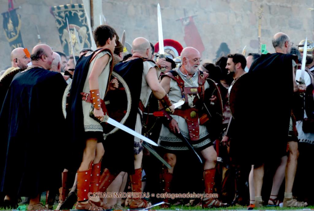 Zenón de Palus y Polibio de Megalópolis han sido los narradores de un hecho histórico que tuvo lugar hace 2.232 años en lo que hoy es Cartagena y que han representado 1.200 festeros durante una hora. "Aquí cambiará la historia", se anuncia por megafonía antes de situar a los bandos, uno en Qart-Hadast con mil o dos mil defensores y otro que ha montado campamento al otro lado del ismo con 25.000 efectivos de infantería, con 2.500 jinetes más la flota que lidera Cayo Lelio, quienes aprovechan que el ejército púnico más próximo está a diez días Los defensores de la ciudad están dispuestos a aguantar, pero la realidad es que en aquella primavera en un día tuvieron que rendir la ciudad. Bueno, vayamos al desarrollo cronológico. Magón Giscón y Escipión, ambos a caballo, se encuentro para parlamentar, pero no hay entente. El romano regresa para soltar una arenga clara. "¡Una batalla se puede ganar con armas, pero una guerra sólo con la mente. ¡Vamos a ganar!". Magón, por su parte, recalca a los suyos que lucha por no caer ante el yugo romano y seguir libres. "¡Muerte a las águilas, muerte a Roma!".