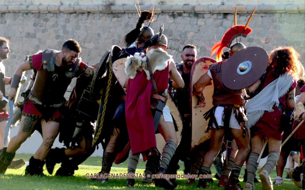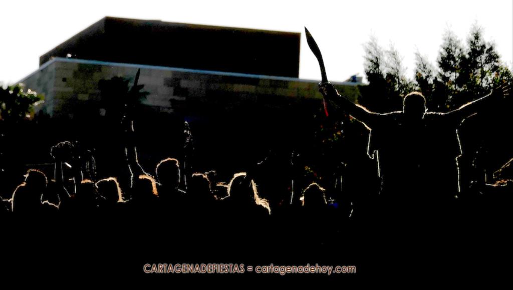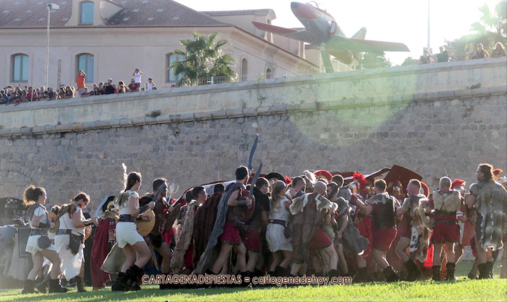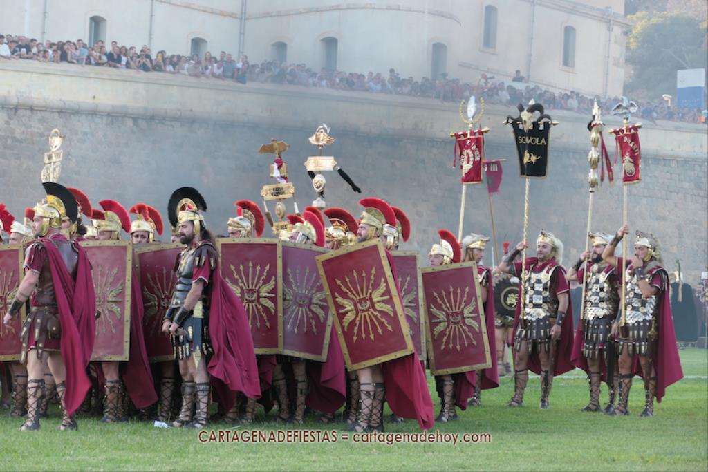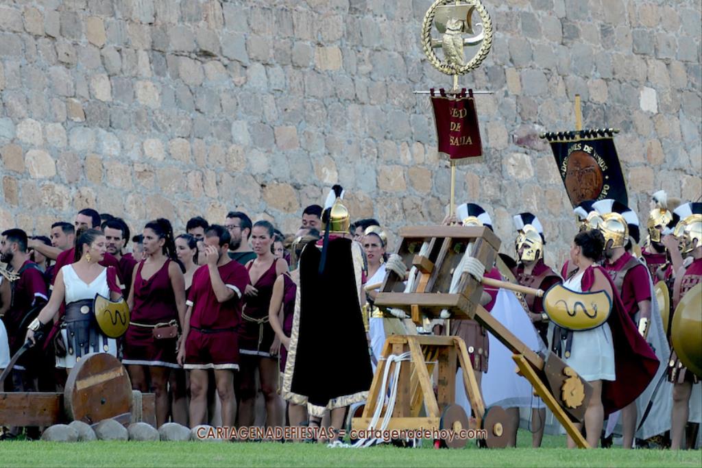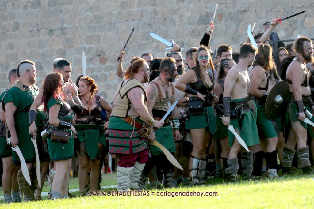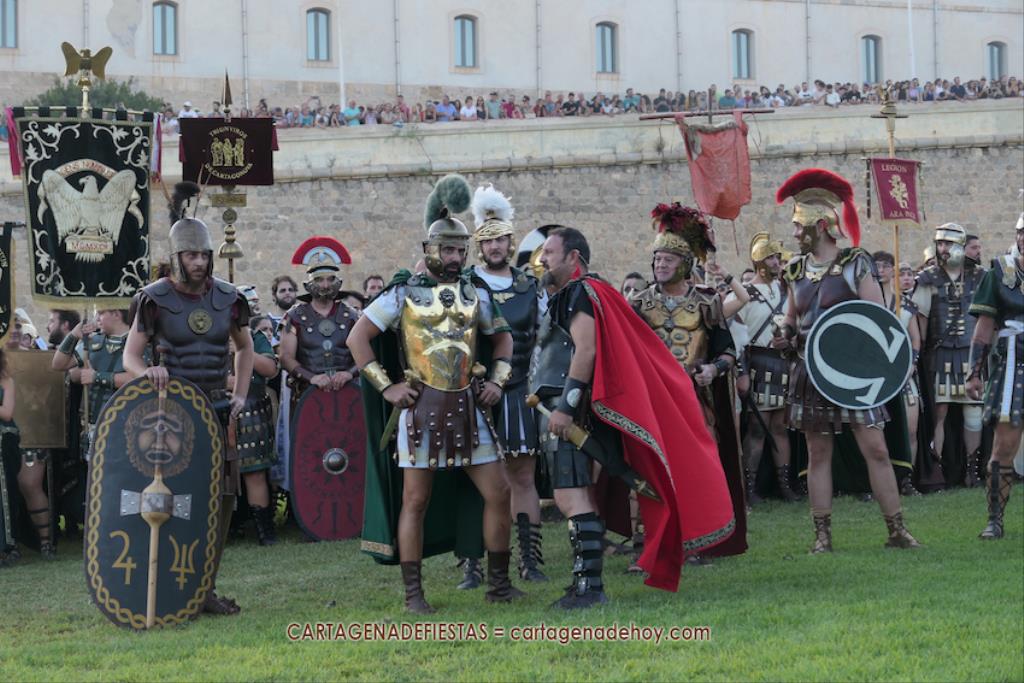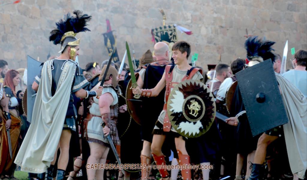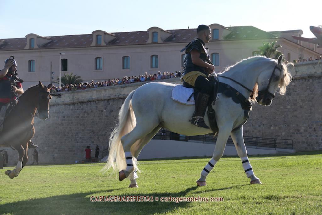 Zenón de Palus y Polibio de Megalópolis han sido los narradores de un hecho histórico que tuvo lugar hace 2.232 años en lo que hoy es Cartagena y que han representado 1.200 festeros durante una hora. "Aquí cambiará la historia", se anuncia por megafonía antes de situar a los bandos, uno en Qart-Hadast con mil o dos mil defensores y otro que ha montado campamento al otro lado del ismo con 25.000 efectivos de infantería, con 2.500 jinetes más la flota que lidera Cayo Lelio, quienes aprovechan que el ejército púnico más próximo está a diez días Los defensores de la ciudad están dispuestos a aguantar, pero la realidad es que en aquella primavera en un día tuvieron que rendir la ciudad. Bueno, vayamos al desarrollo cronológico. Magón Giscón y Escipión, ambos a caballo, se encuentro para parlamentar, pero no hay entente. El romano regresa para soltar una arenga clara. "¡Una batalla se puede ganar con armas, pero una guerra sólo con la mente. ¡Vamos a ganar!". Magón, por su parte, recalca a los suyos que lucha por no caer ante el yugo romano y seguir libres. "¡Muerte a las águilas, muerte a Roma!".