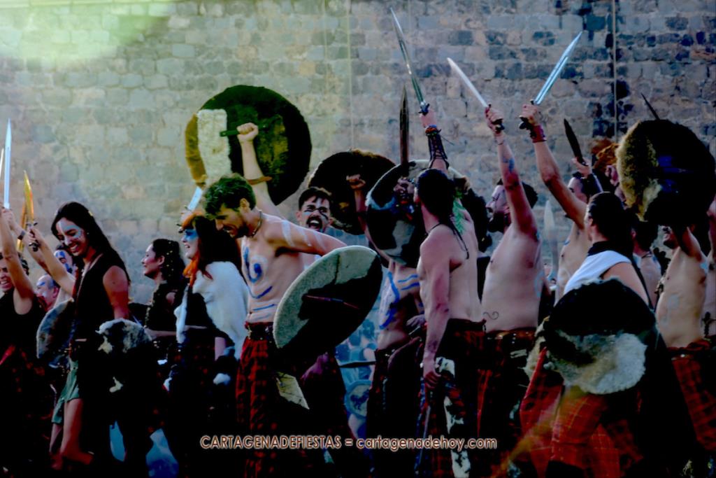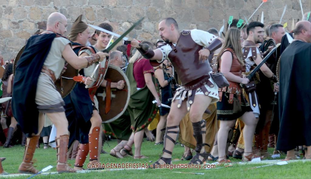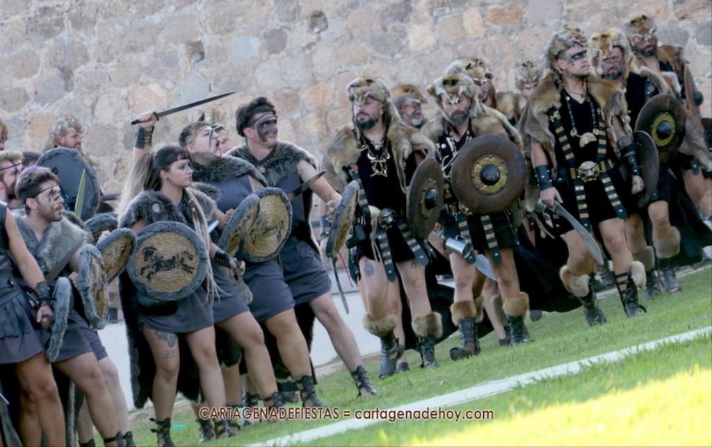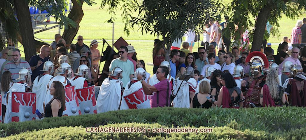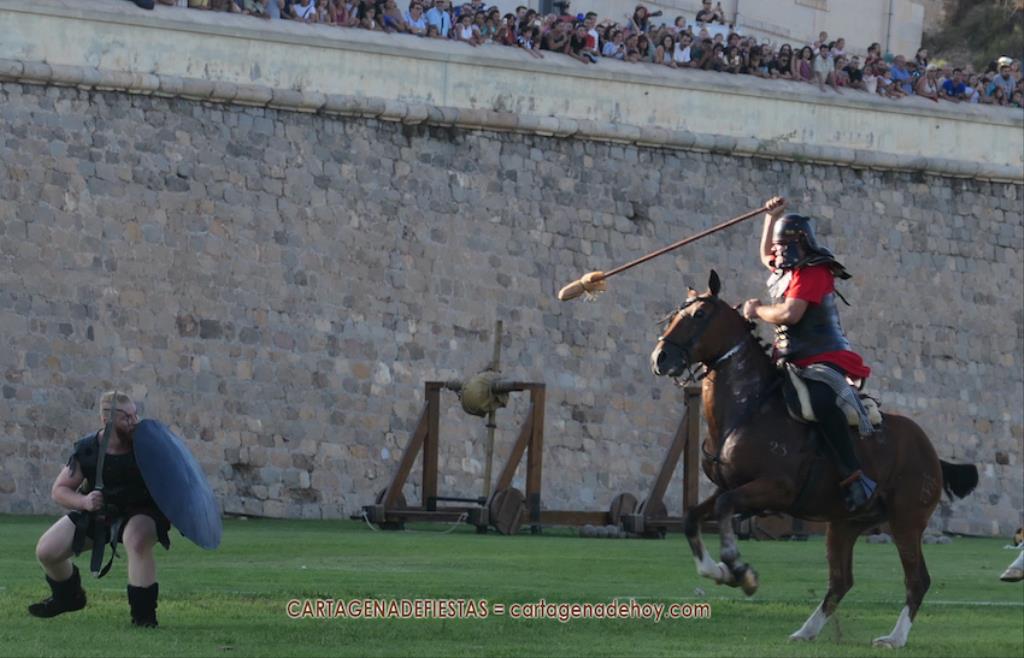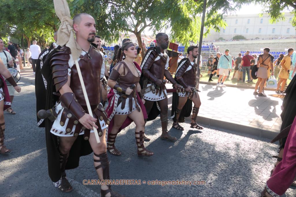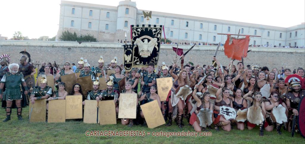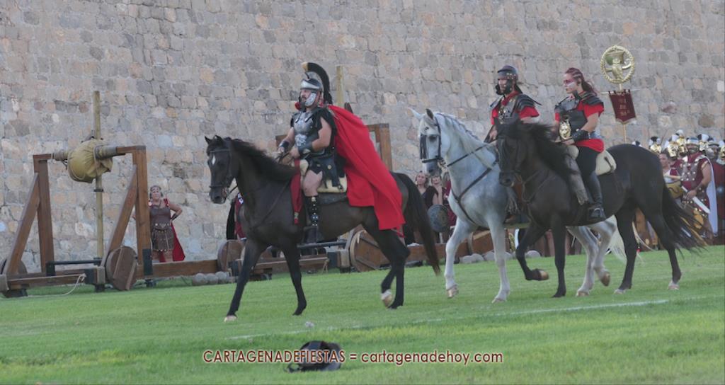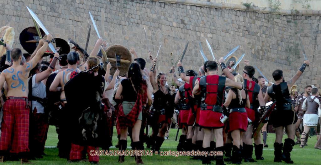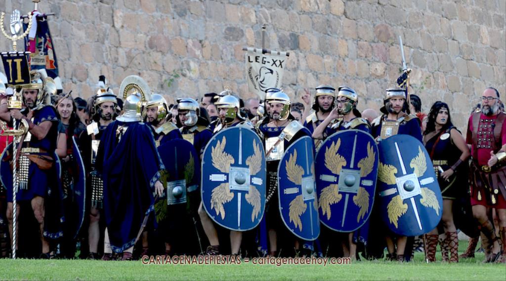 Zenón de Palus y Polibio de Megalópolis han sido los narradores de un hecho histórico que tuvo lugar hace 2.232 años en lo que hoy es Cartagena y que han representado 1.200 festeros durante una hora. "Aquí cambiará la historia", se anuncia por megafonía antes de situar a los bandos, uno en Qart-Hadast con mil o dos mil defensores y otro que ha montado campamento al otro lado del ismo con 25.000 efectivos de infantería, con 2.500 jinetes más la flota que lidera Cayo Lelio, quienes aprovechan que el ejército púnico más próximo está a diez días Los defensores de la ciudad están dispuestos a aguantar, pero la realidad es que en aquella primavera en un día tuvieron que rendir la ciudad. Bueno, vayamos al desarrollo cronológico. Magón Giscón y Escipión, ambos a caballo, se encuentro para parlamentar, pero no hay entente. El romano regresa para soltar una arenga clara. "¡Una batalla se puede ganar con armas, pero una guerra sólo con la mente. ¡Vamos a ganar!". Magón, por su parte, recalca a los suyos que lucha por no caer ante el yugo romano y seguir libres. "¡Muerte a las águilas, muerte a Roma!".