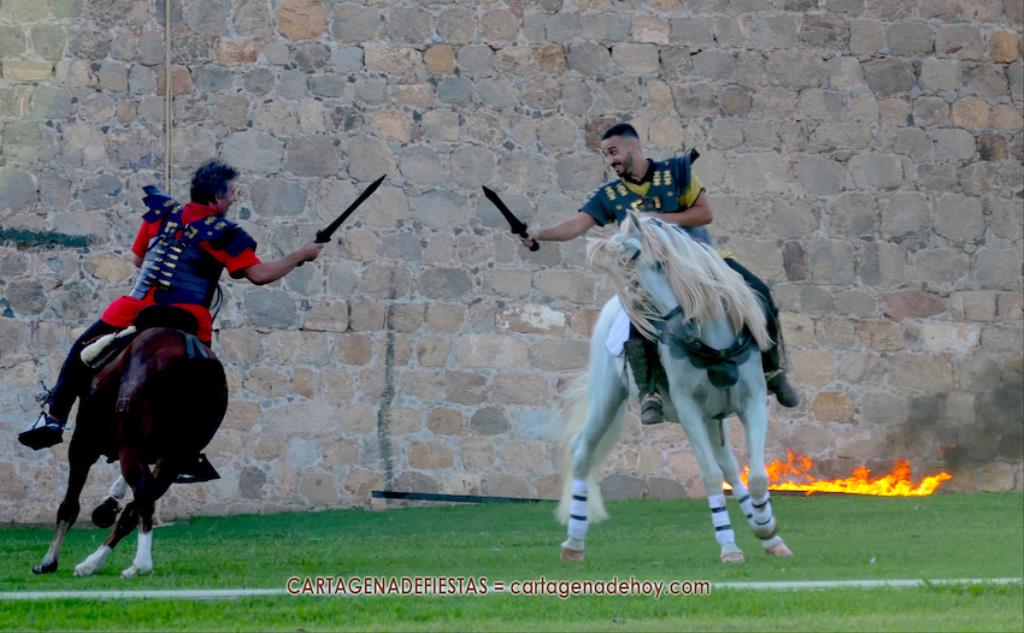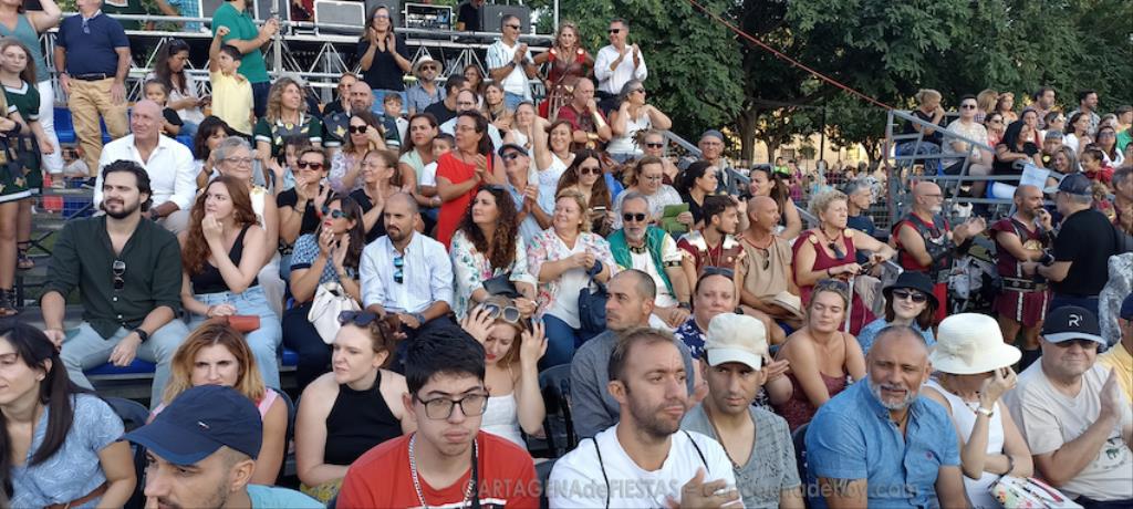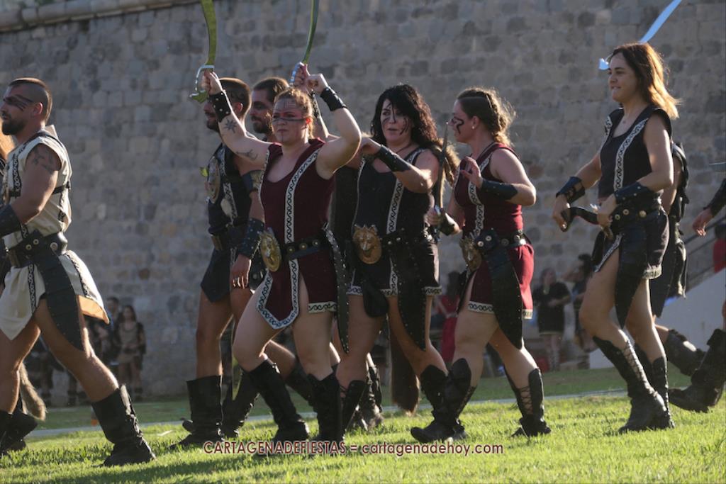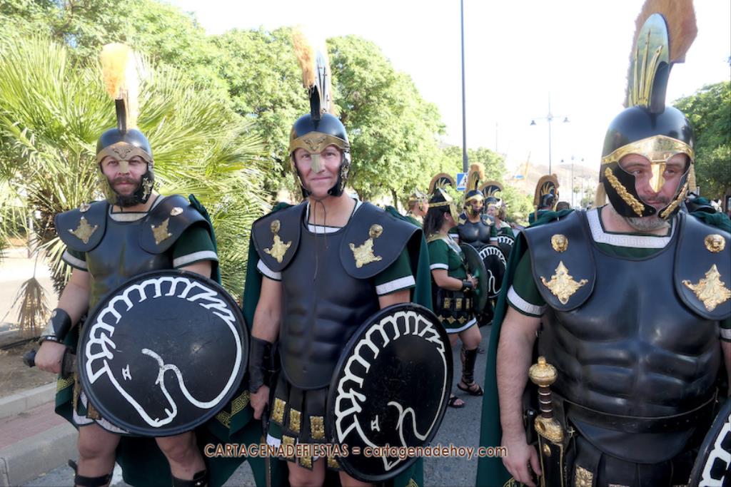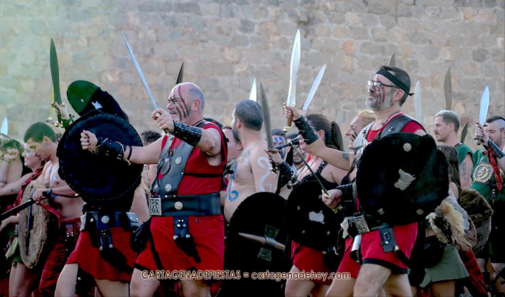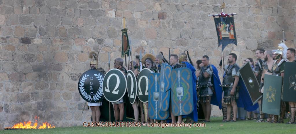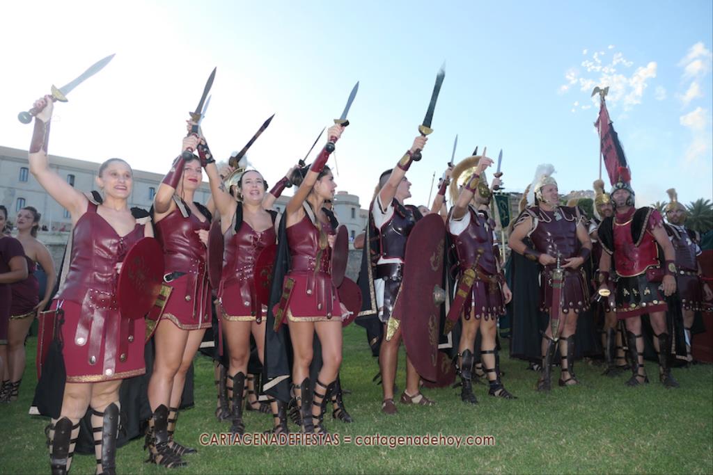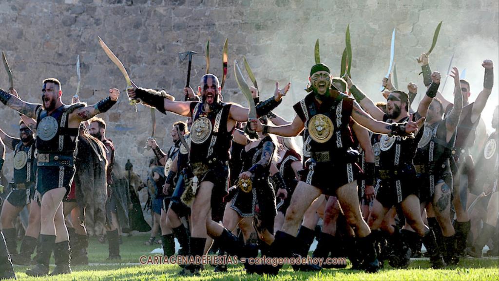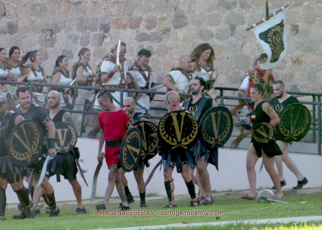 Zenón de Palus y Polibio de Megalópolis han sido los narradores de un hecho histórico que tuvo lugar hace 2.232 años en lo que hoy es Cartagena y que han representado 1.200 festeros durante una hora. "Aquí cambiará la historia", se anuncia por megafonía antes de situar a los bandos, uno en Qart-Hadast con mil o dos mil defensores y otro que ha montado campamento al otro lado del ismo con 25.000 efectivos de infantería, con 2.500 jinetes más la flota que lidera Cayo Lelio, quienes aprovechan que el ejército púnico más próximo está a diez días Los defensores de la ciudad están dispuestos a aguantar, pero la realidad es que en aquella primavera en un día tuvieron que rendir la ciudad. Bueno, vayamos al desarrollo cronológico. Magón Giscón y Escipión, ambos a caballo, se encuentro para parlamentar, pero no hay entente. El romano regresa para soltar una arenga clara. "¡Una batalla se puede ganar con armas, pero una guerra sólo con la mente. ¡Vamos a ganar!". Magón, por su parte, recalca a los suyos que lucha por no caer ante el yugo romano y seguir libres. "¡Muerte a las águilas, muerte a Roma!".