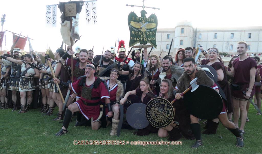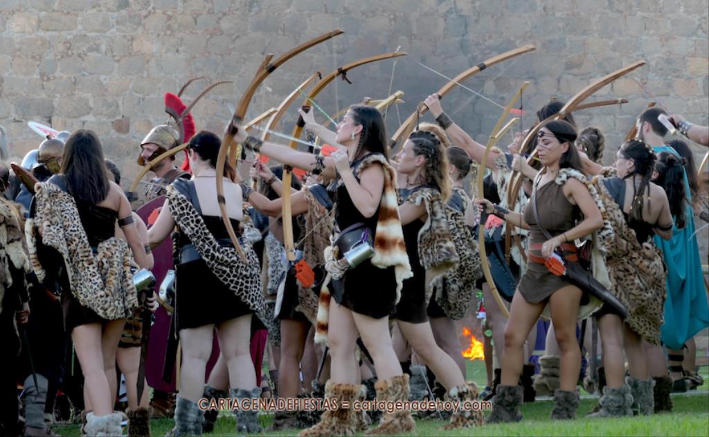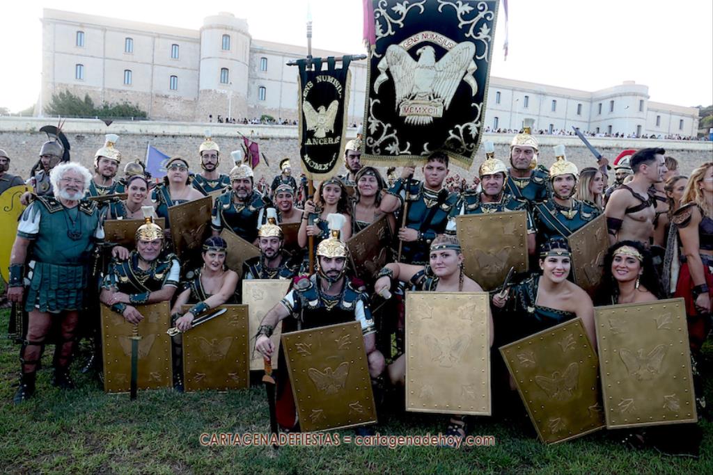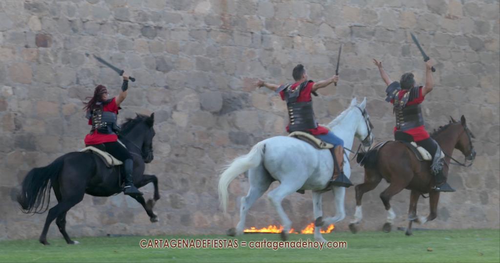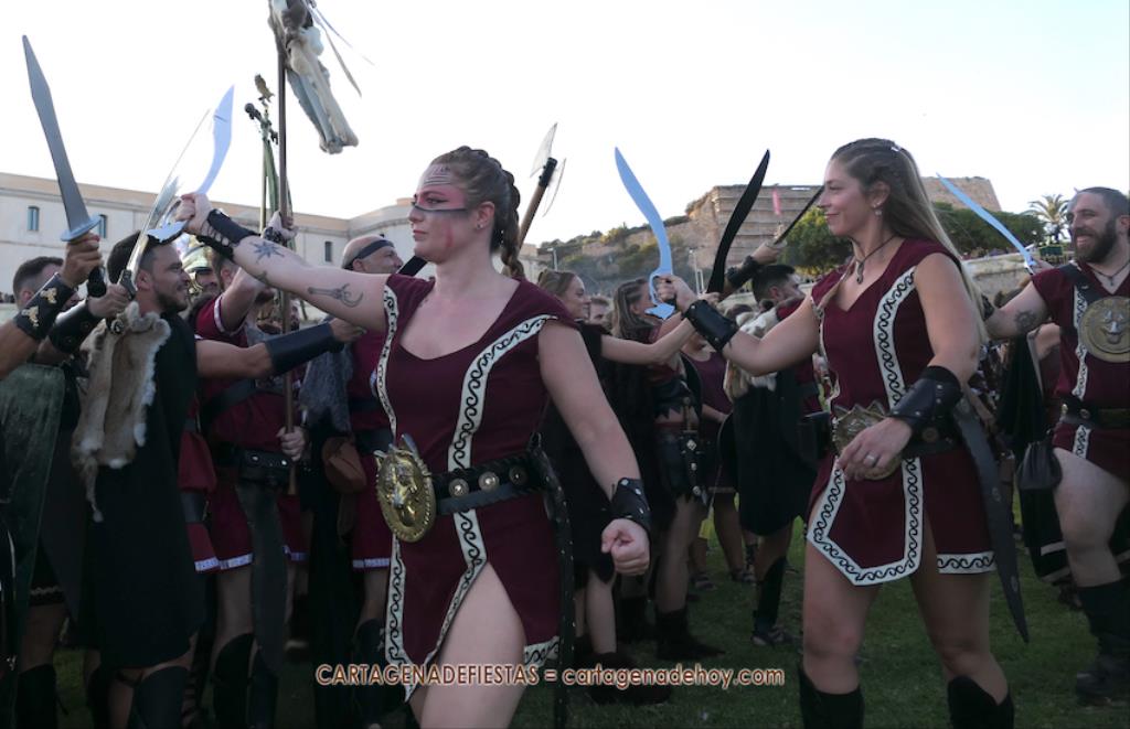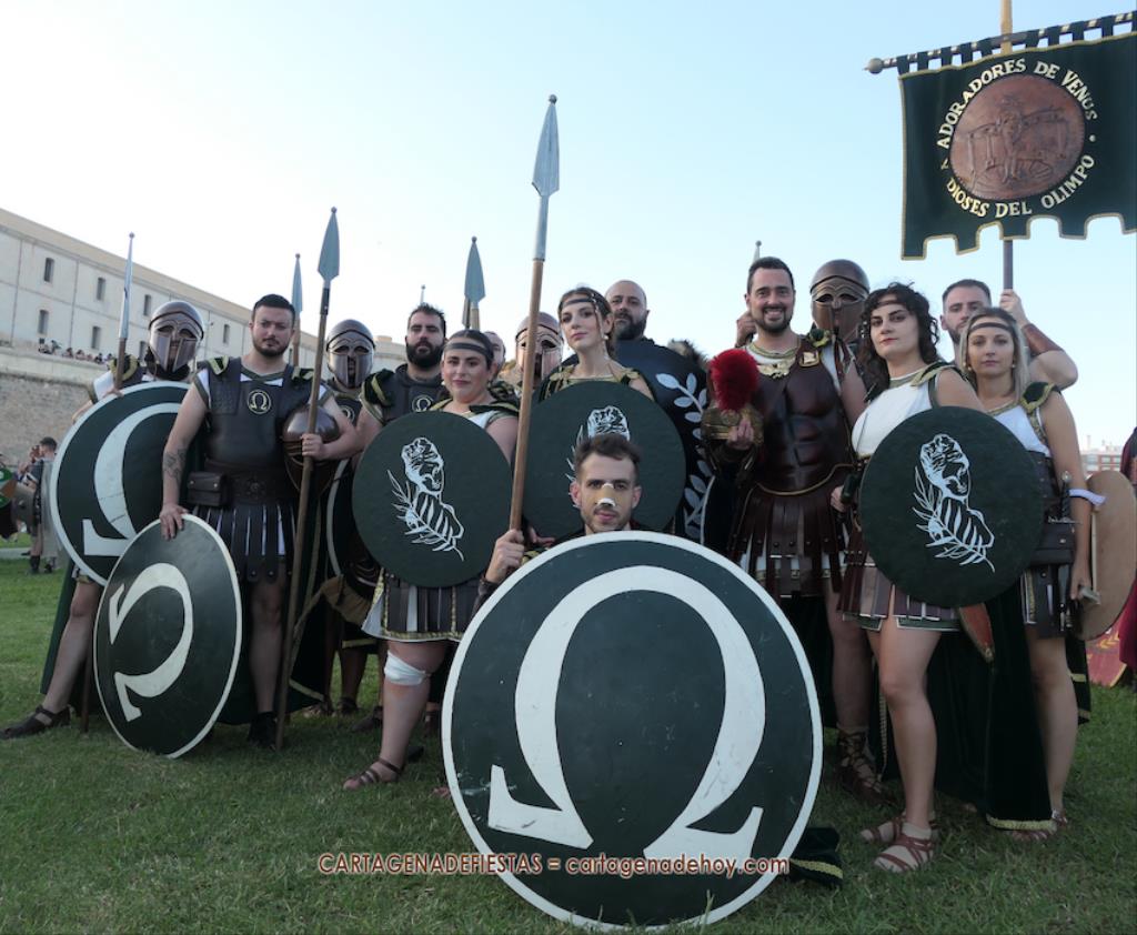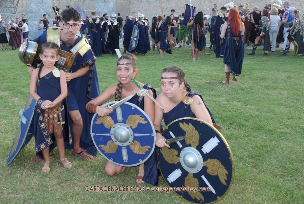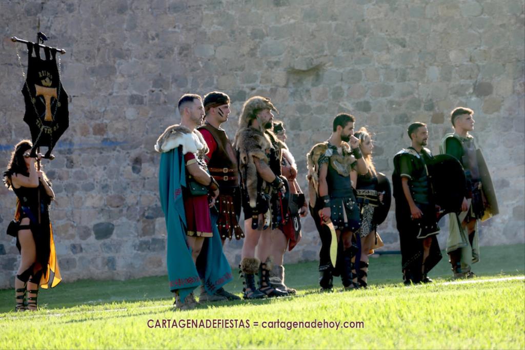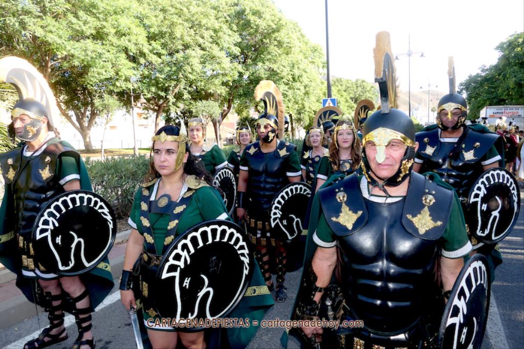 Zenón de Palus y Polibio de Megalópolis han sido los narradores de un hecho histórico que tuvo lugar hace 2.232 años en lo que hoy es Cartagena y que han representado 1.200 festeros durante una hora. "Aquí cambiará la historia", se anuncia por megafonía antes de situar a los bandos, uno en Qart-Hadast con mil o dos mil defensores y otro que ha montado campamento al otro lado del ismo con 25.000 efectivos de infantería, con 2.500 jinetes más la flota que lidera Cayo Lelio, quienes aprovechan que el ejército púnico más próximo está a diez días Los defensores de la ciudad están dispuestos a aguantar, pero la realidad es que en aquella primavera en un día tuvieron que rendir la ciudad. Bueno, vayamos al desarrollo cronológico. Magón Giscón y Escipión, ambos a caballo, se encuentro para parlamentar, pero no hay entente. El romano regresa para soltar una arenga clara. "¡Una batalla se puede ganar con armas, pero una guerra sólo con la mente. ¡Vamos a ganar!". Magón, por su parte, recalca a los suyos que lucha por no caer ante el yugo romano y seguir libres. "¡Muerte a las águilas, muerte a Roma!".