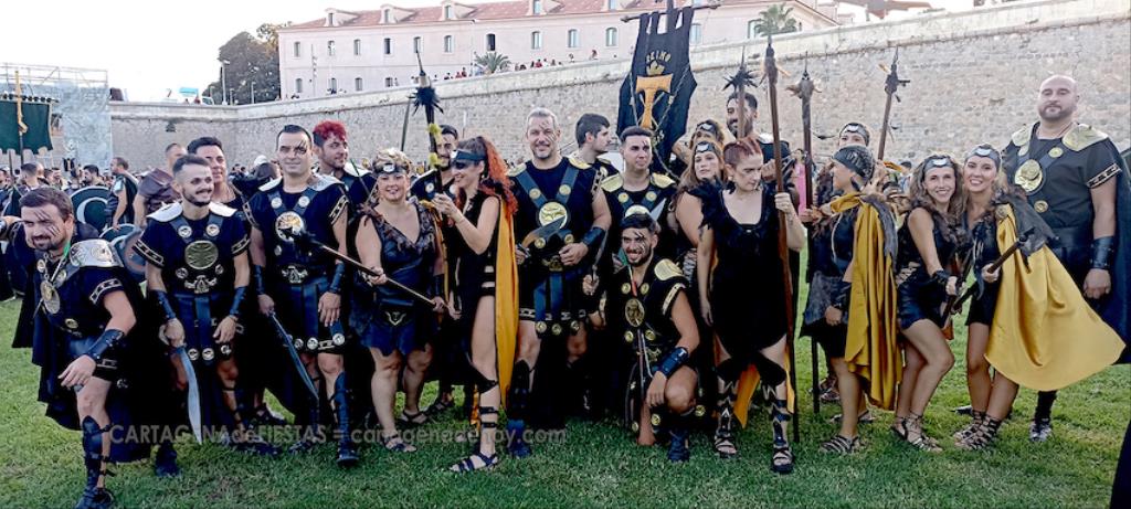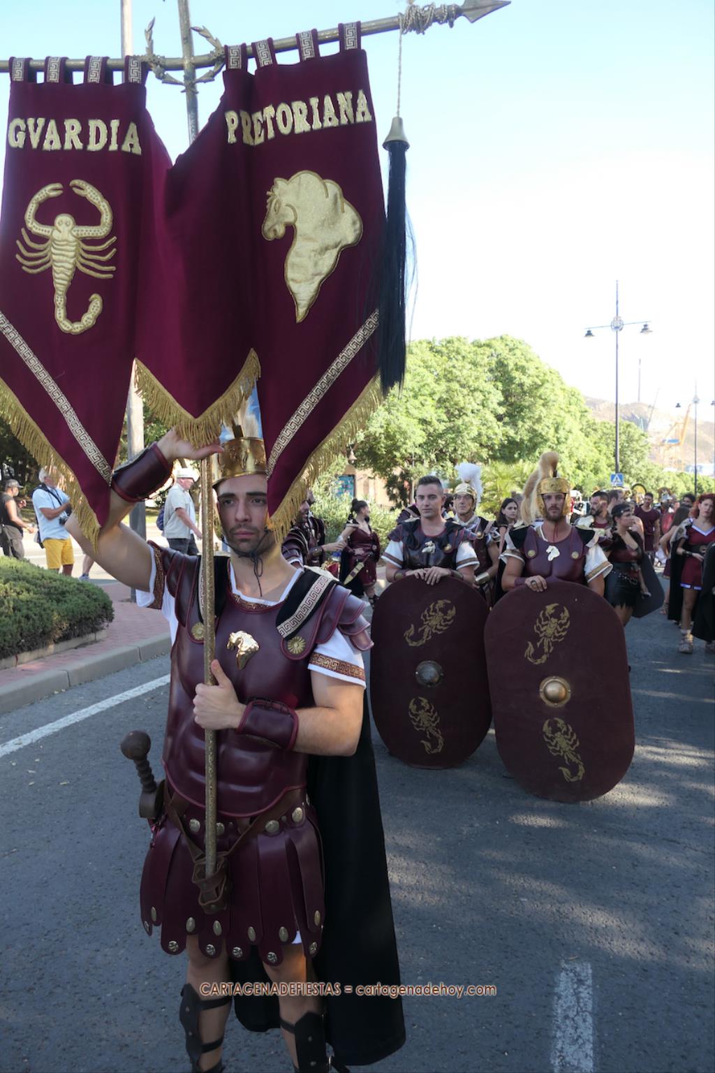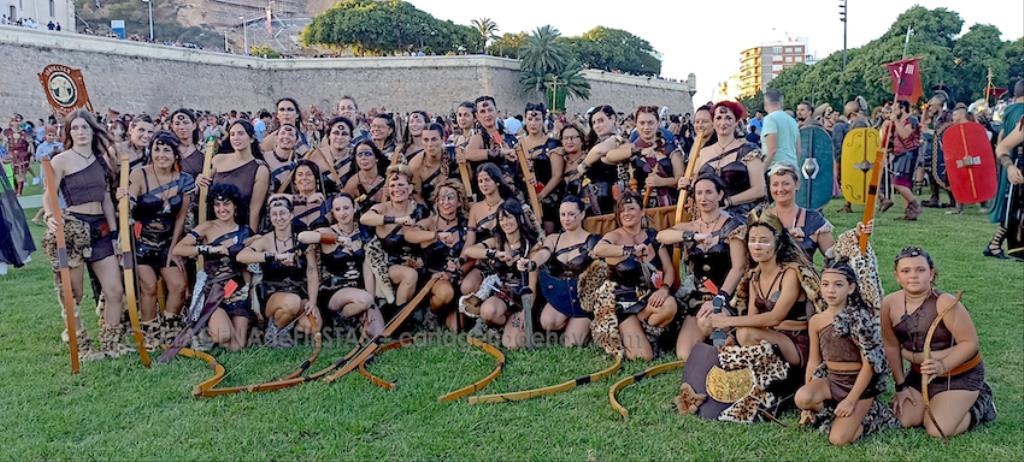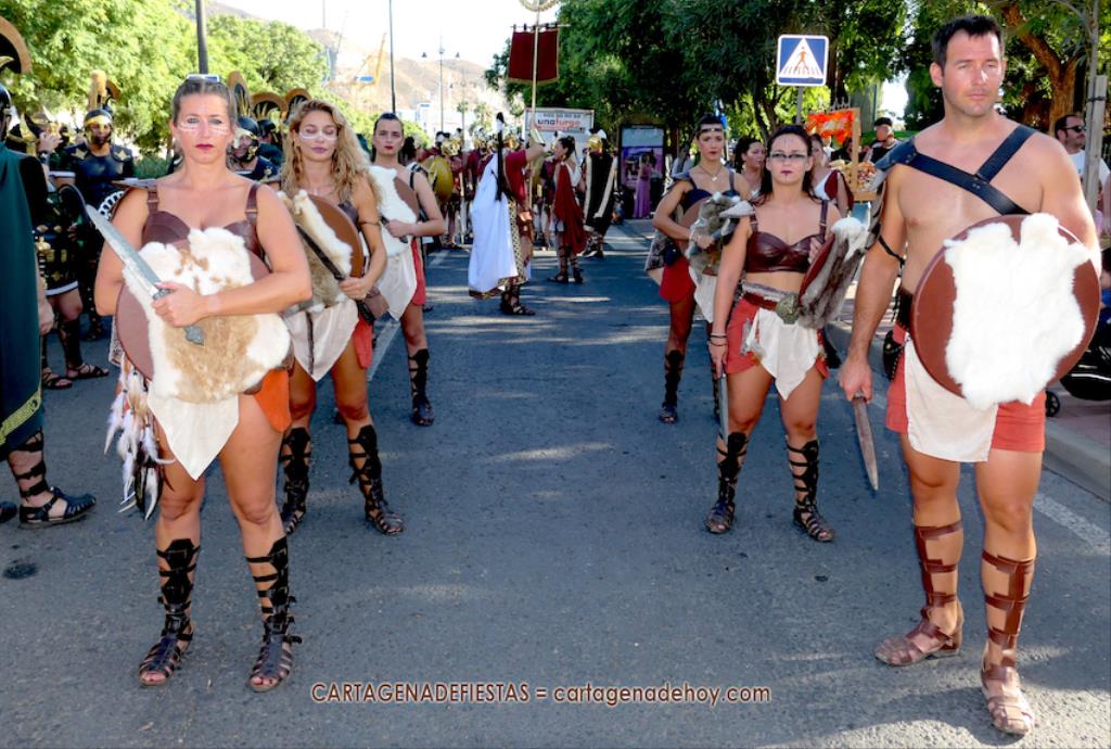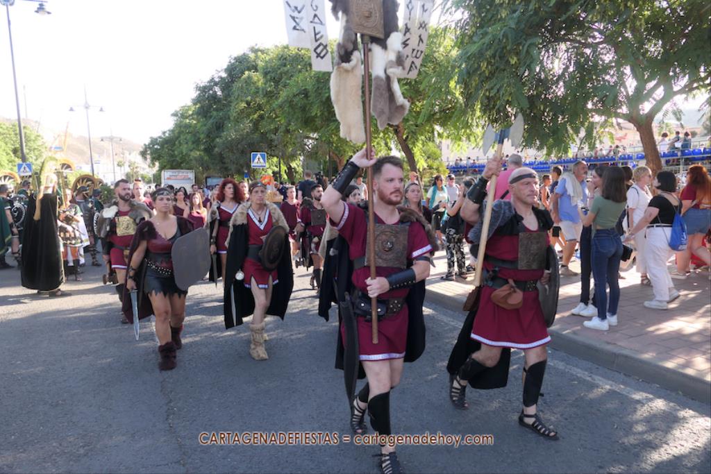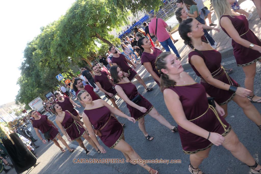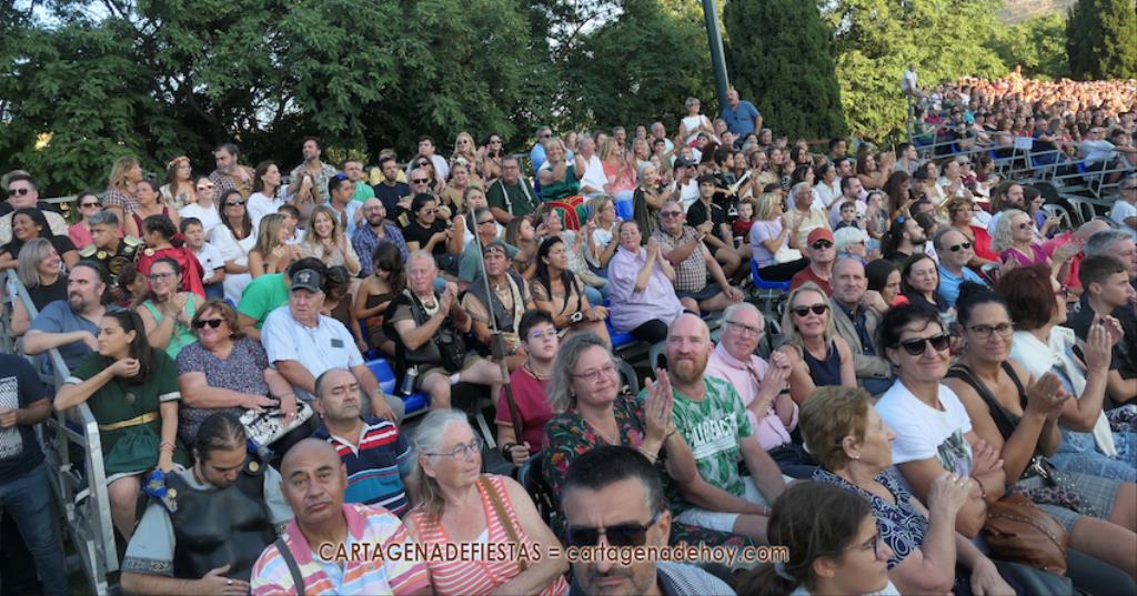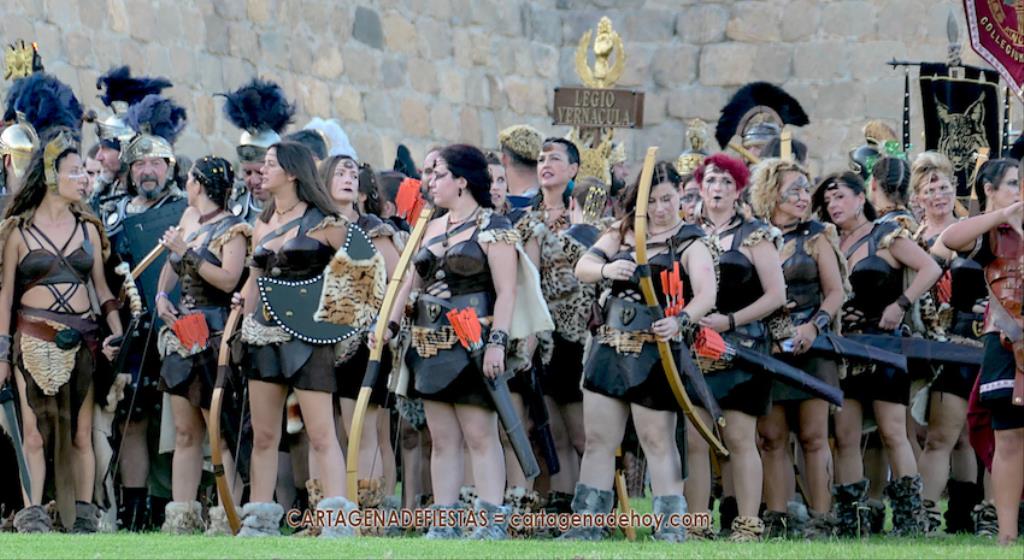 Zenón de Palus y Polibio de Megalópolis han sido los narradores de un hecho histórico que tuvo lugar hace 2.232 años en lo que hoy es Cartagena y que han representado 1.200 festeros durante una hora. "Aquí cambiará la historia", se anuncia por megafonía antes de situar a los bandos, uno en Qart-Hadast con mil o dos mil defensores y otro que ha montado campamento al otro lado del ismo con 25.000 efectivos de infantería, con 2.500 jinetes más la flota que lidera Cayo Lelio, quienes aprovechan que el ejército púnico más próximo está a diez días Los defensores de la ciudad están dispuestos a aguantar, pero la realidad es que en aquella primavera en un día tuvieron que rendir la ciudad. Bueno, vayamos al desarrollo cronológico. Magón Giscón y Escipión, ambos a caballo, se encuentro para parlamentar, pero no hay entente. El romano regresa para soltar una arenga clara. "¡Una batalla se puede ganar con armas, pero una guerra sólo con la mente. ¡Vamos a ganar!". Magón, por su parte, recalca a los suyos que lucha por no caer ante el yugo romano y seguir libres. "¡Muerte a las águilas, muerte a Roma!".