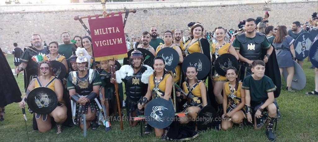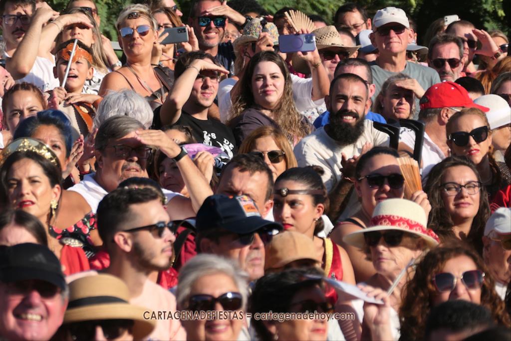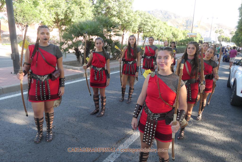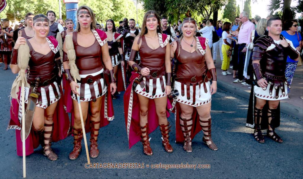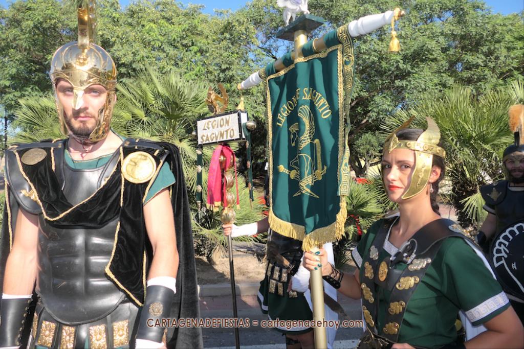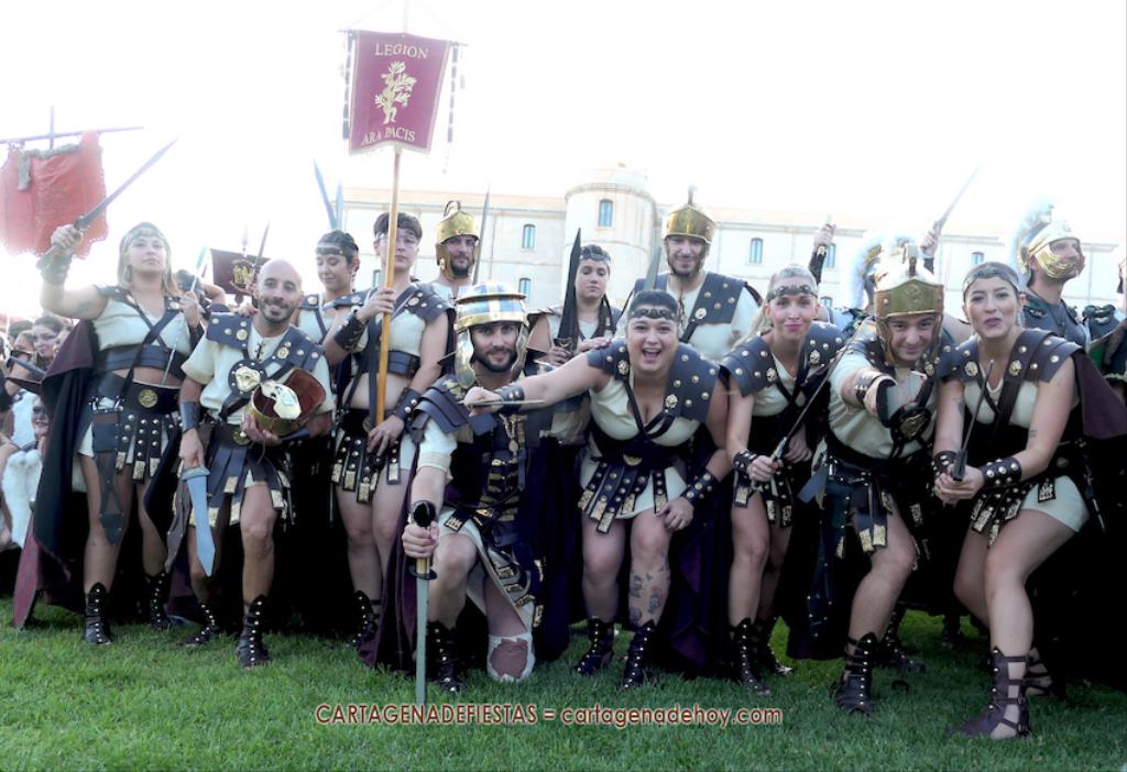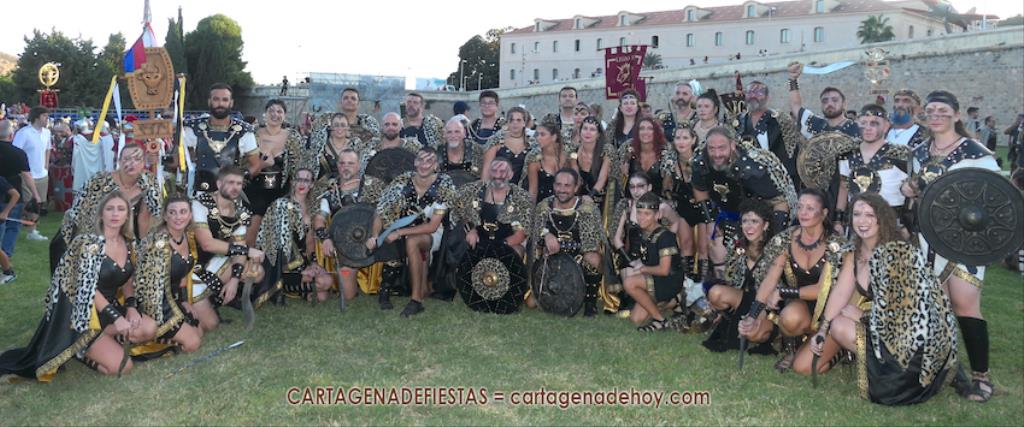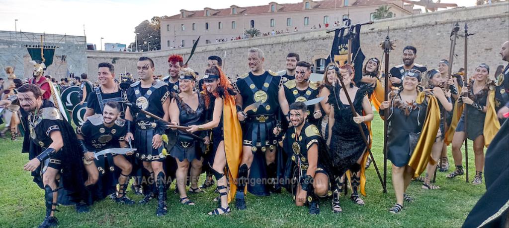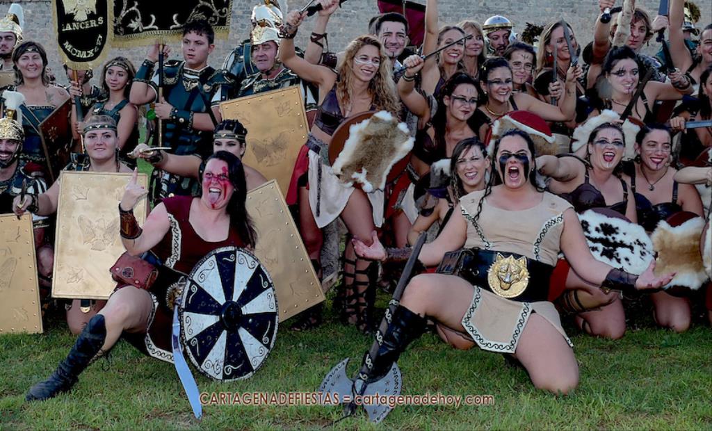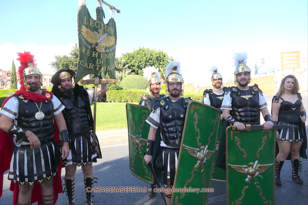 Zenón de Palus y Polibio de Megalópolis han sido los narradores de un hecho histórico que tuvo lugar hace 2.232 años en lo que hoy es Cartagena y que han representado 1.200 festeros durante una hora. "Aquí cambiará la historia", se anuncia por megafonía antes de situar a los bandos, uno en Qart-Hadast con mil o dos mil defensores y otro que ha montado campamento al otro lado del ismo con 25.000 efectivos de infantería, con 2.500 jinetes más la flota que lidera Cayo Lelio, quienes aprovechan que el ejército púnico más próximo está a diez días Los defensores de la ciudad están dispuestos a aguantar, pero la realidad es que en aquella primavera en un día tuvieron que rendir la ciudad. Bueno, vayamos al desarrollo cronológico. Magón Giscón y Escipión, ambos a caballo, se encuentro para parlamentar, pero no hay entente. El romano regresa para soltar una arenga clara. "¡Una batalla se puede ganar con armas, pero una guerra sólo con la mente. ¡Vamos a ganar!". Magón, por su parte, recalca a los suyos que lucha por no caer ante el yugo romano y seguir libres. "¡Muerte a las águilas, muerte a Roma!".