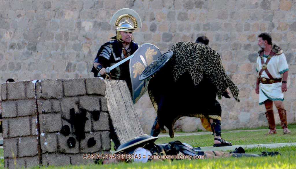 La primera aproximación romana la repelen los defensores, que después atacan en unos primeros enfrentamientos enriquecidos con hondas, flechas, lanzas y catapultas. El peligro para los púnicos no se había disipado. Hay un duelo con caballería y el segundo enfrentamiento, bastante vistoso. Los romanos van ganando metros y ya están cerca de la puerta de Qart-Hadast. "Carthago no se rinde", grita Magón. "¡Muerte o victoria!", por su parte, es el grito que precede a la última oleada de 'las águilas', en la que rodean al enemigo con el apoyo de los hombres de Cayo Lelio, que, según la historia, aprovecharon la bajada de la marea para sorprender a los residentes por otro lado de las murallas. Por cierto, durante este tramo se escucha que íberos y celtas han aceptado la oferta de Escipión, cambiando de bando. A las siete y cinco de la tarde se escucha: "¡Victoria!". Sobre la muralla se encienden las rojas antorchas de los 'extraordinarii' y sobre el terreno se lleva a cabo la rendición de Magón Giscón ante un magnánimo Escipión, quien acepta darle un salvoconducto a los derrotados. Tengo entendido que la historia no fue así y que el vencedor, como era normal, arrasaba con el vencido en ésta y en otras innumerables batallas, pero estamos en fiestas y no está mal el final feliz. Por cierto, también está escrito que Magón Barca días más tarde trató después de reconquistar la plaza, pero no lo consiguió..., pero eso es otra historia.