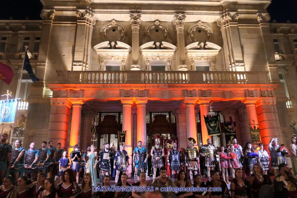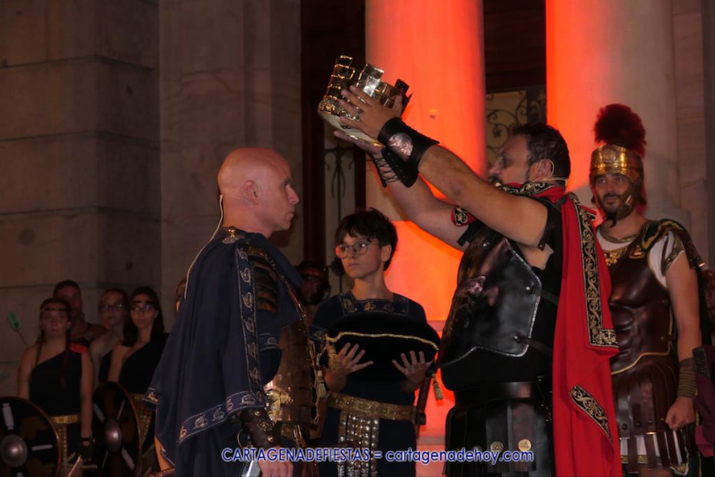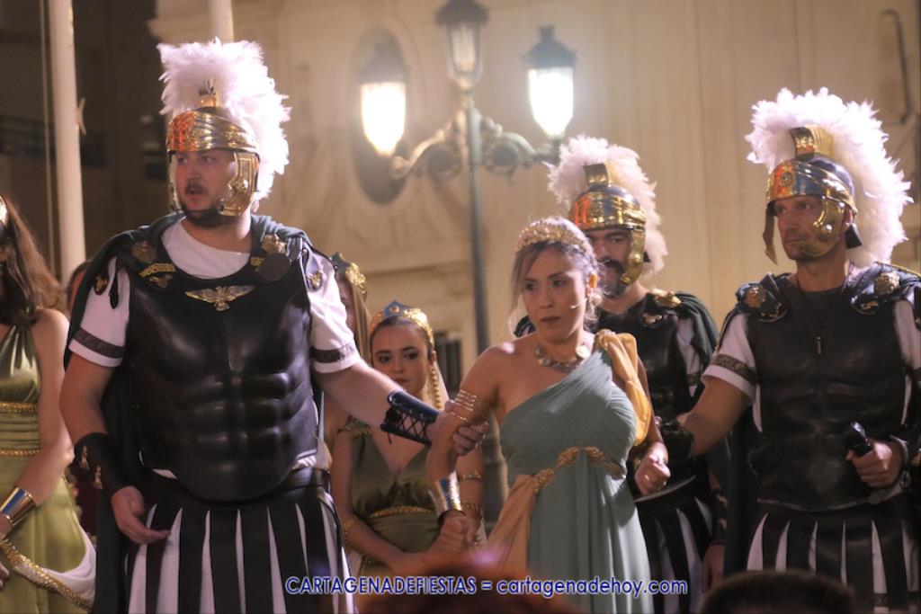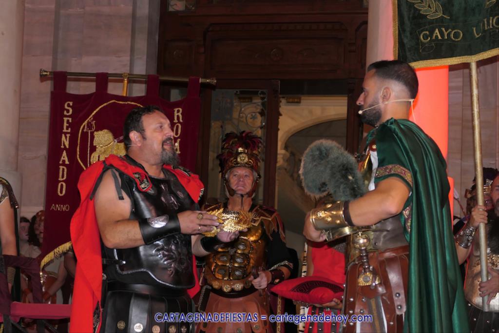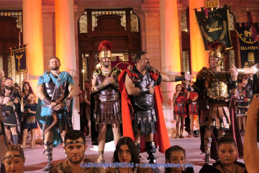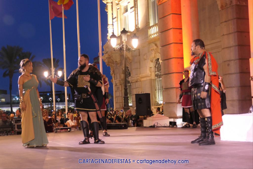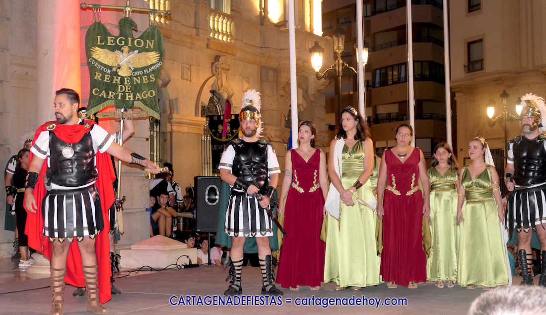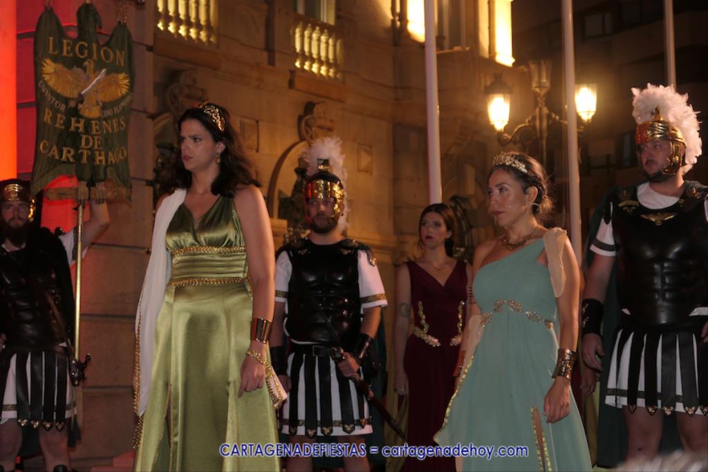 En la fachada del Palacio Consistorial tiene lugar el siguiente capítulo de los victoriosos romanos con un acto de veinte minutos dividido en tres capítulos. El primero es para liberar a los rehenes (con la condición de aliarse a Roma) que tenía Aníbal dentro de la ciudad, incluidos los nobles íberos, entre los que hay una joven a la que los legionarios ofrecen a Escipión, pero irrumpe su amado, el príncipe Alucio, y conquistador romano mostrará su clemencia accediendo a las peticiones de los amados y de la esposa de Mandonia, que también intercedió por la chica.