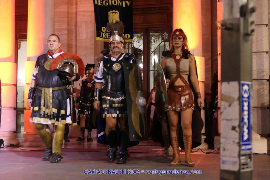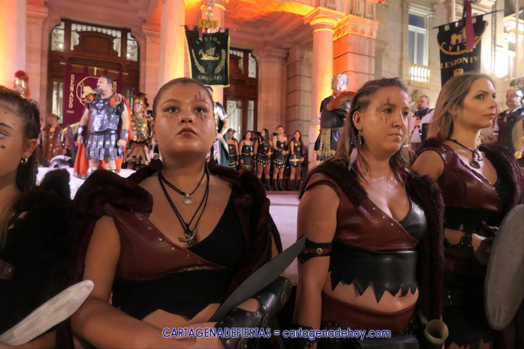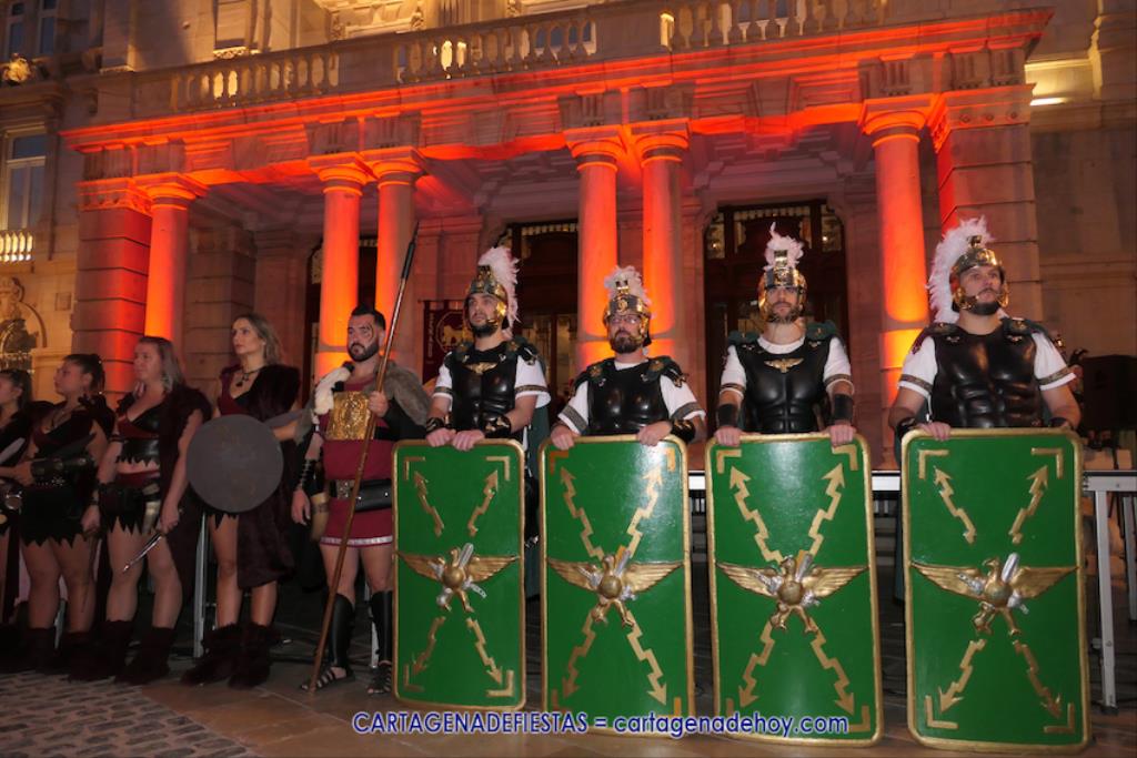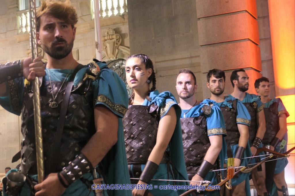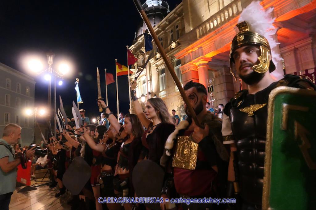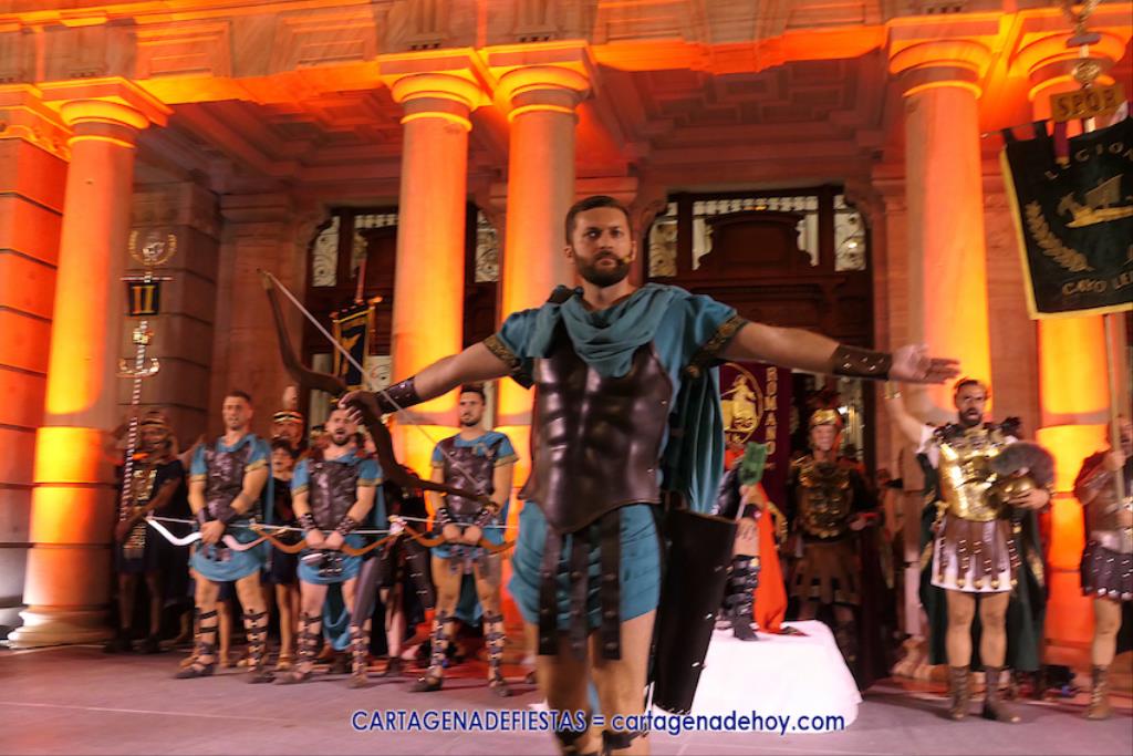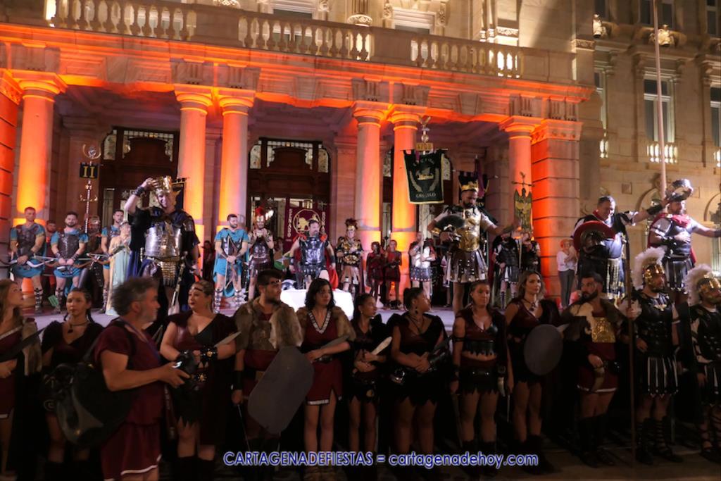 En la fachada del Palacio Consistorial tiene lugar el siguiente capítulo de los victoriosos romanos con un acto de veinte minutos dividido en tres capítulos. El primero es para liberar a los rehenes (con la condición de aliarse a Roma) que tenía Aníbal dentro de la ciudad, incluidos los nobles íberos, entre los que hay una joven a la que los legionarios ofrecen a Escipión, pero irrumpe su amado, el príncipe Alucio, y conquistador romano mostrará su clemencia accediendo a las peticiones de los amados y de la esposa de Mandonia, que también intercedió por la chica.