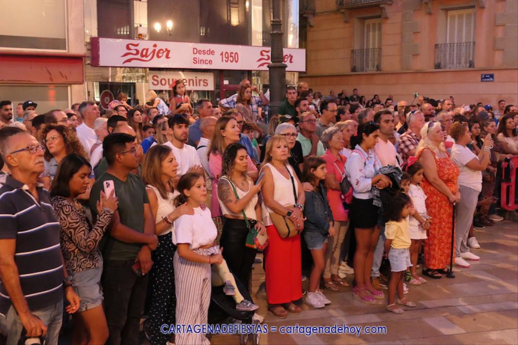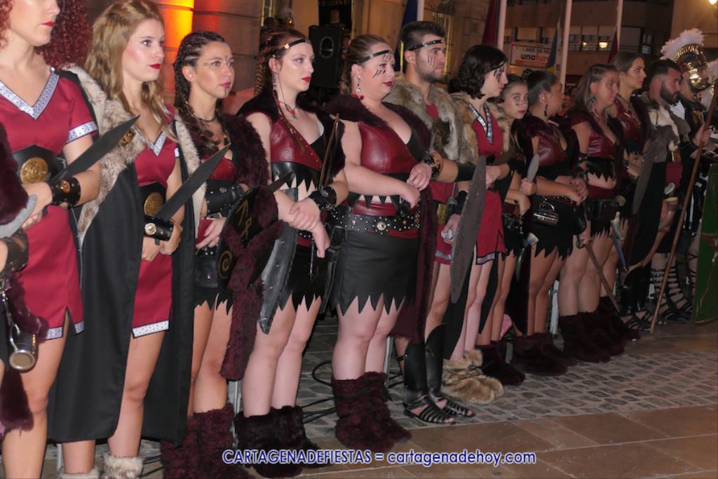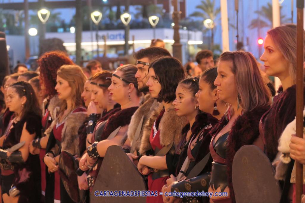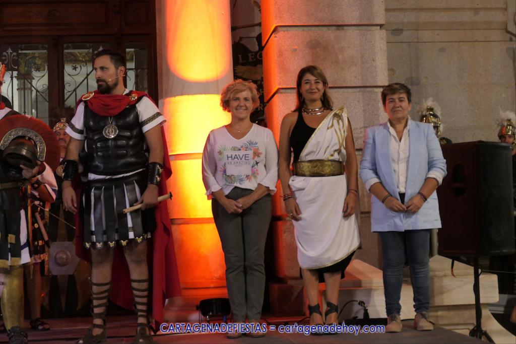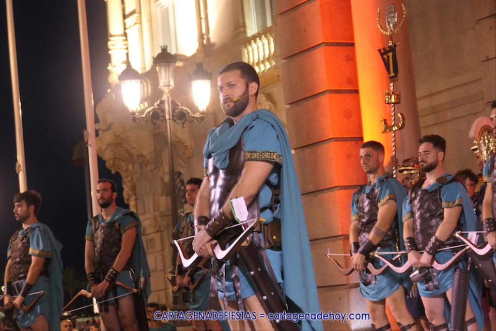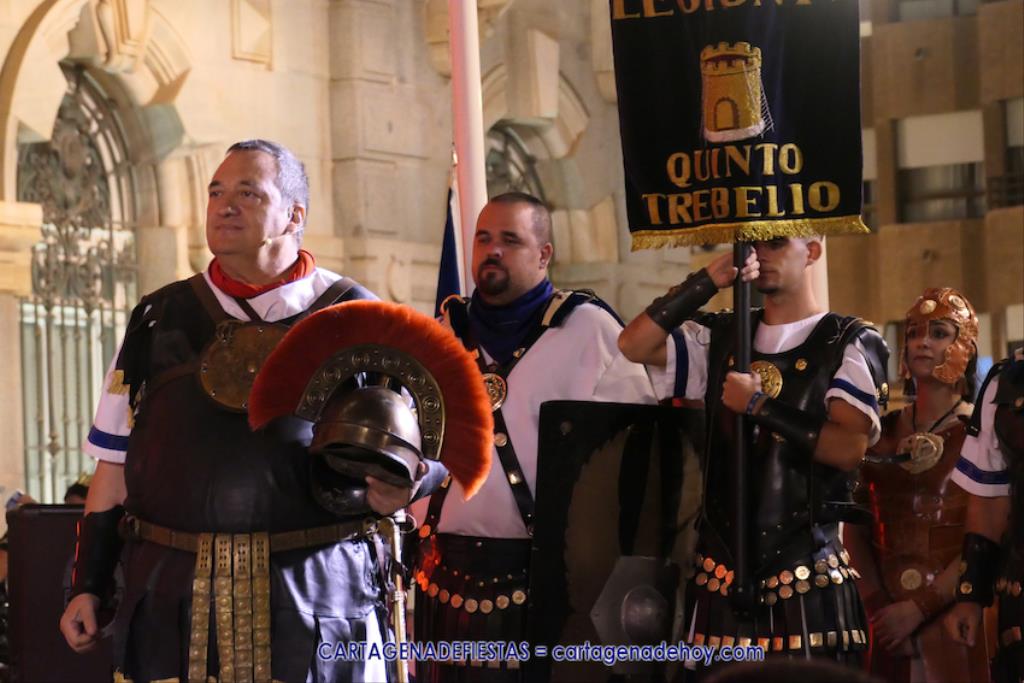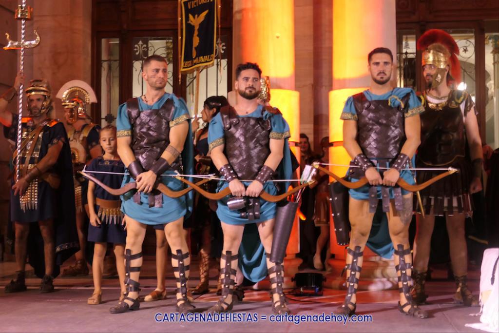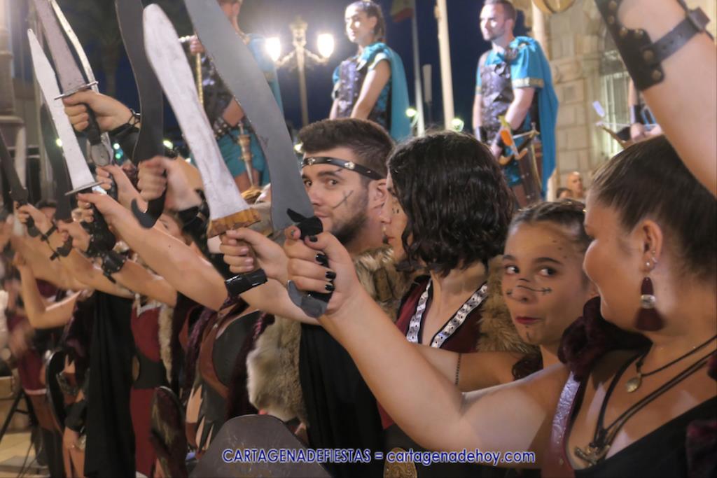 En la fachada del Palacio Consistorial tiene lugar el siguiente capítulo de los victoriosos romanos con un acto de veinte minutos dividido en tres capítulos. El primero es para liberar a los rehenes (con la condición de aliarse a Roma) que tenía Aníbal dentro de la ciudad, incluidos los nobles íberos, entre los que hay una joven a la que los legionarios ofrecen a Escipión, pero irrumpe su amado, el príncipe Alucio, y conquistador romano mostrará su clemencia accediendo a las peticiones de los amados y de la esposa de Mandonia, que también intercedió por la chica.