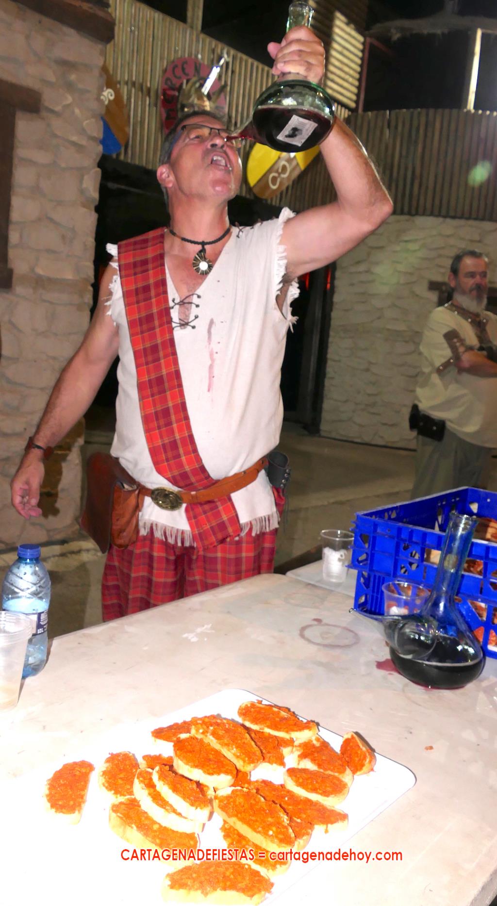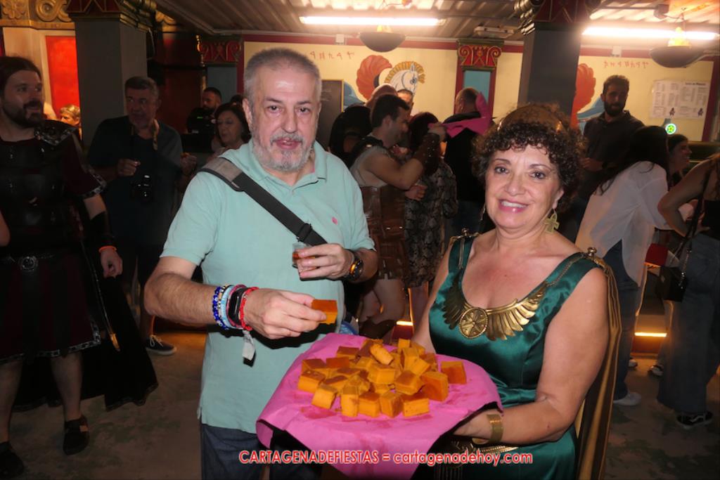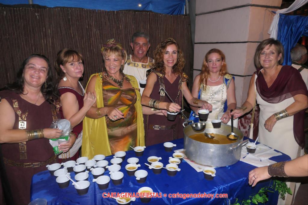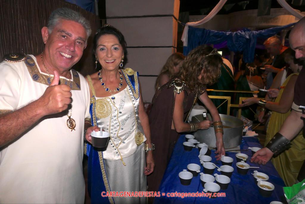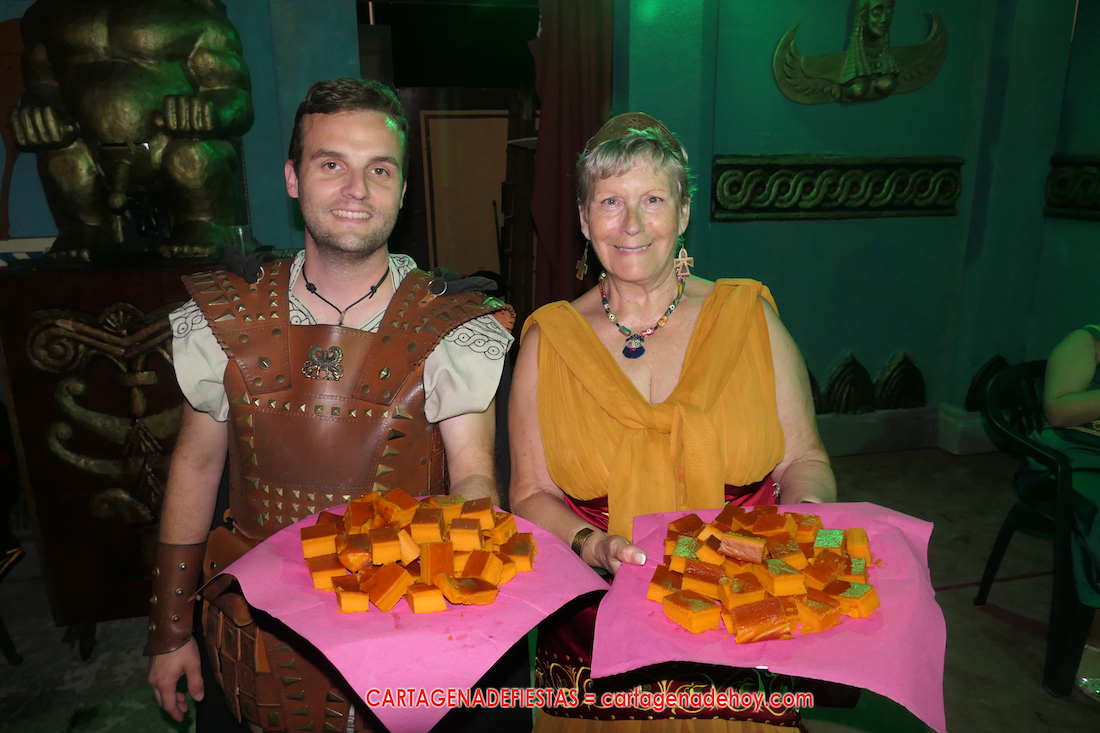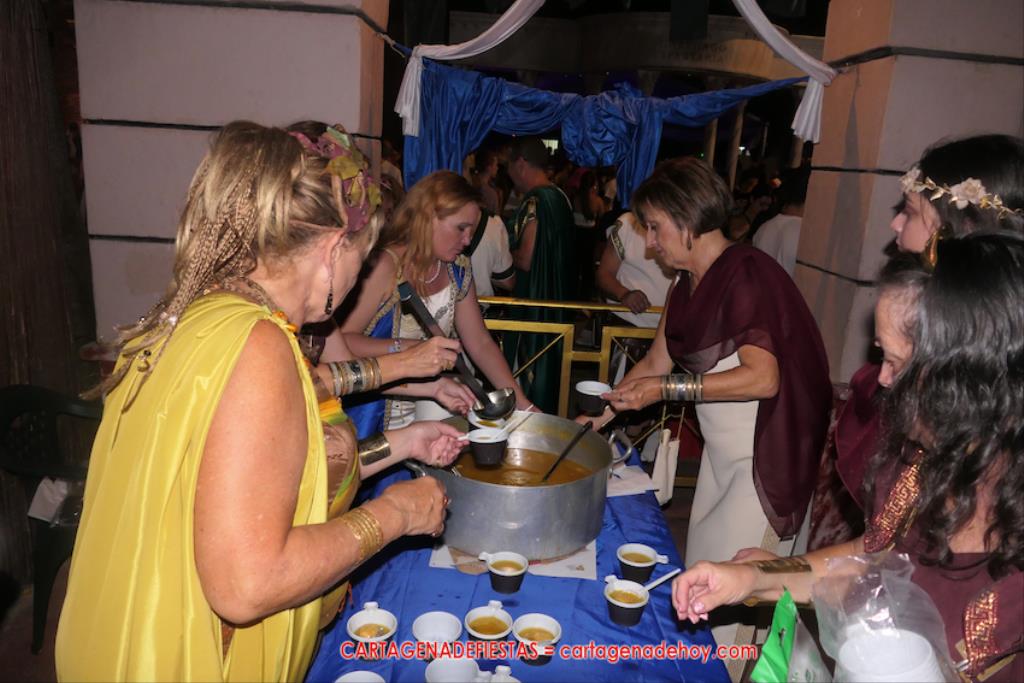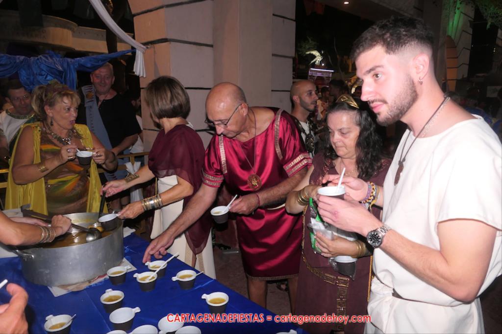 Uno de los días con más propuestas gastronómicas festeras es el lunes después de las 'Bodas de Aníbal e Himilce'. Primero, la feliz pareja, distribuyó una tarta de chocolate en medio de la calle carthaginesa y luego varios grupos púnicos regalaron buñuelos (Honderos Baleares), michirones (Tropas de Tiro) o pan con sobrasada y vino en porrón (Mercenarios Celtas), por citar unos ejemplos.