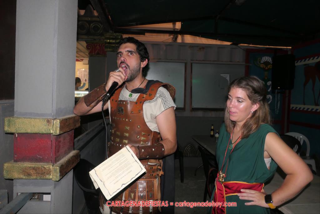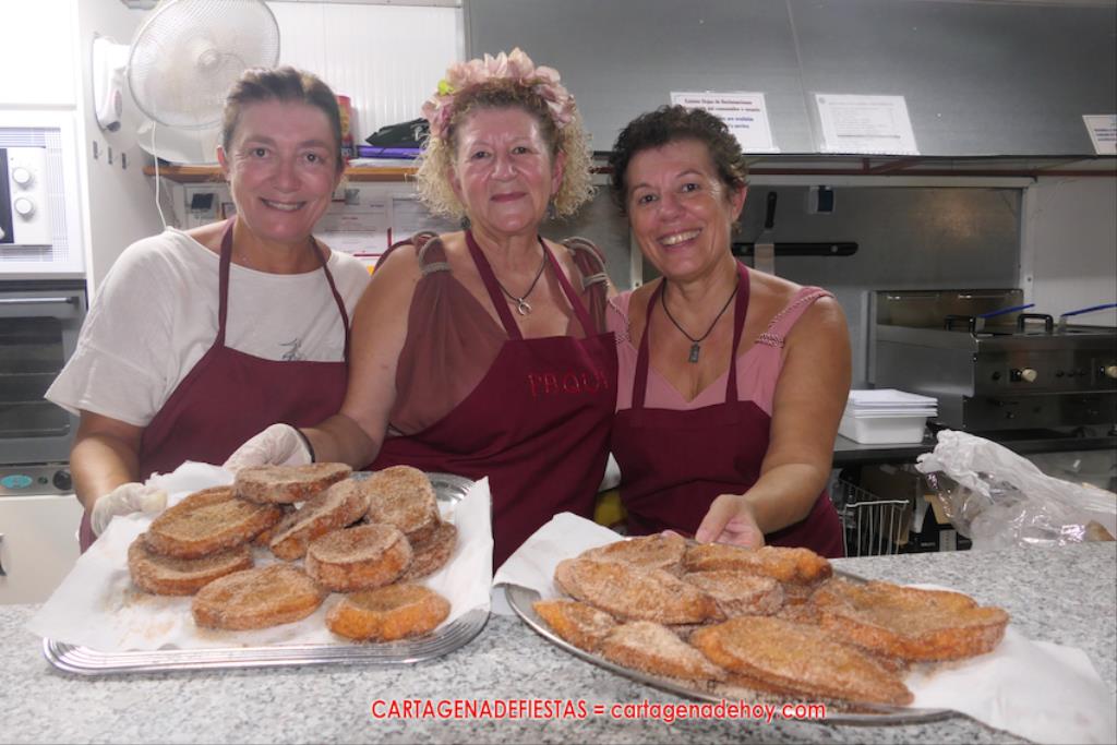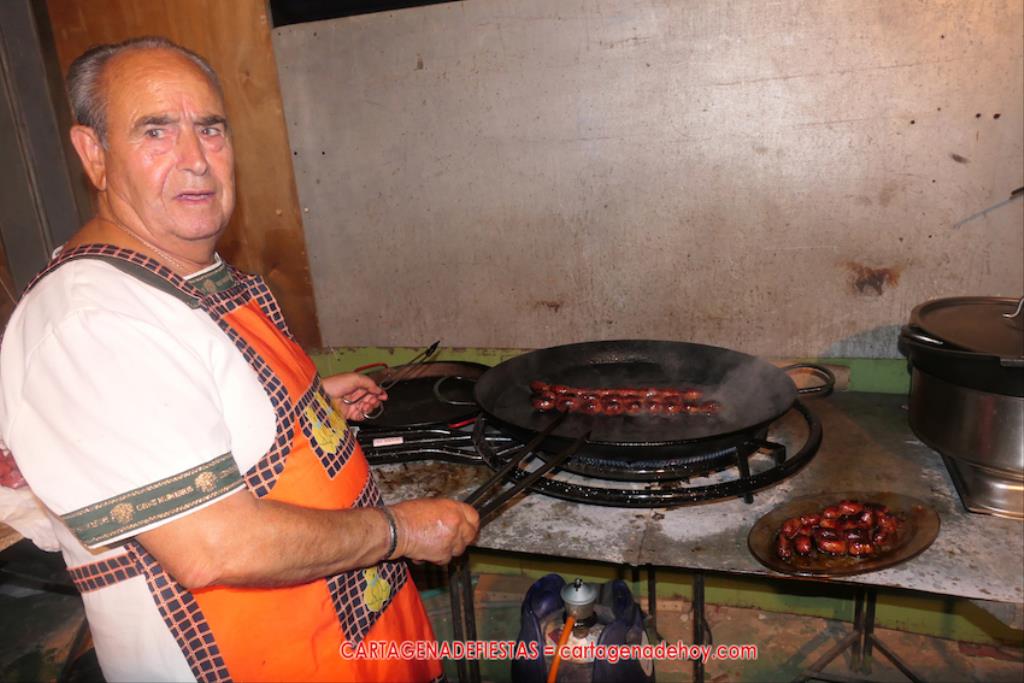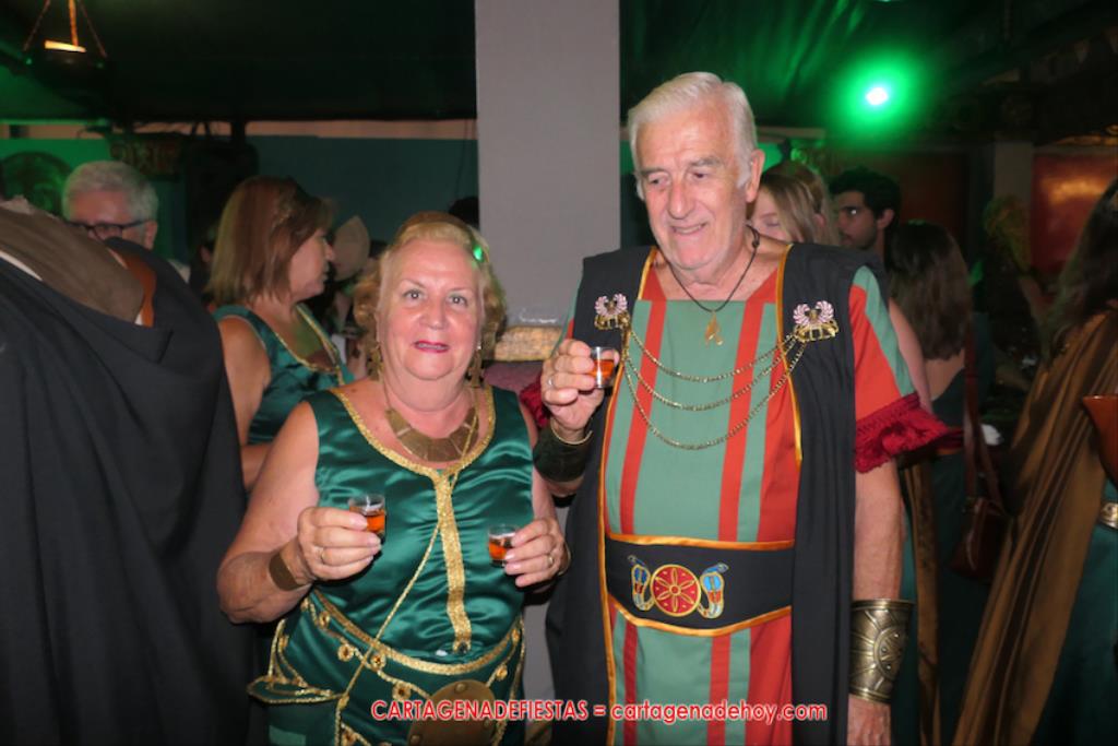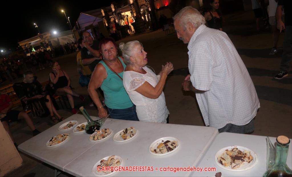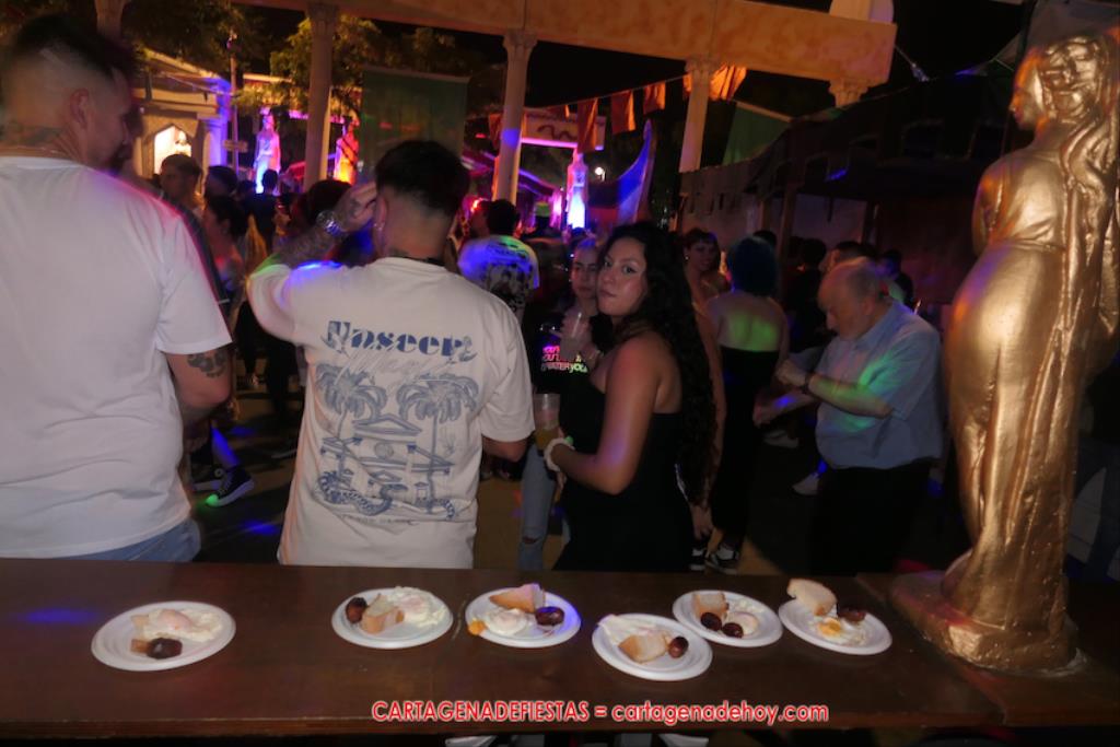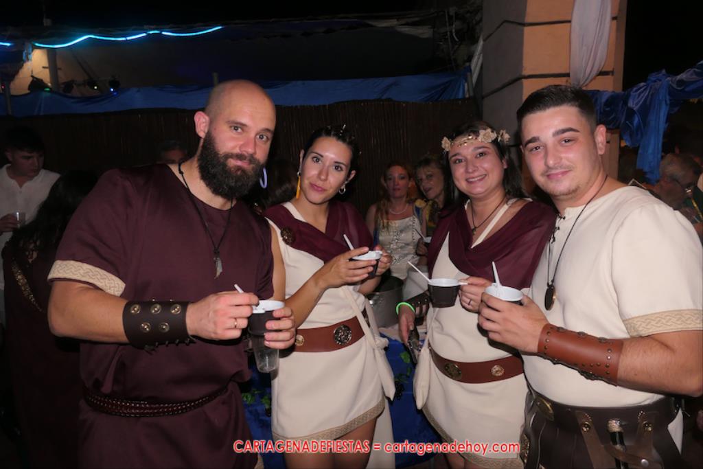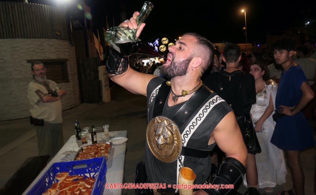 Uno de los días con más propuestas gastronómicas festeras es el lunes después de las 'Bodas de Aníbal e Himilce'. Primero, la feliz pareja, distribuyó una tarta de chocolate en medio de la calle carthaginesa y luego varios grupos púnicos regalaron buñuelos (Honderos Baleares), michirones (Tropas de Tiro) o pan con sobrasada y vino en porrón (Mercenarios Celtas), por citar unos ejemplos.