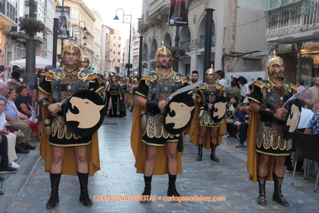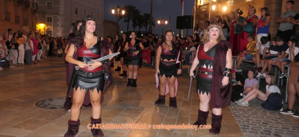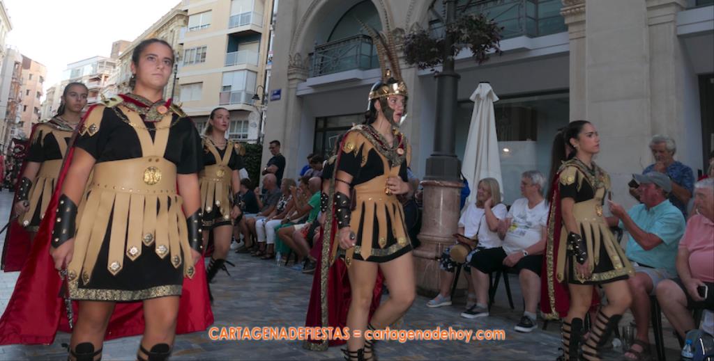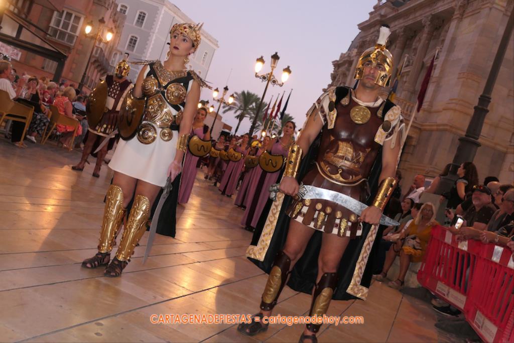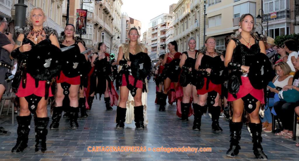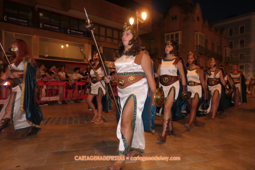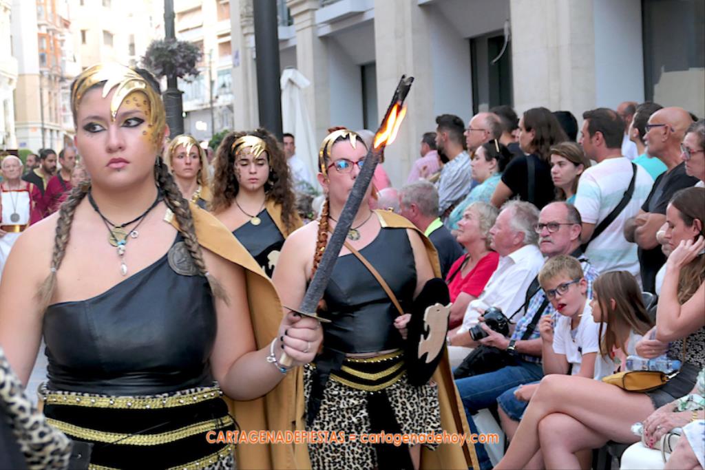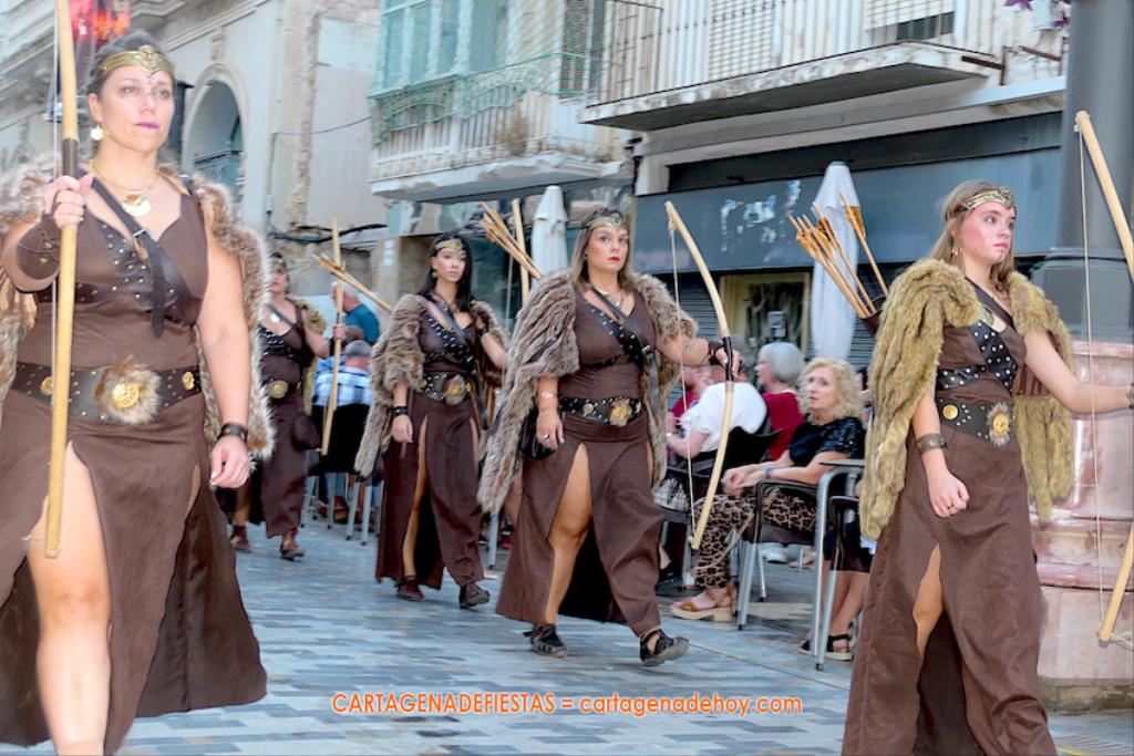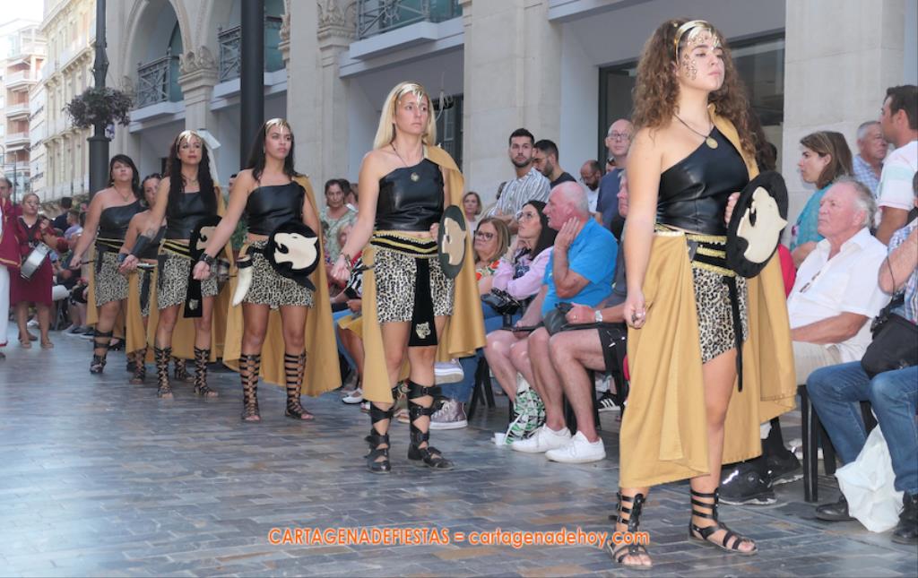 Las cincuenta tropas y legiones, con sus mejores galas y reforzadas por festeros de Alicante y de Linares, volvieron a ofrece una marcha que cautivó al numeroso público a su paso por las céntricas calles de Cartagena. En la foto, la guardia femenina de Indiketes.