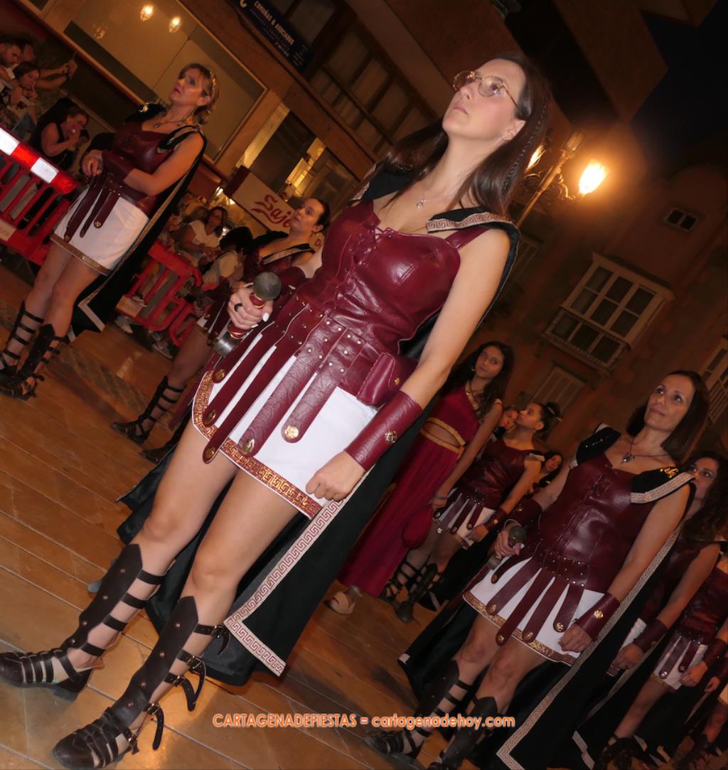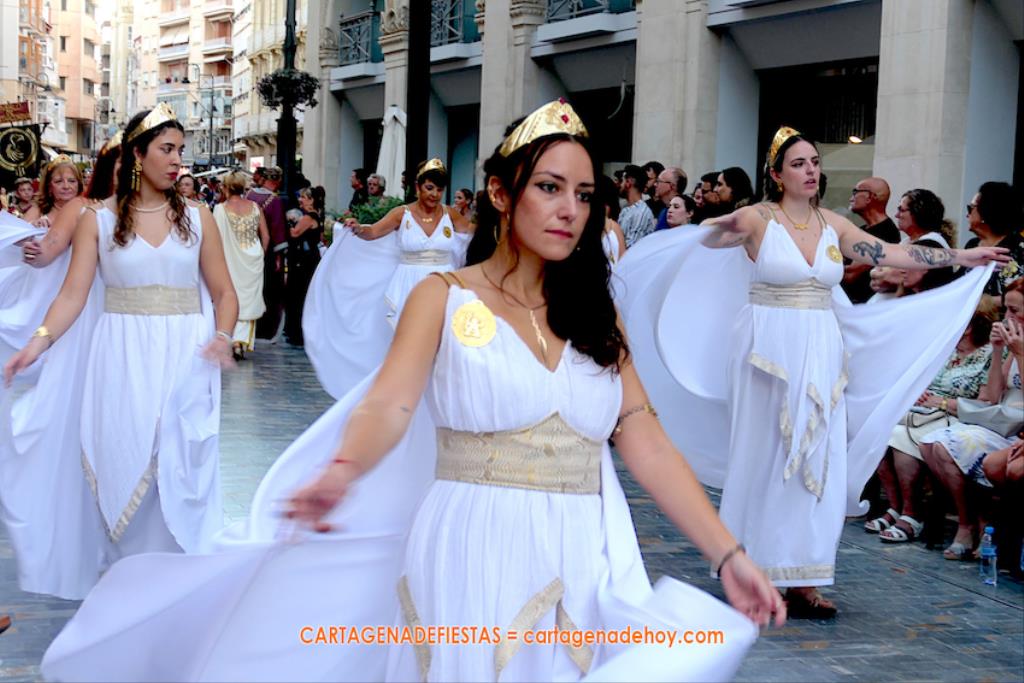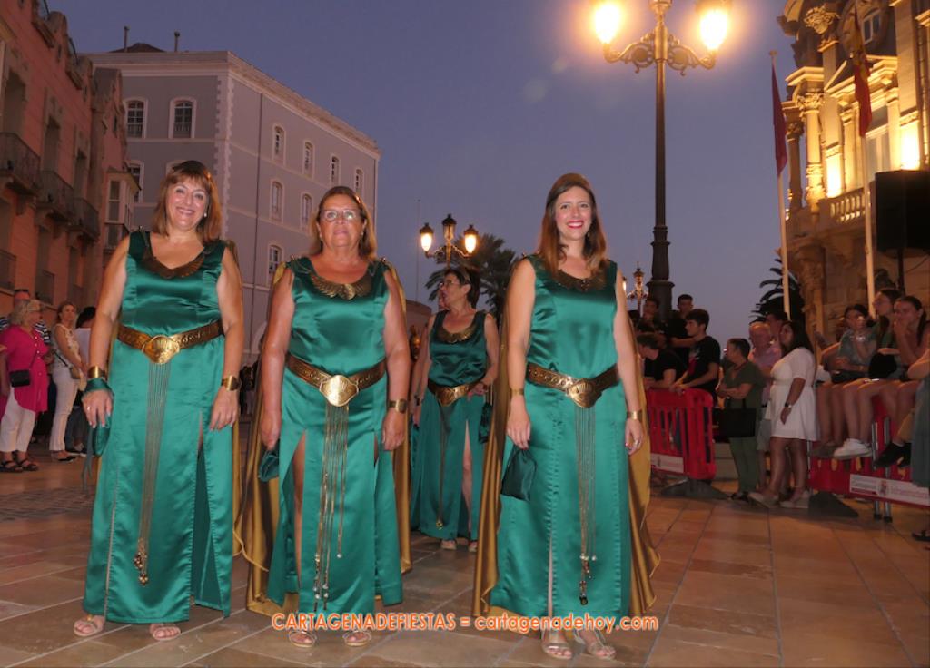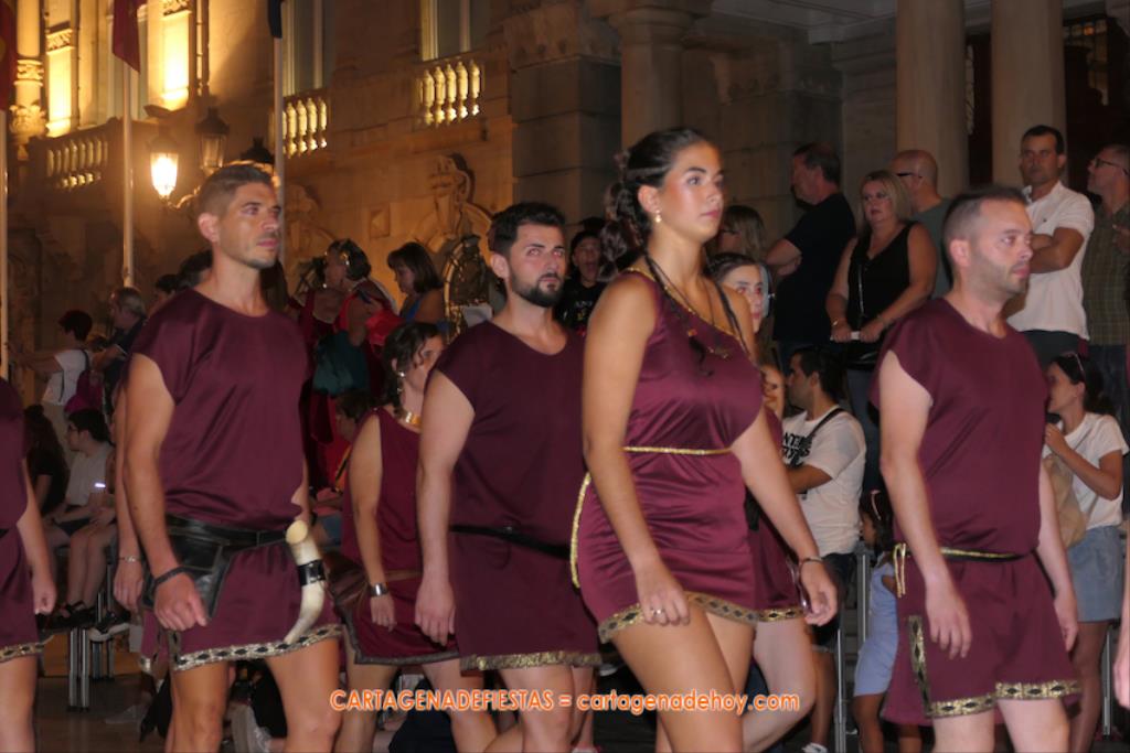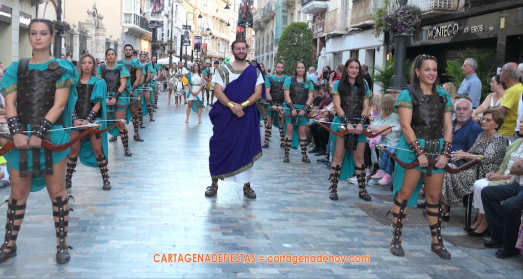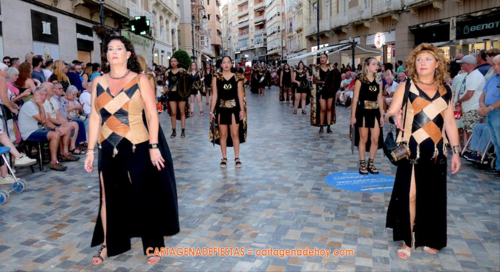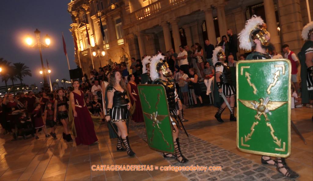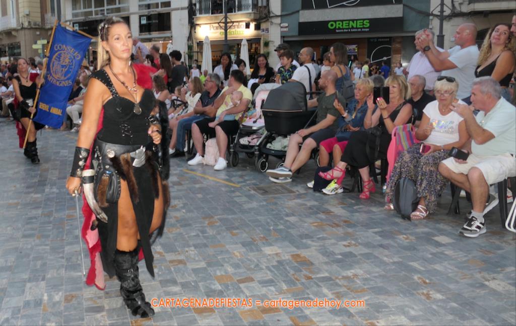 Las cincuenta tropas y legiones, con sus mejores galas y reforzadas por festeros de Alicante y de Linares, volvieron a ofrece una marcha que cautivó al numeroso público a su paso por las céntricas calles de Cartagena. En la foto, la guardia femenina de Indiketes.