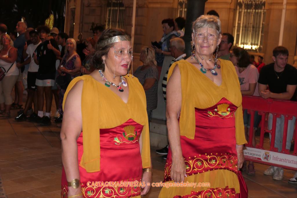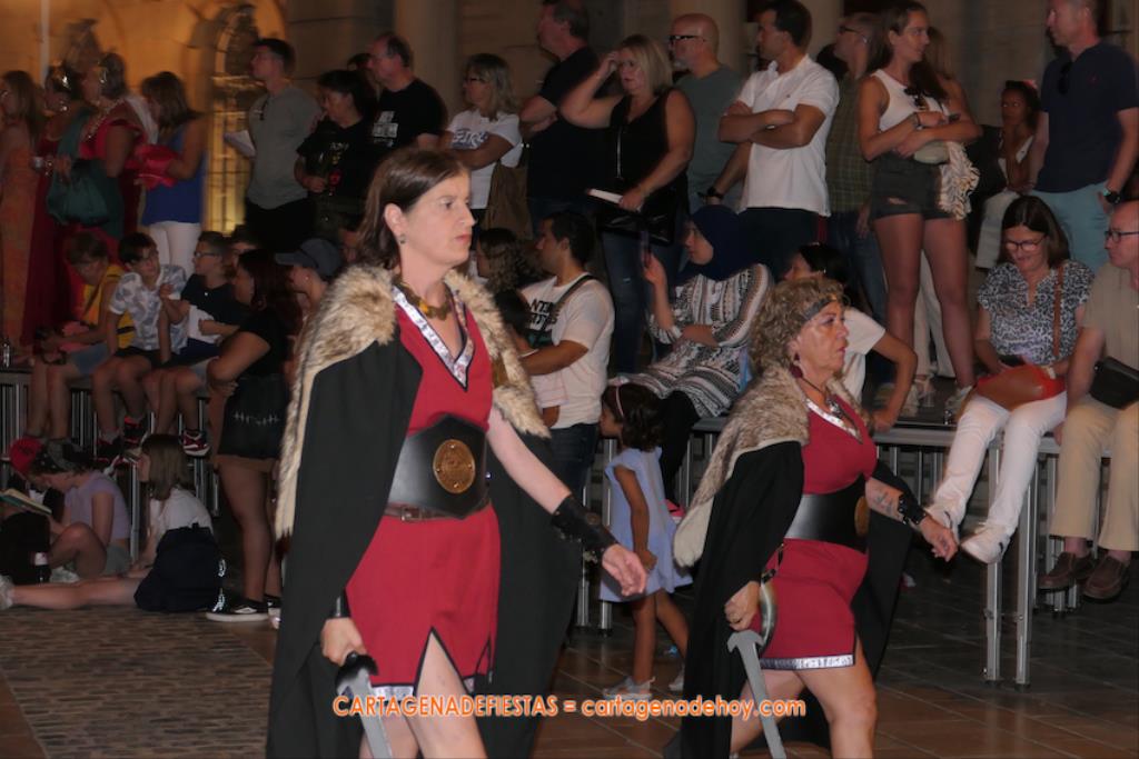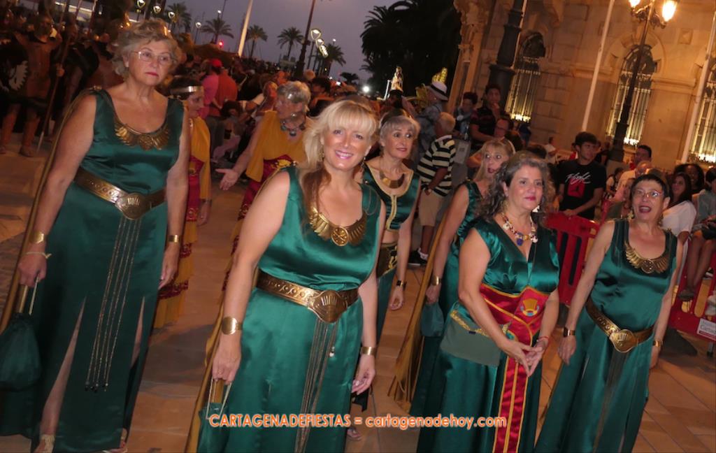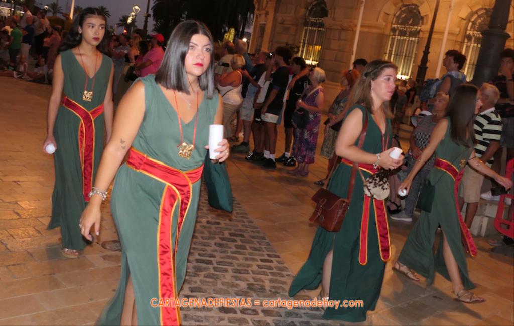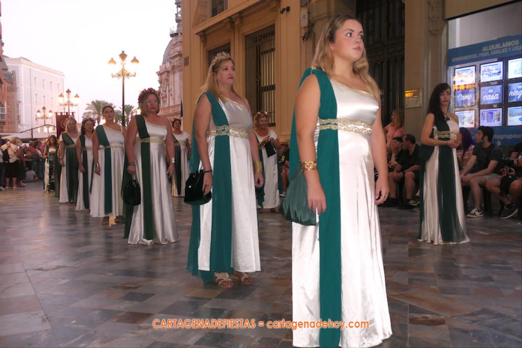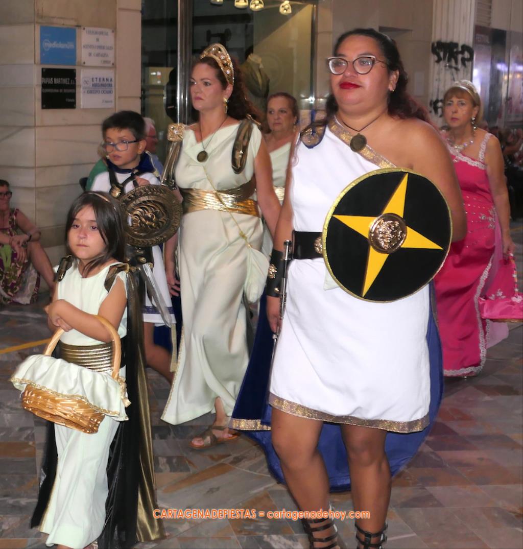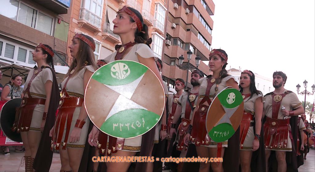 Las cincuenta tropas y legiones, con sus mejores galas y reforzadas por festeros de Alicante y de Linares, volvieron a ofrece una marcha que cautivó al numeroso público a su paso por las céntricas calles de Cartagena. En la foto, la guardia femenina de Indiketes.