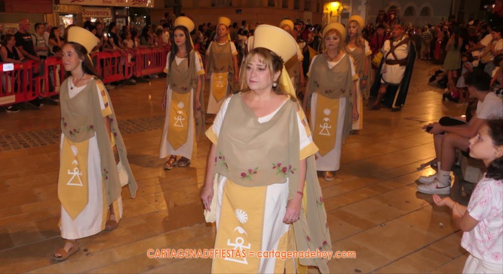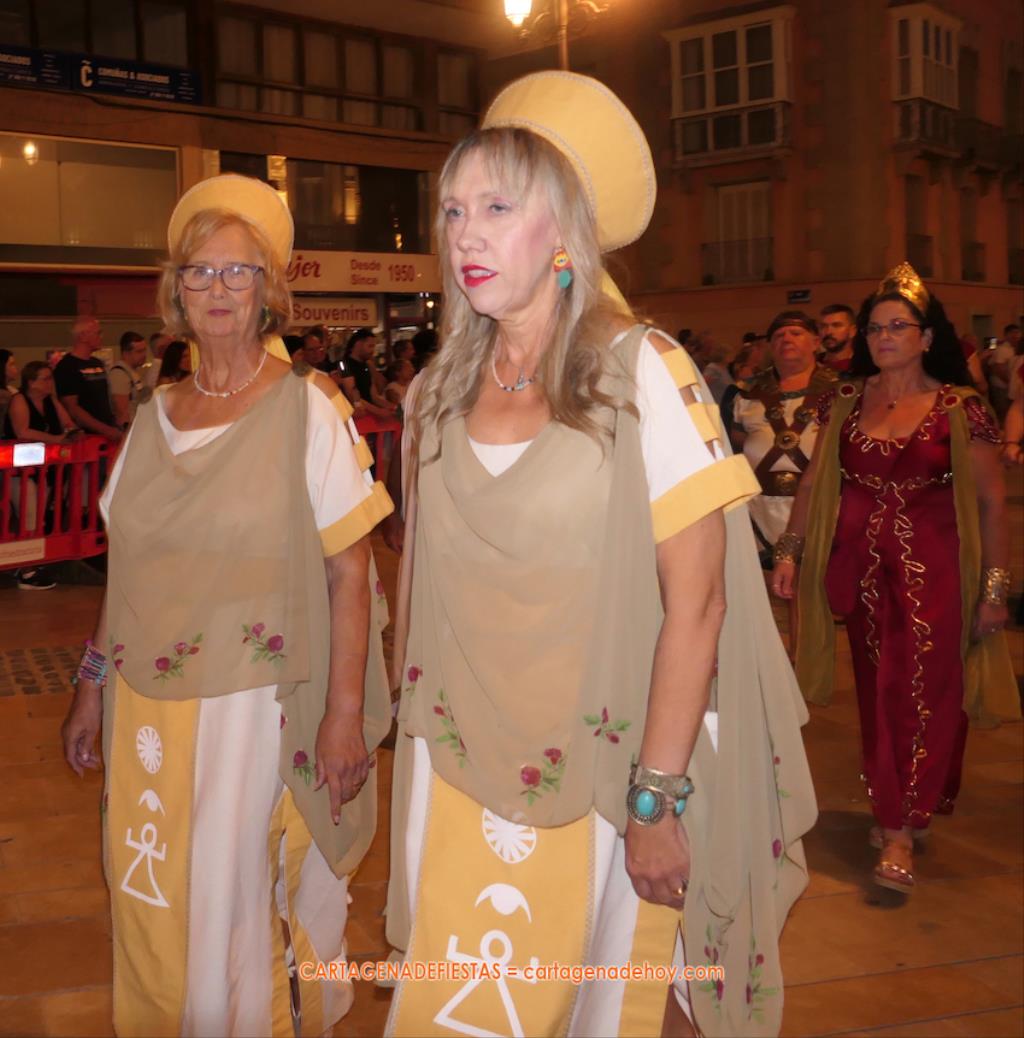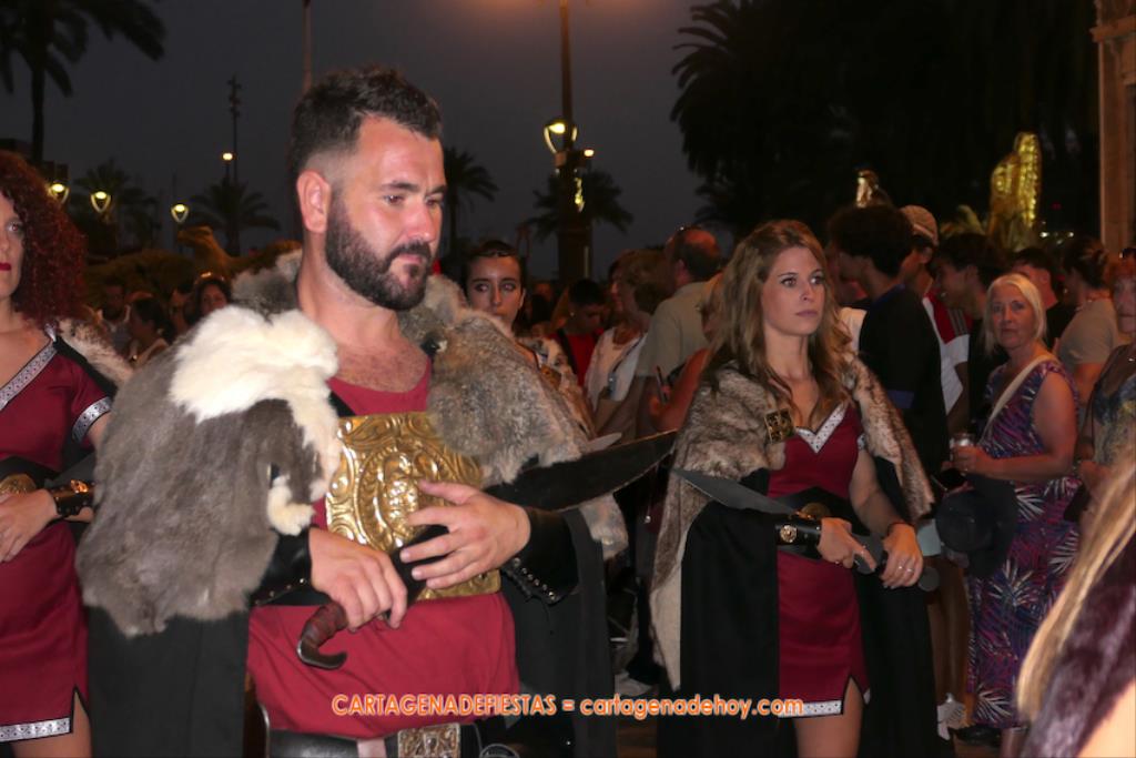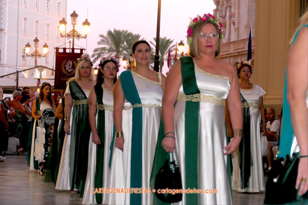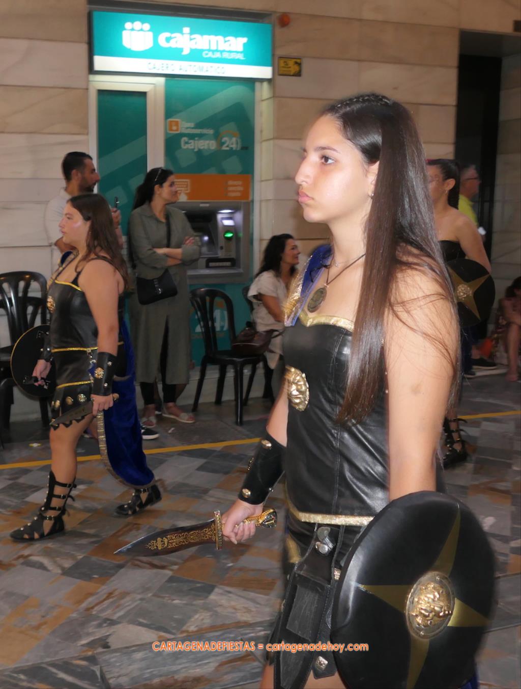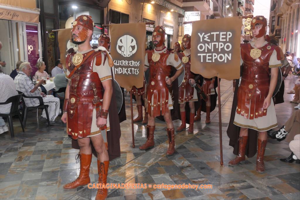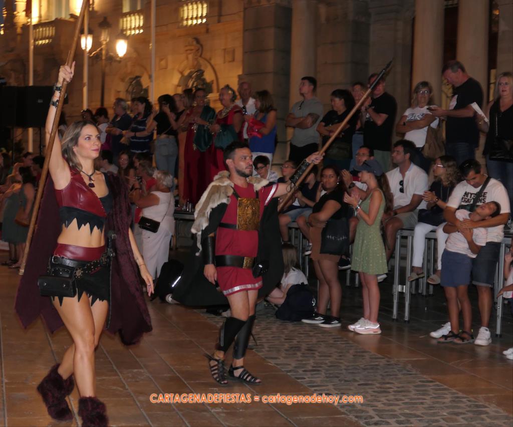 Las cincuenta tropas y legiones, con sus mejores galas y reforzadas por festeros de Alicante y de Linares, volvieron a ofrece una marcha que cautivó al numeroso público a su paso por las céntricas calles de Cartagena. En la foto, la guardia femenina de Indiketes.