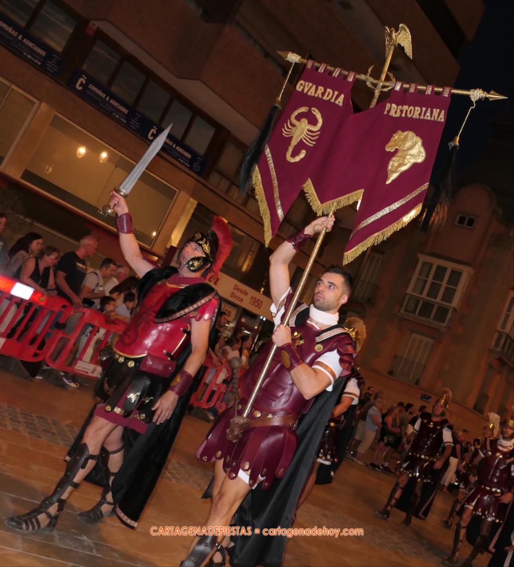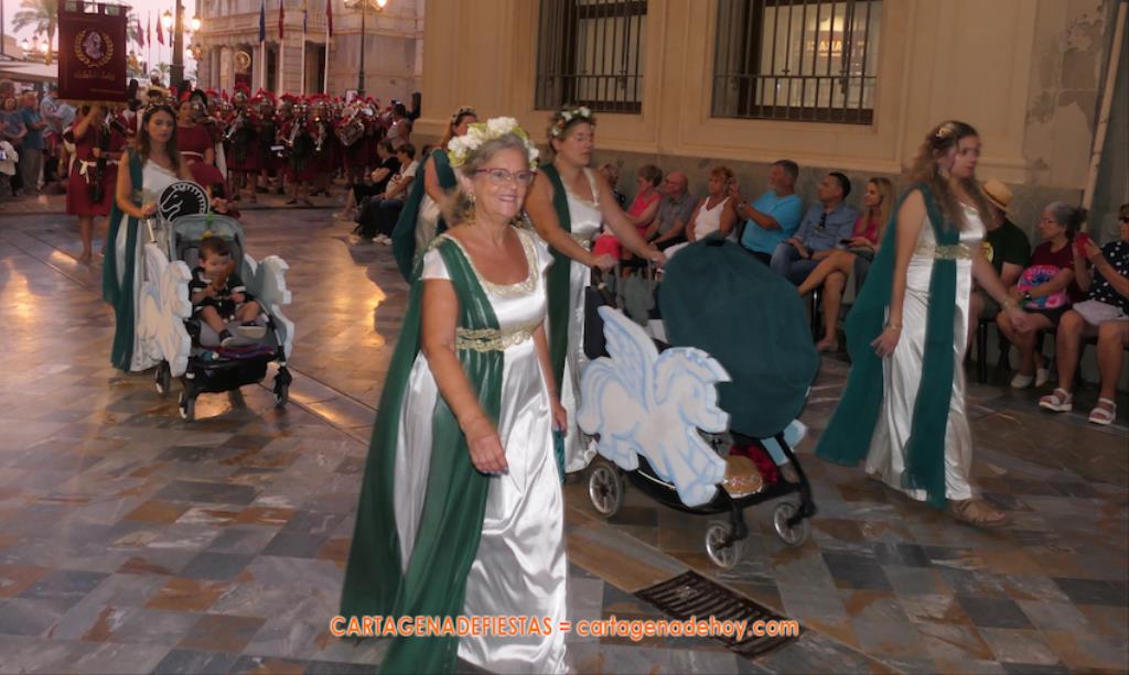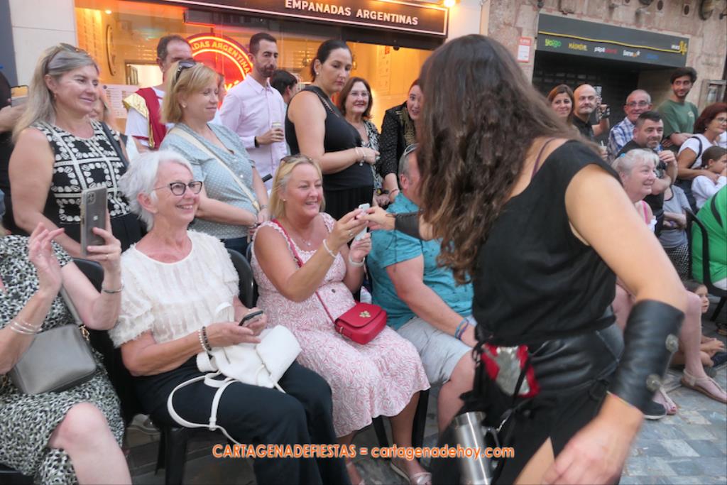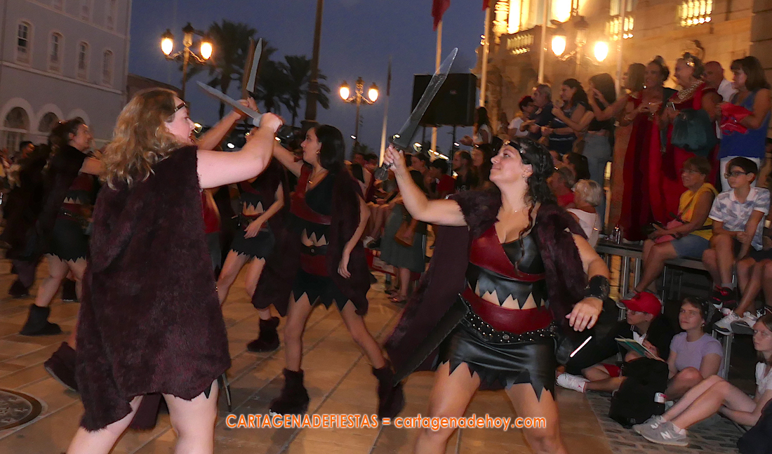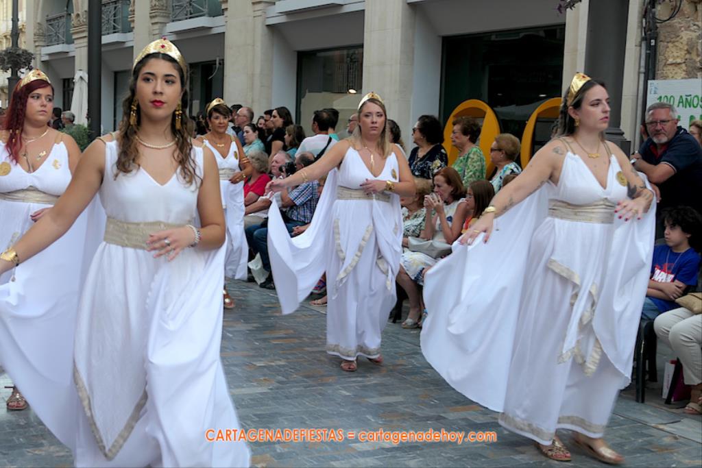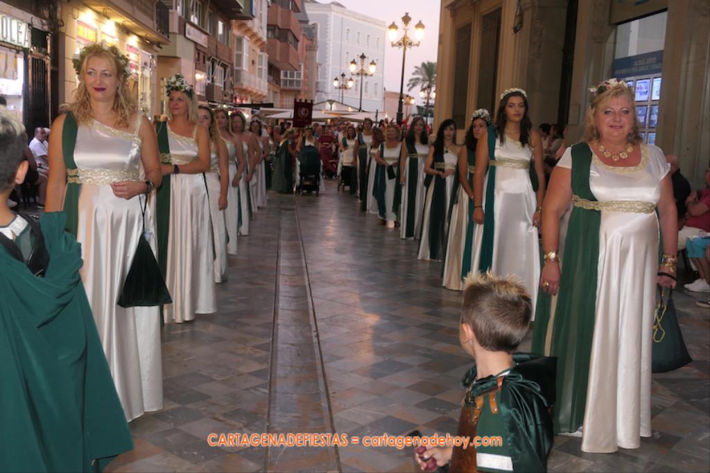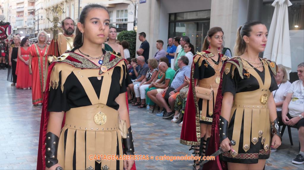 Las cincuenta tropas y legiones, con sus mejores galas y reforzadas por festeros de Alicante y de Linares, volvieron a ofrece una marcha que cautivó al numeroso público a su paso por las céntricas calles de Cartagena. En la foto, la guardia femenina de Indiketes.