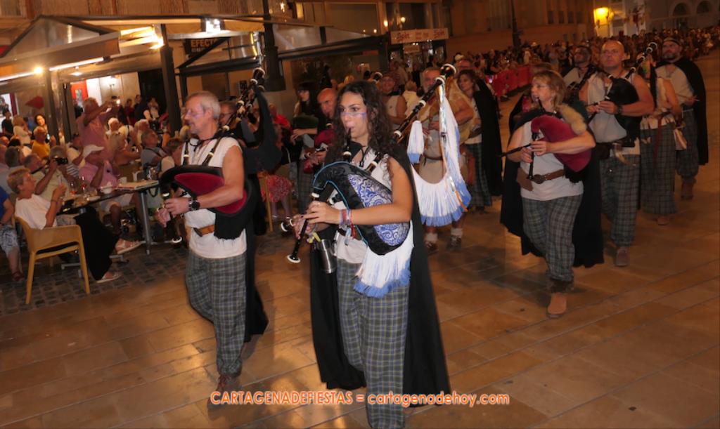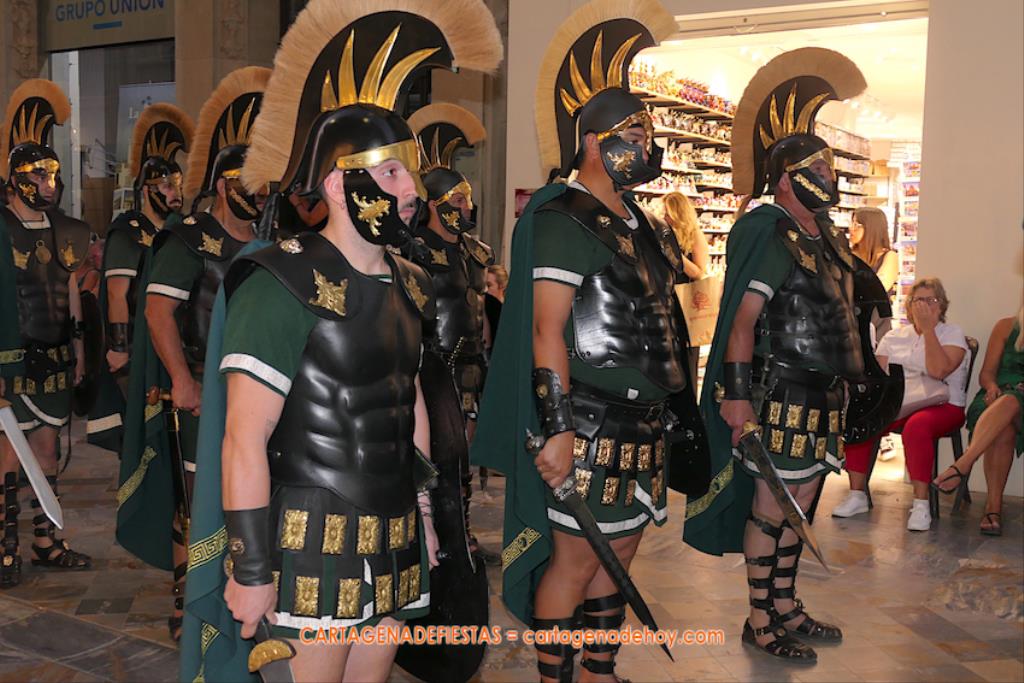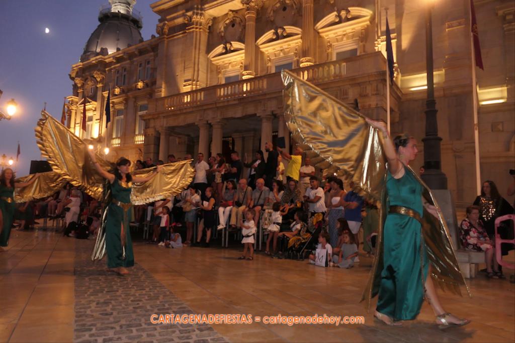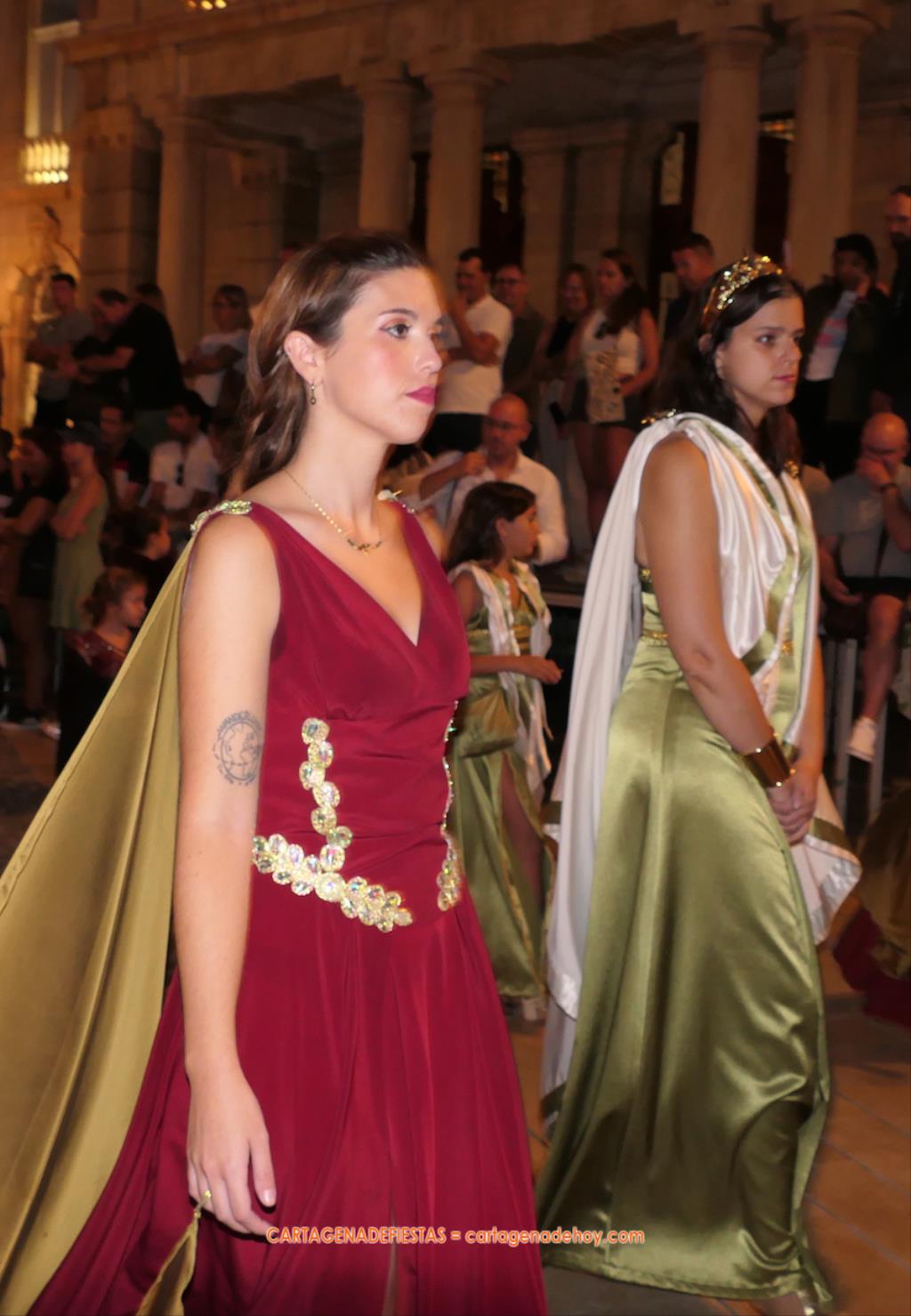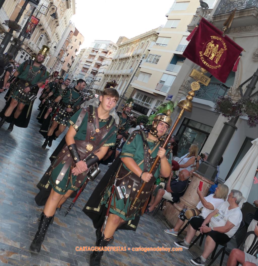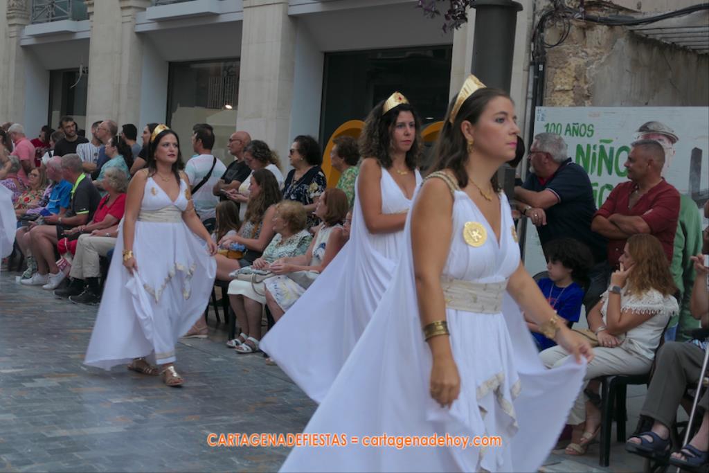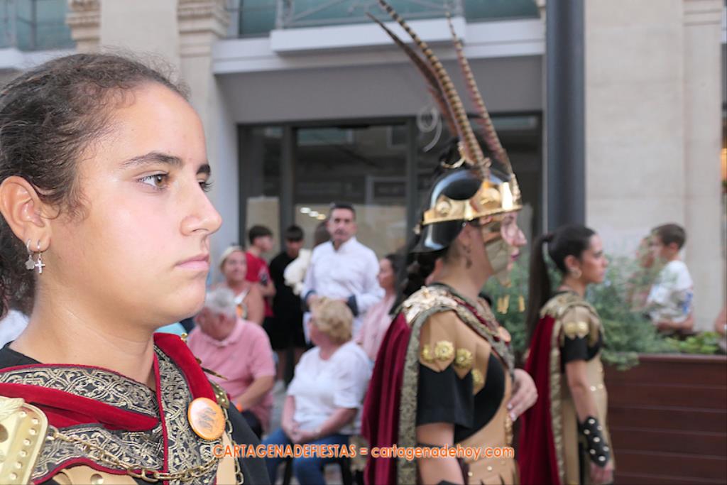 Las cincuenta tropas y legiones, con sus mejores galas y reforzadas por festeros de Alicante y de Linares, volvieron a ofrece una marcha que cautivó al numeroso público a su paso por las céntricas calles de Cartagena. En la foto, la guardia femenina de Indiketes.