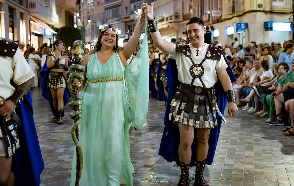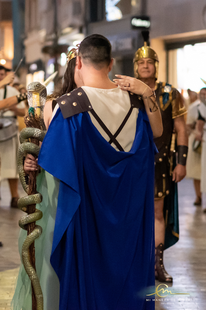 Desfile general de Carthagineses y Romanos. Es la legión de Ara Pacis la que transita por la Puerta de Murcia, en concreto, ante la tribuna. En ese momento, un alto y una petición. Sergio se dirige a María José y la pide en matrimonio. Respuesta afirmativa, besos, emoción y felicitaciones de allegados que están en el entorno. '¡Habemus boda en Carthagono Nova!'.