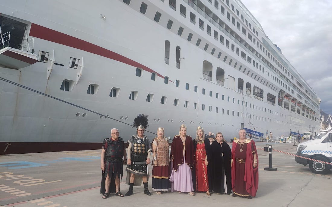 Muchos de los cruceros que llegan al puerto de Cartagena enseguida se encuentran con una representación de las Fiestas de Carthagineses y Romanos gracias a la ardua labor que llevan desde hace años los integrantes de la vocalía de relaciones externas de la Federación de Tropas y Legiones. "Son infinitas las fotos de nuestra fiesta que que están por el mundo gracias a esta iniciativa", expone Dolores Giménez Zamora.