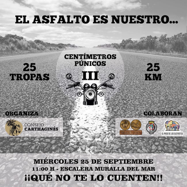 La tercera edición de 'Centímetros púnicos', que tendrá lugar en la mañana del 25 de septiembre dentro de las Fiestas de Carthagineses y Romanos, organizada por el Consejo de Centuviros, tendrá de recorrido 25 kilómetros, la misma cifra que hay de tropas.