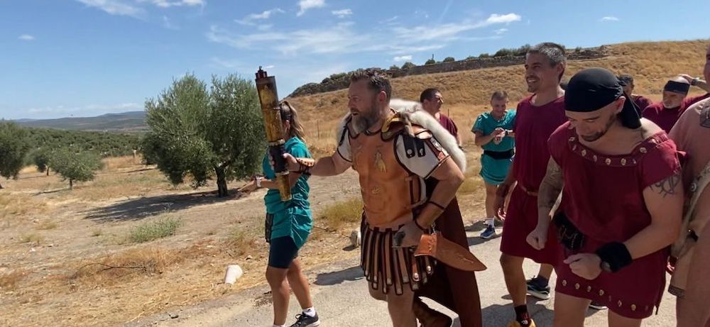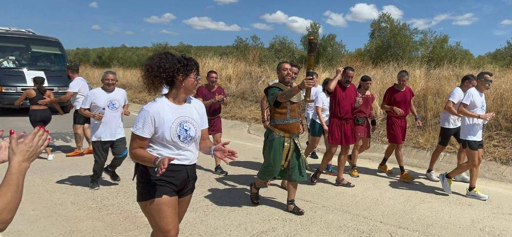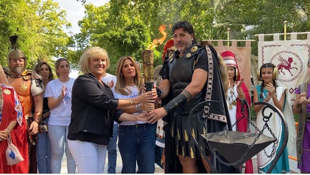 La alcaldesa de la localidad jienense, Auxi del Olmo, ante la presencia de numerosos festejadores de ambas localidades, ha sido la encargada de recorrer los primeros metros de los 270 kilómetros que la llama de Carthagineses y Romanos recorrerá (sin apagarse) hasta que el viernes llegue a Cartagena.