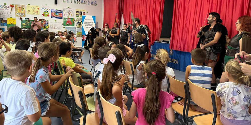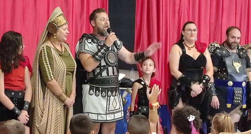 Los principales personajes de los carthagineses, acompañados por festeros púnicos, visitaron el CEIP José María de Lapuerta, donde contaron a los alumnos la historia de Qart-Hadast y de Cartago-Nova, además de mostrar y explica su vestuario y amenizar la mañana con combates y el baile de la ‘Danza de Bruselas’.