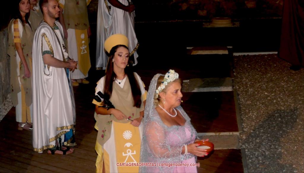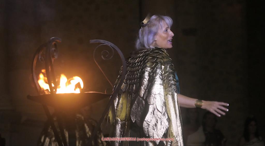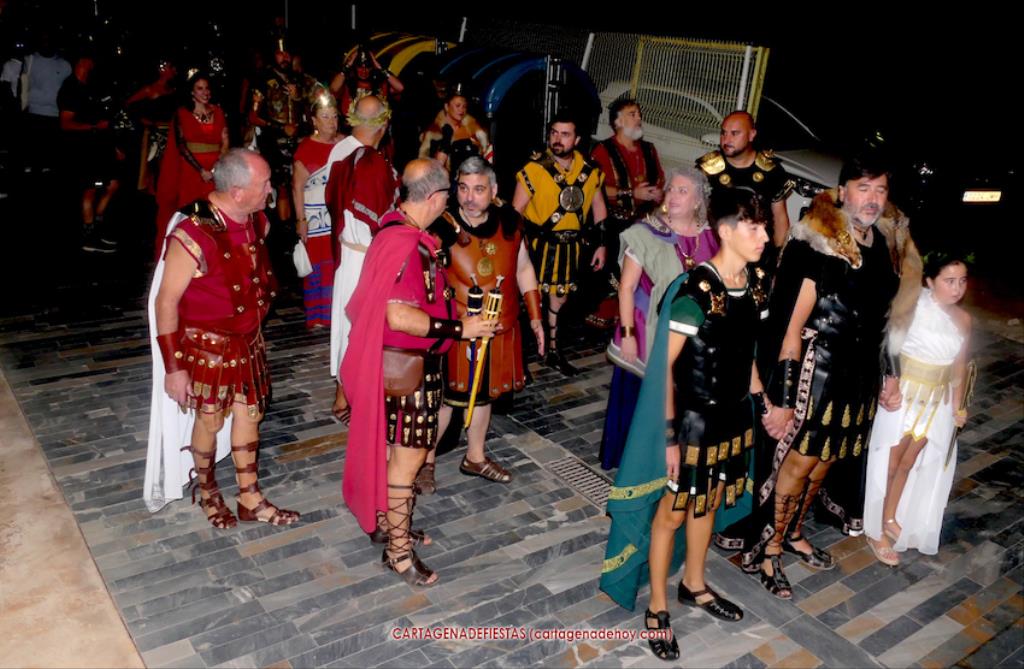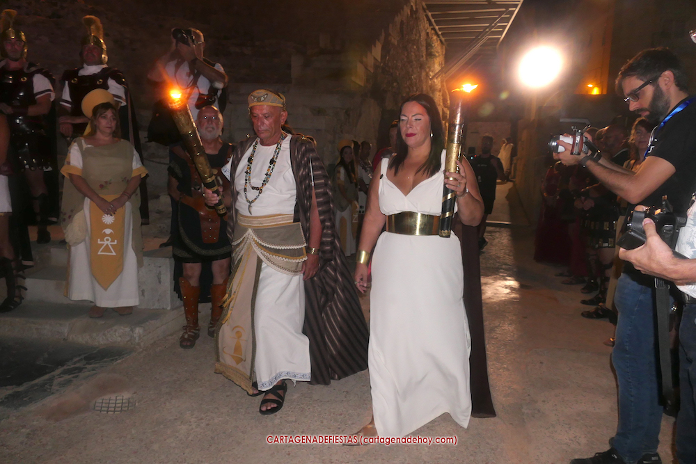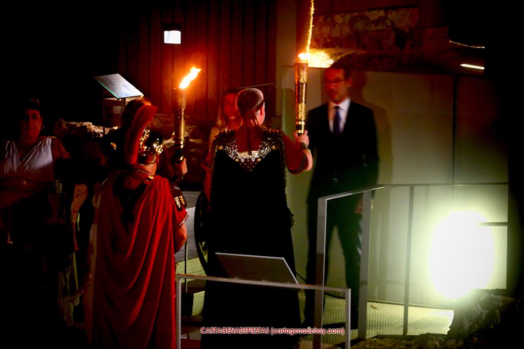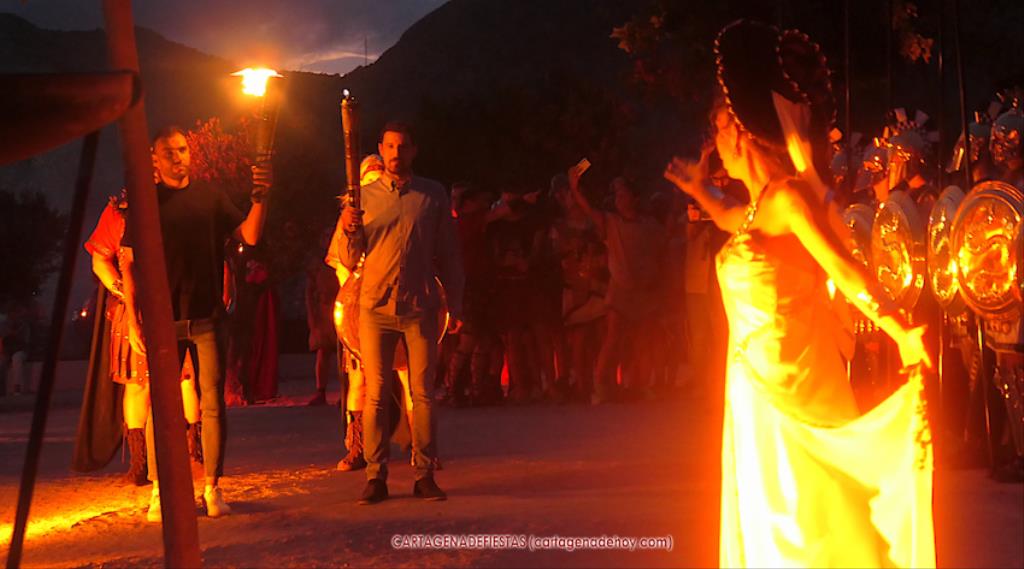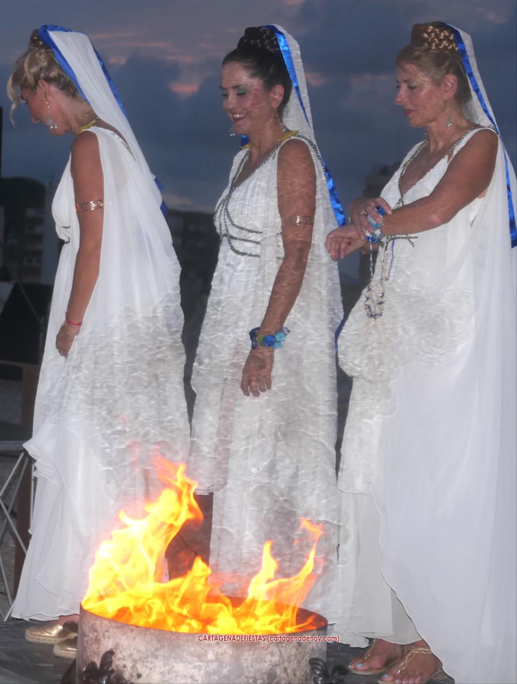 El presidente de Tropas y Legiones, José Antonio Meca, quien en su último año fue acompañado por sus hijos, recogió el fuego sagrado, que después recogerían, en la bajada, los presidentes del Senado y Consejo, entre otros, hasta llegar a la segunda escala, el Templo de Isis en el Foro Romano, donde se llevó a cabo otra representación coral en un acto (esta vez con voces en directo) de casi exclusivo protagonismo femenino. En este lugar fueron Luis Roque Dinis, gerente de Repsol Cartagena, y Cristina Pérez, gerente de Puerto de Cultura, quienes encendieron el pebetero.