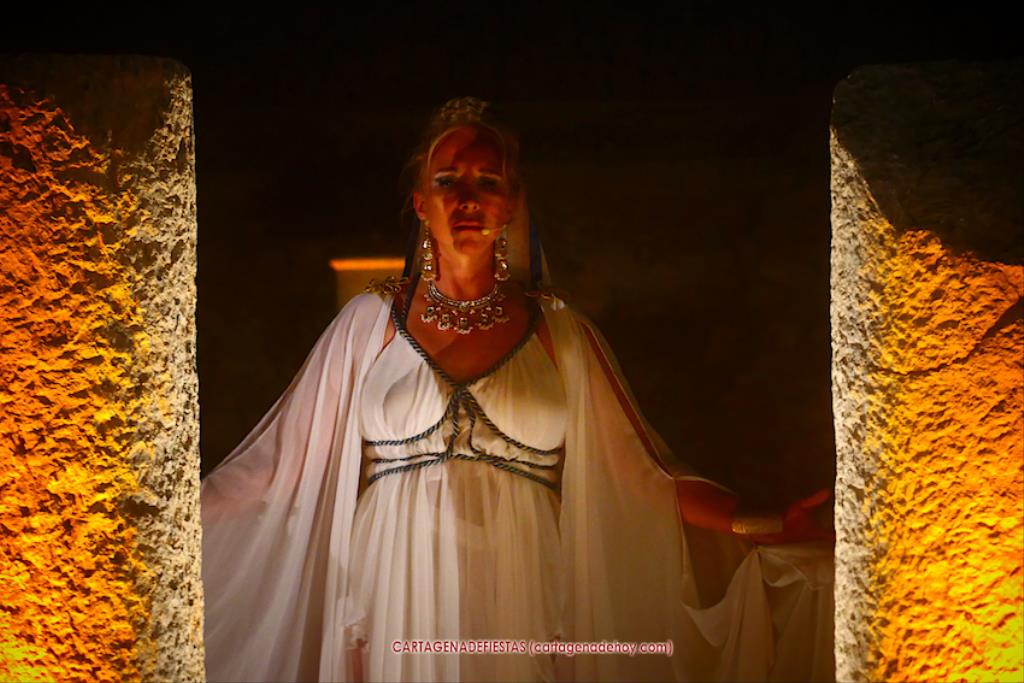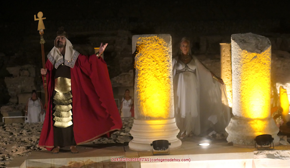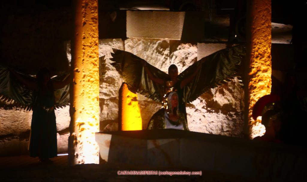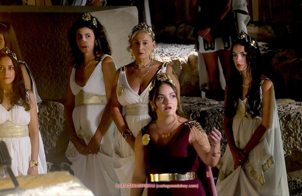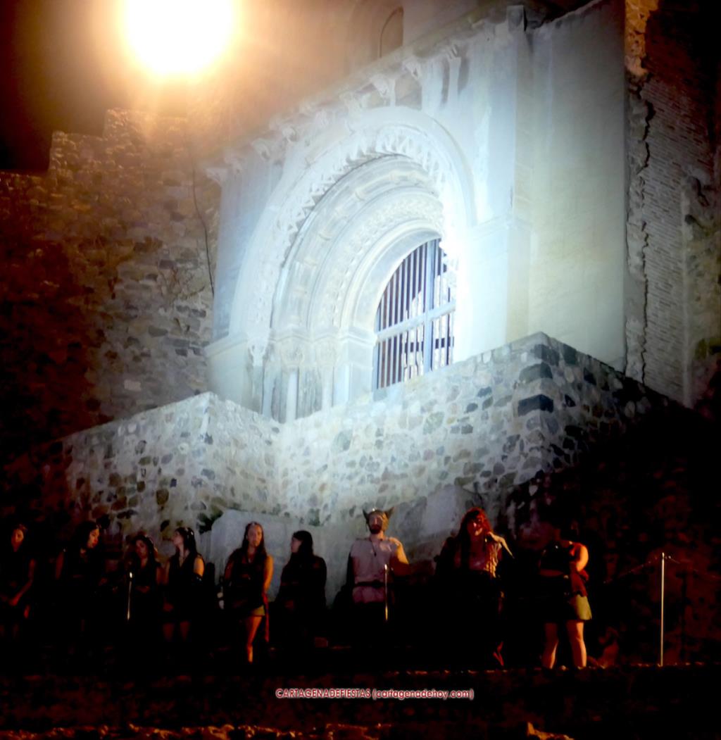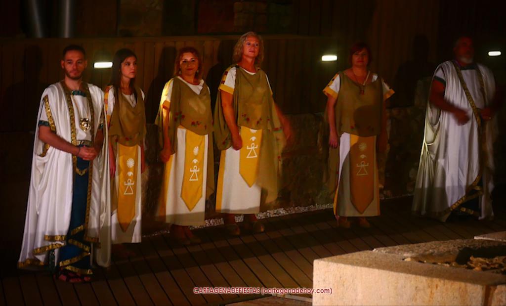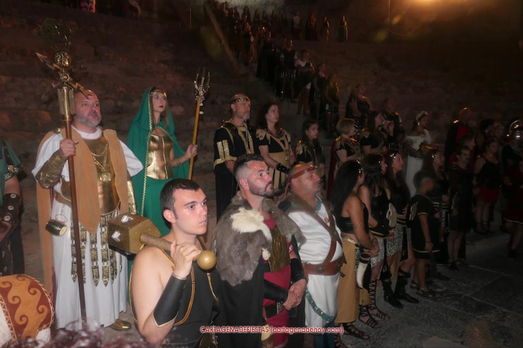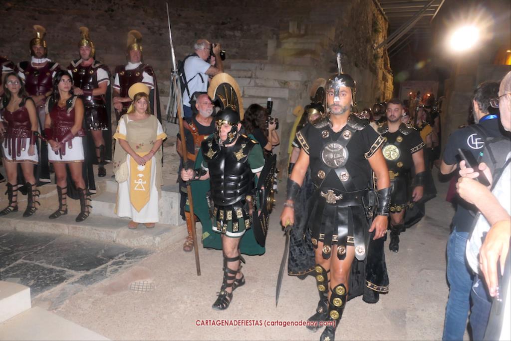 El presidente de Tropas y Legiones, José Antonio Meca, quien en su último año fue acompañado por sus hijos, recogió el fuego sagrado, que después recogerían, en la bajada, los presidentes del Senado y Consejo, entre otros, hasta llegar a la segunda escala, el Templo de Isis en el Foro Romano, donde se llevó a cabo otra representación coral en un acto (esta vez con voces en directo) de casi exclusivo protagonismo femenino. En este lugar fueron Luis Roque Dinis, gerente de Repsol Cartagena, y Cristina Pérez, gerente de Puerto de Cultura, quienes encendieron el pebetero.