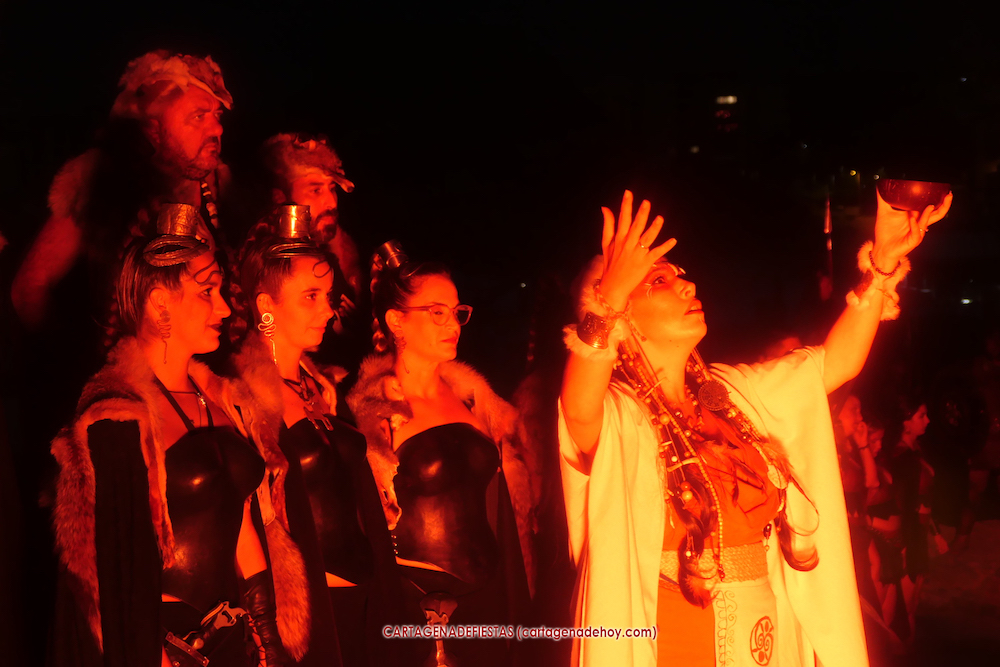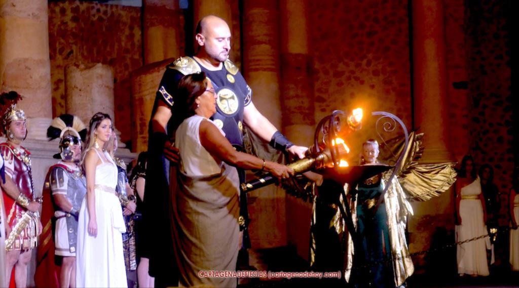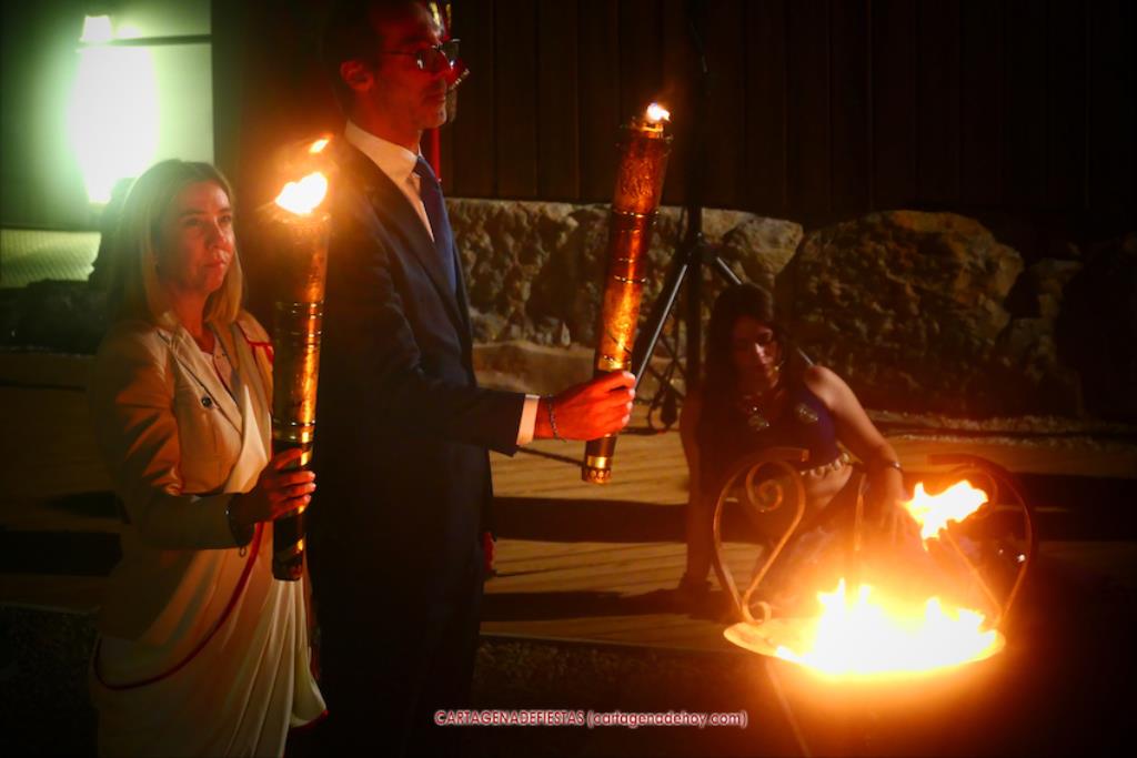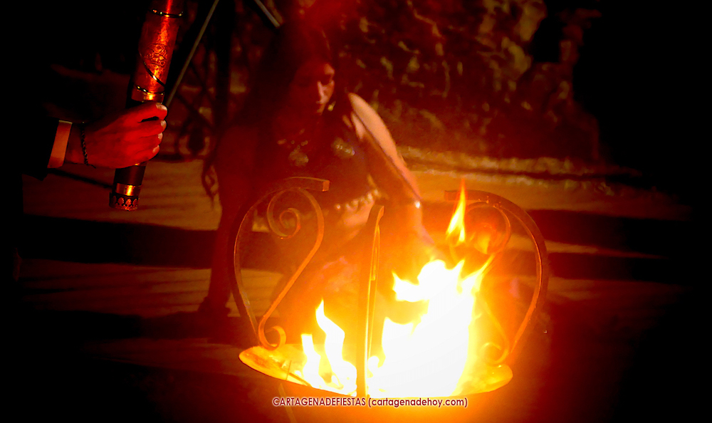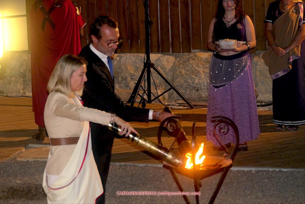 Hasta llegar a ese momento, hay que reseñar que se llevó a cabo un acto teatral previo que protagonizaron una vesta, dos druidas y el propetor romano. Fue novedad con respecto a años anteriores y también la dirección con el regreso de Marcial Góngora, además del pebetero, que pasó de estar en un lateral a ubicarse muy cerca del molino. Esa llama es la que la tradición marca que estará encendida mientras duran las fiestas.